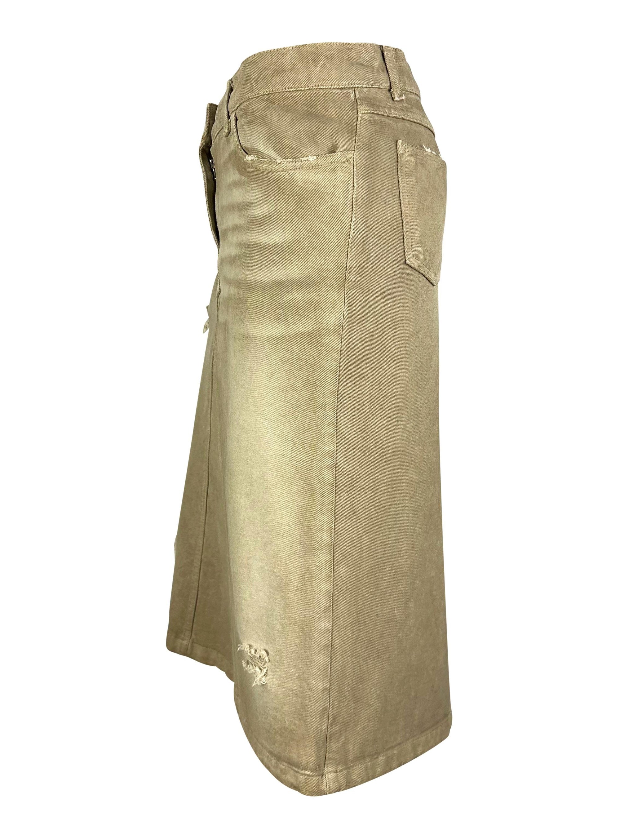 Presenting a fabulous beige distressed denim Dolce and Gabbana skirt. From the early 2000s, this vintage midi skirt is purposefully distressed and is constructed to look like reworked jeans. Add this chic skirt to your wardrobe!