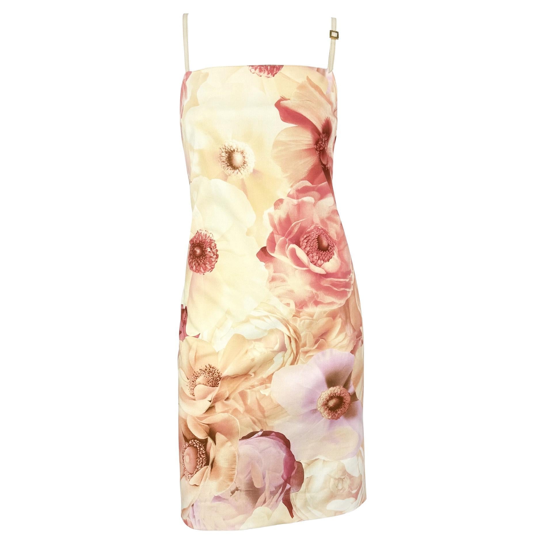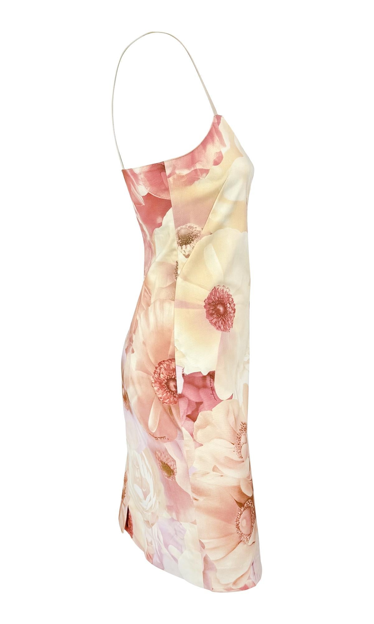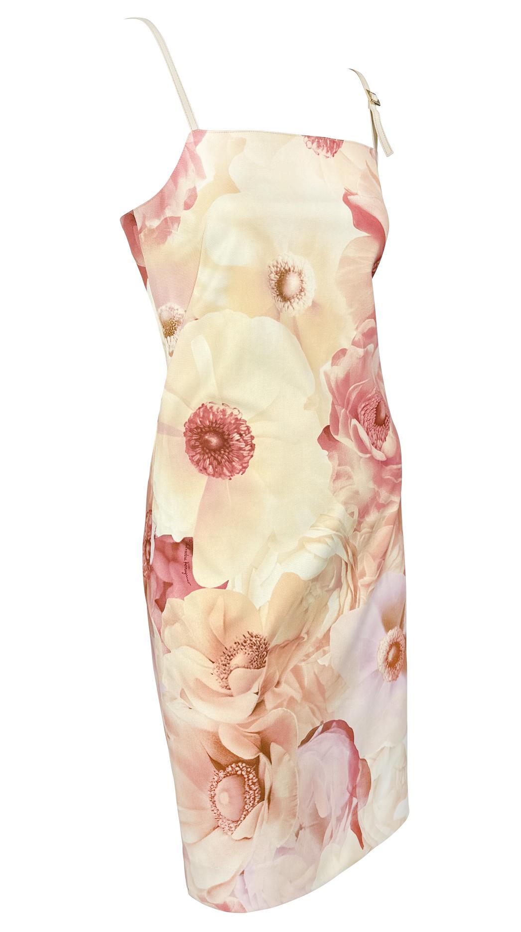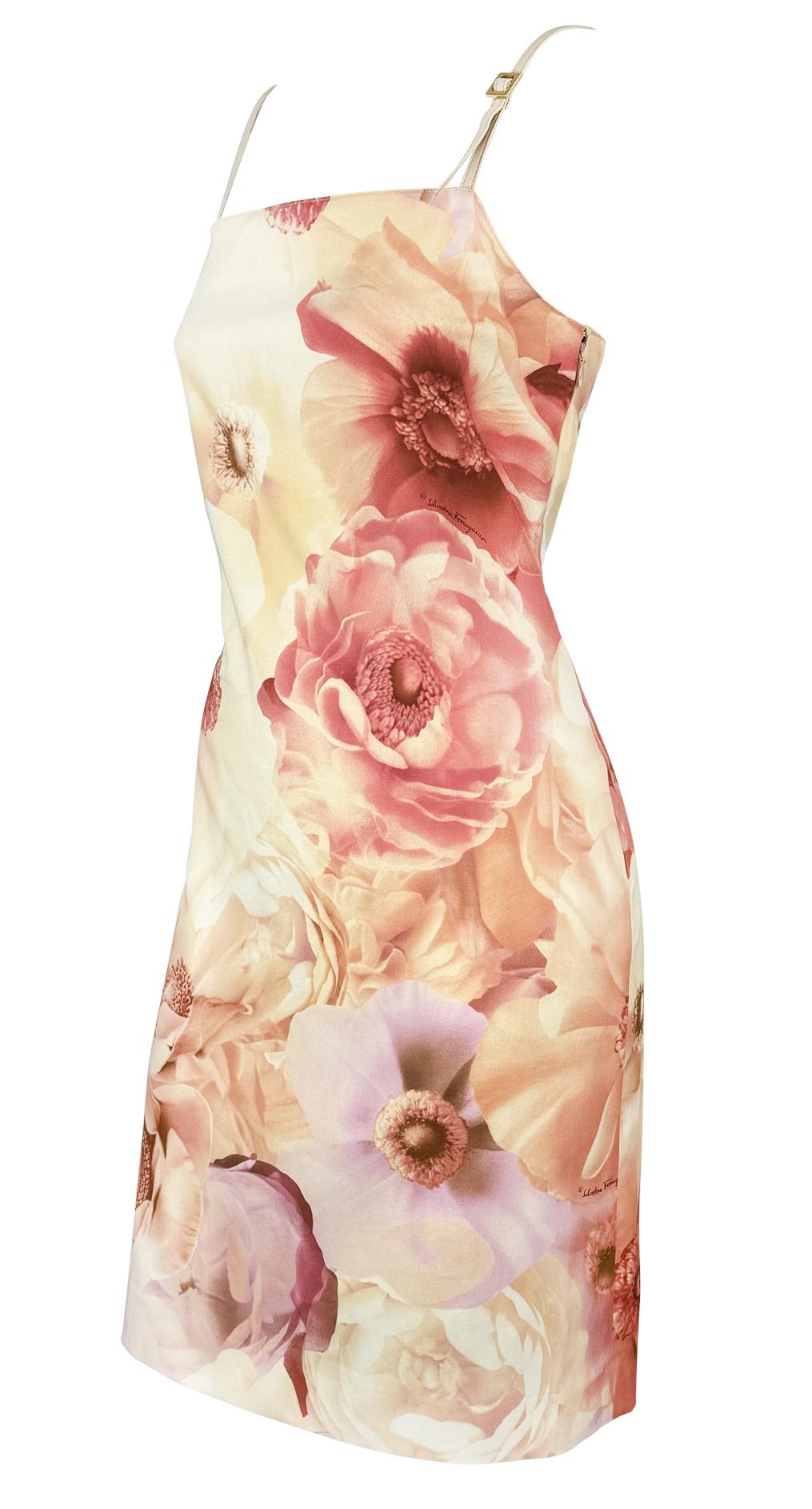 From the early 2000s, this Ferragamo cocktail dress features a painterly pink floral print on a soft fabric base with tan leather straps.