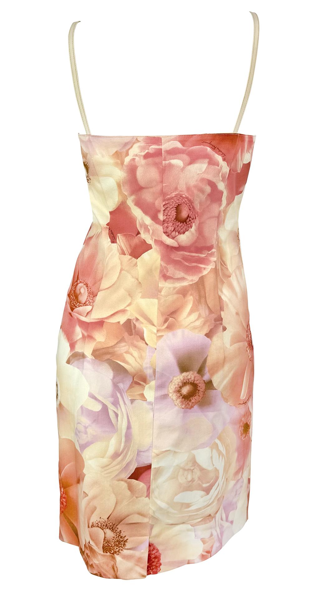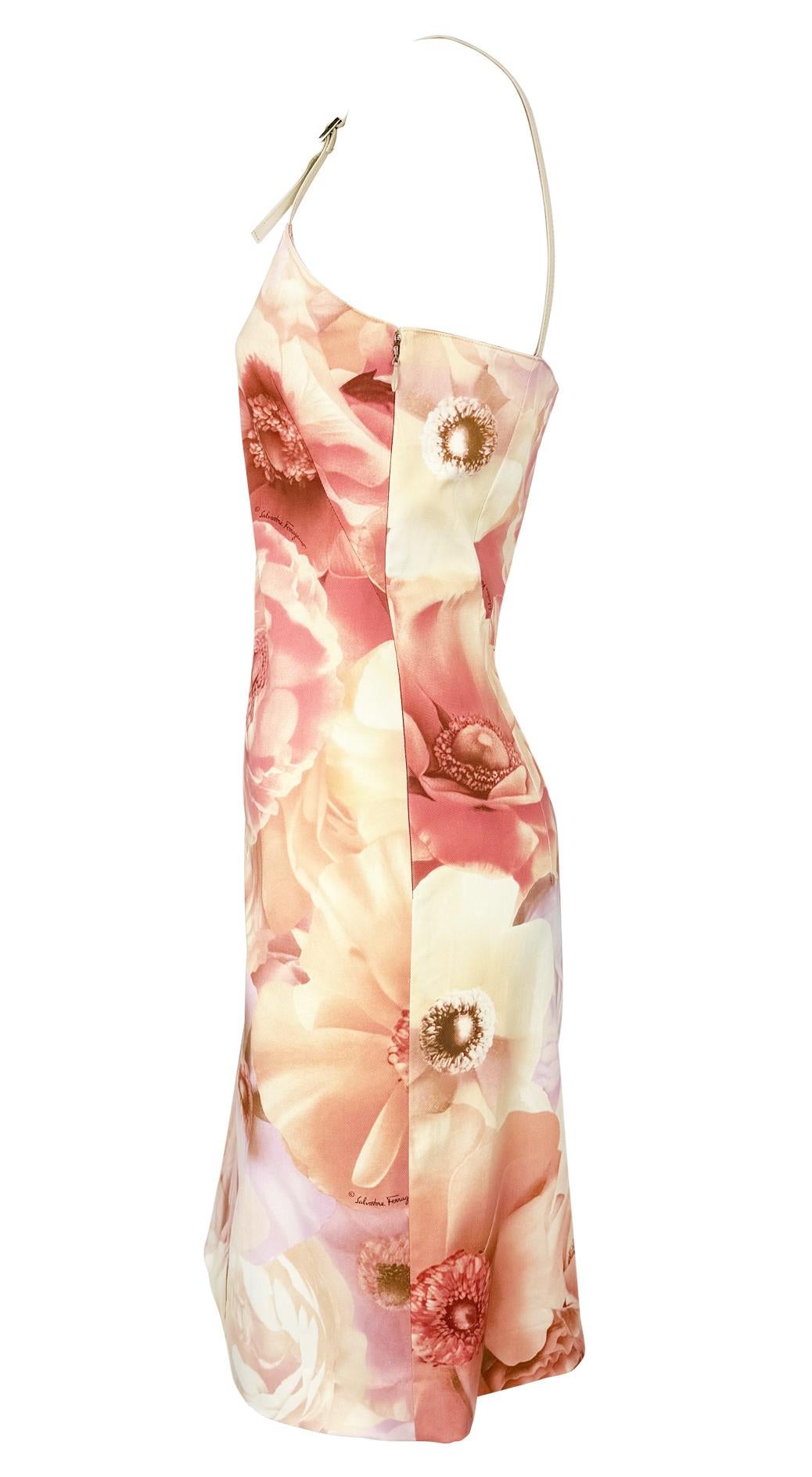 Early 2000s Ferragamo Pink Floral Print Tan Leather Strap Cocktail Dress