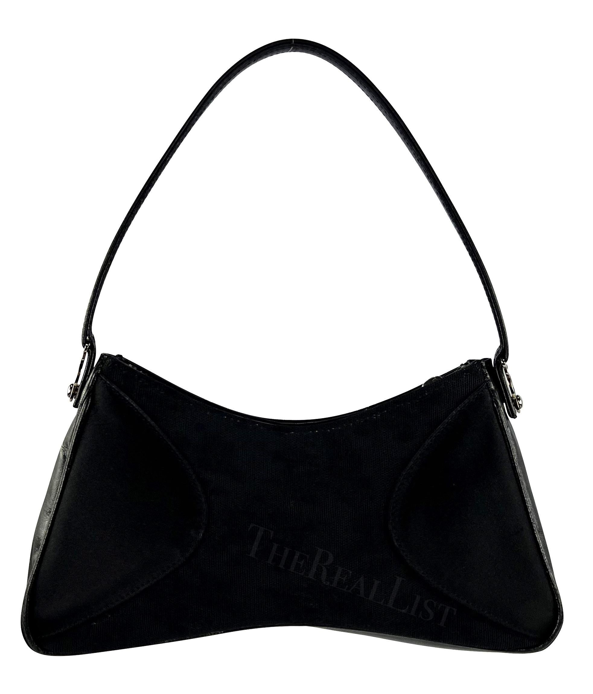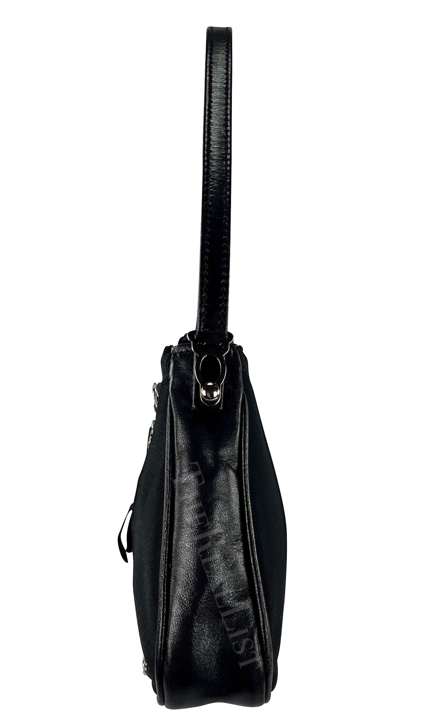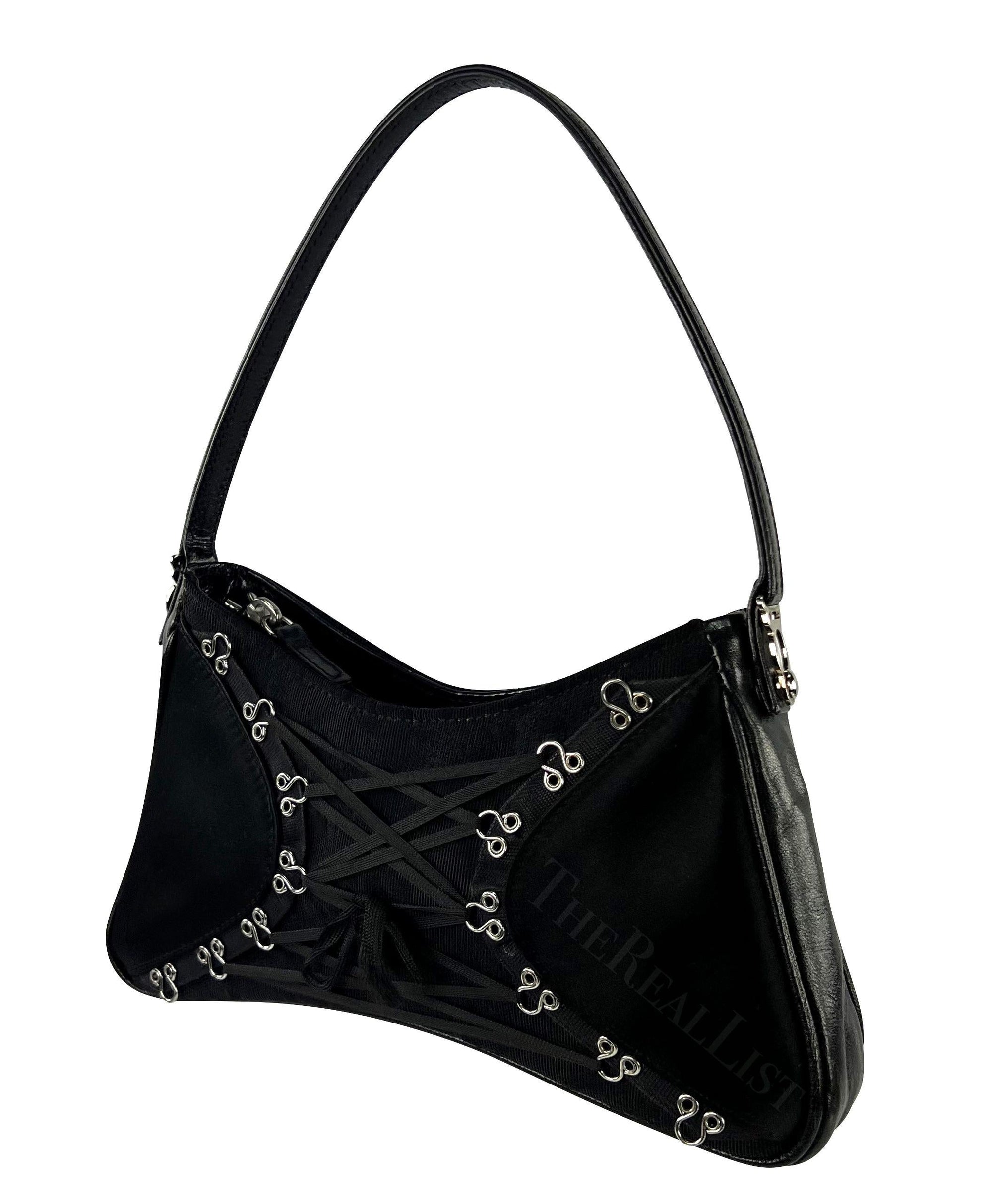 Presenting a stunning black satin John Galliano lace mini bag. A timeless piece from the early 2000s. This exquisite creation features a sleek black satin body adorned with luxurious black leather finishes. The silver-tone hardware, eyelets, and delicate lace detail reminiscent of a corset create an irresistible charm. Perfectly sized, this mini shoulder bag is a unique accessory that adds a touch of sophistication and sex appeal to any ensemble.