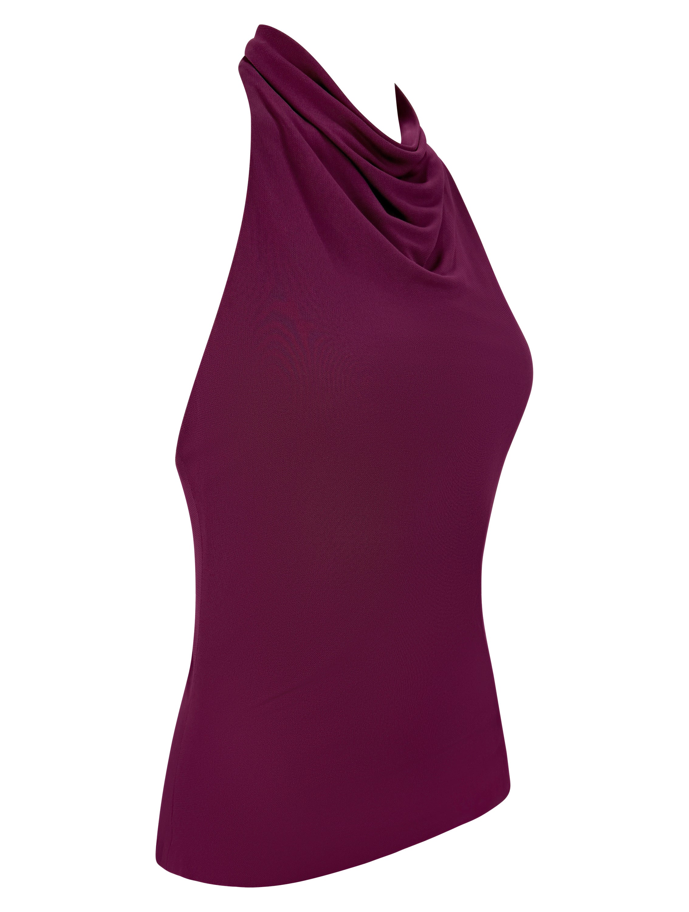 This Yigal Azrouël halter top from the early 2000s is crafted from stretch jersey in a rich burgundy tone. The minimalist silhouette features a draped cowl neckline, open back, and secure halter closure at the neck.