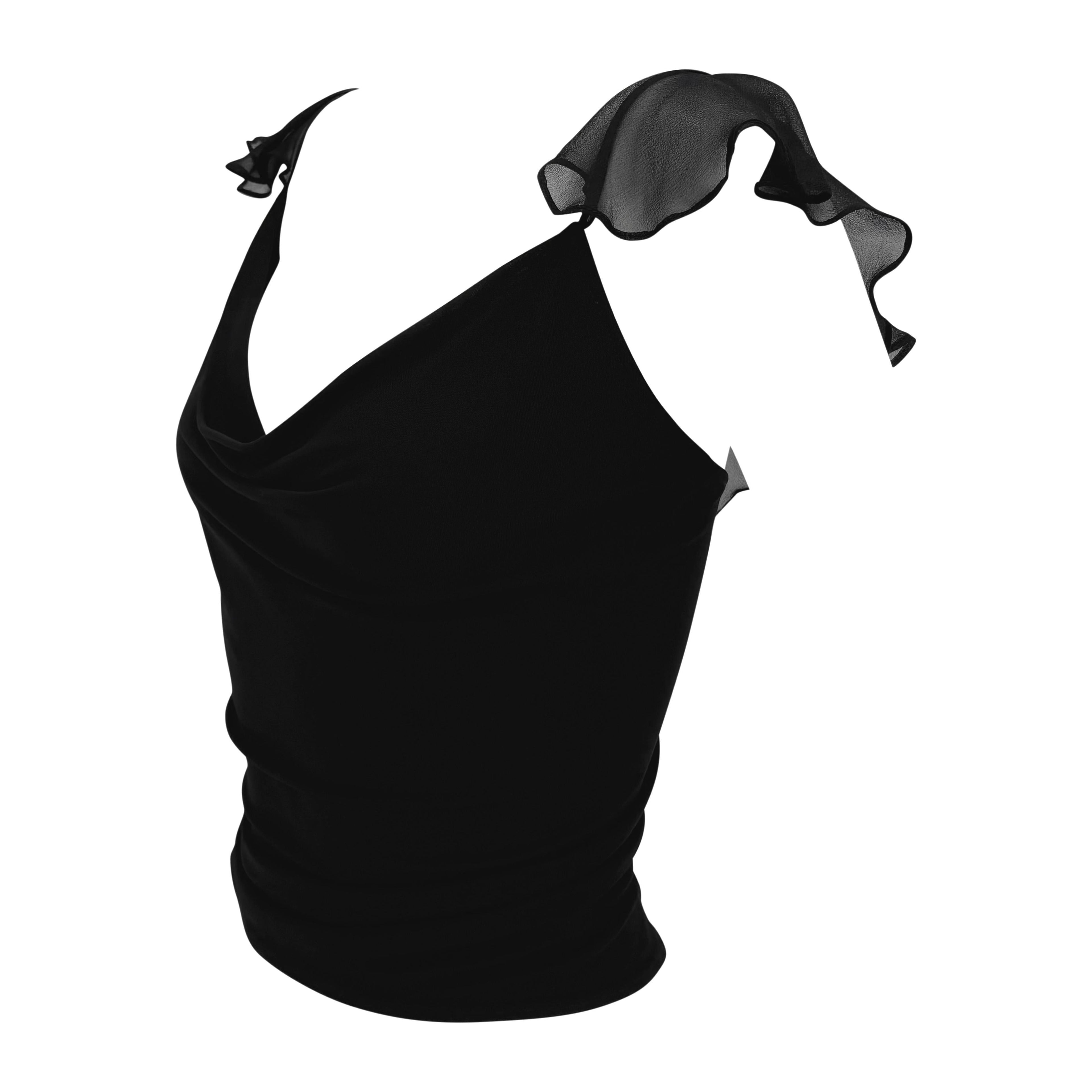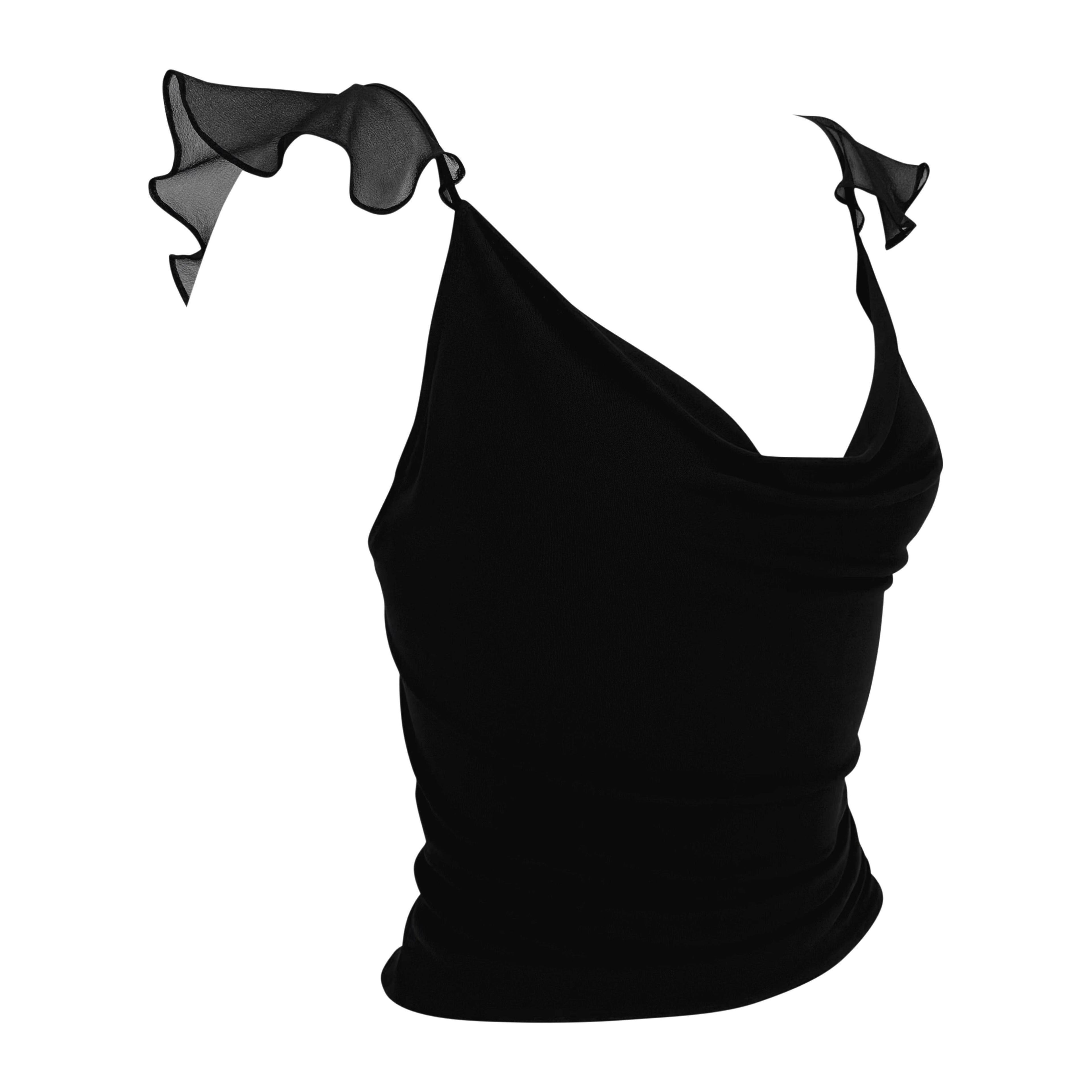 From the early 2000s, this Yigal Azrouël black stretch tank top features a soft cowl neckline and sheer silk chiffon ruffle-trimmed straps that extend into a dramatic open back.