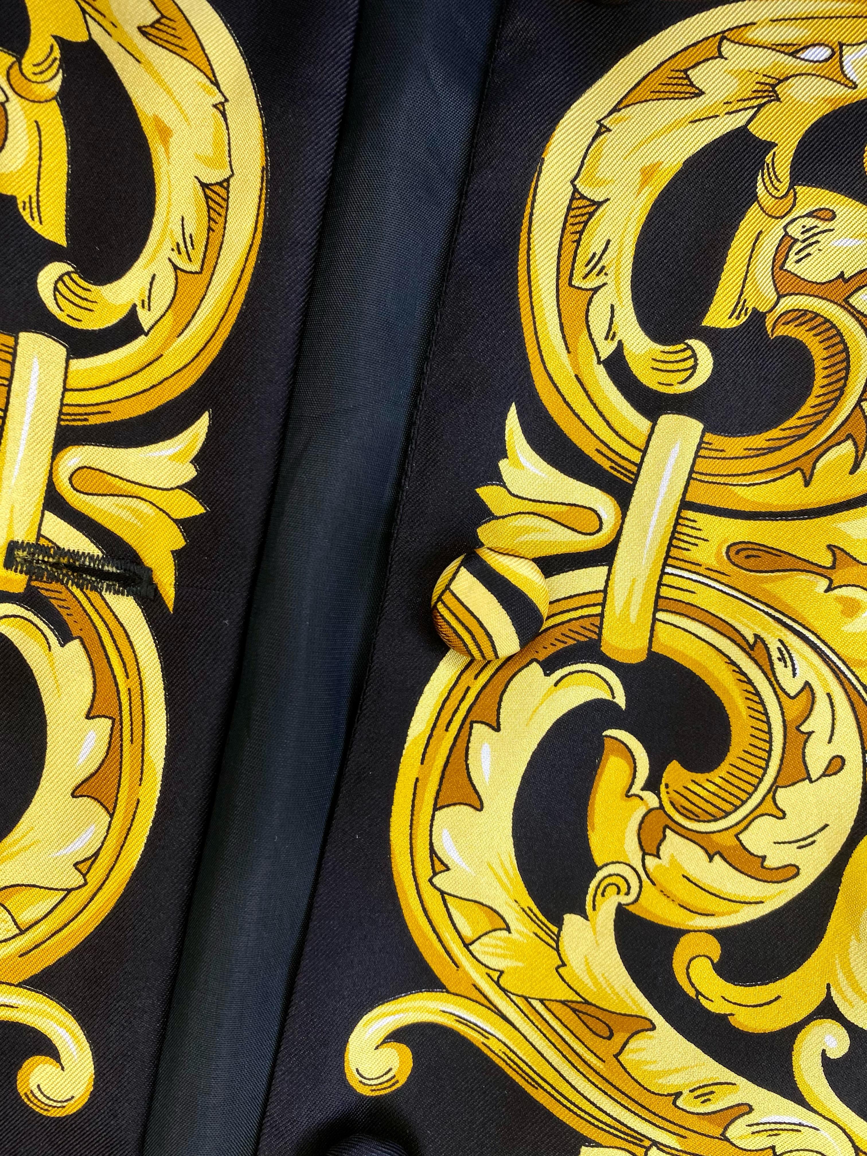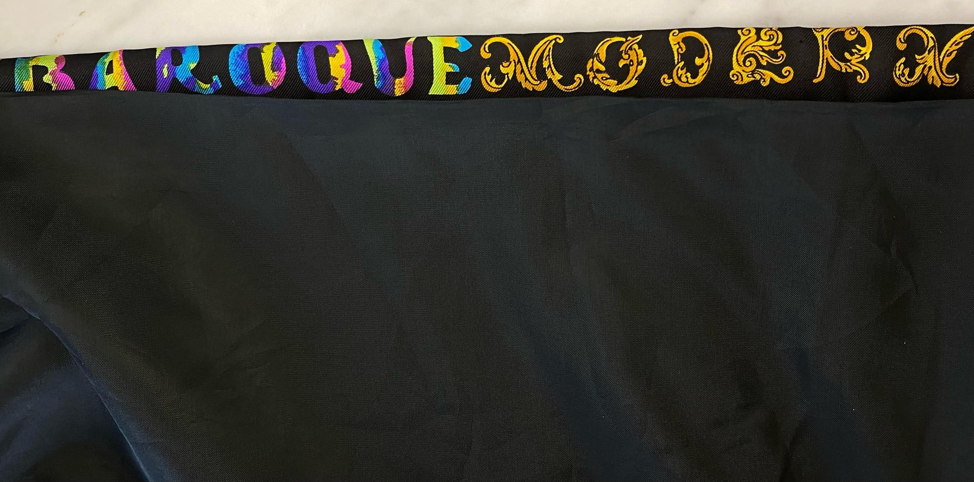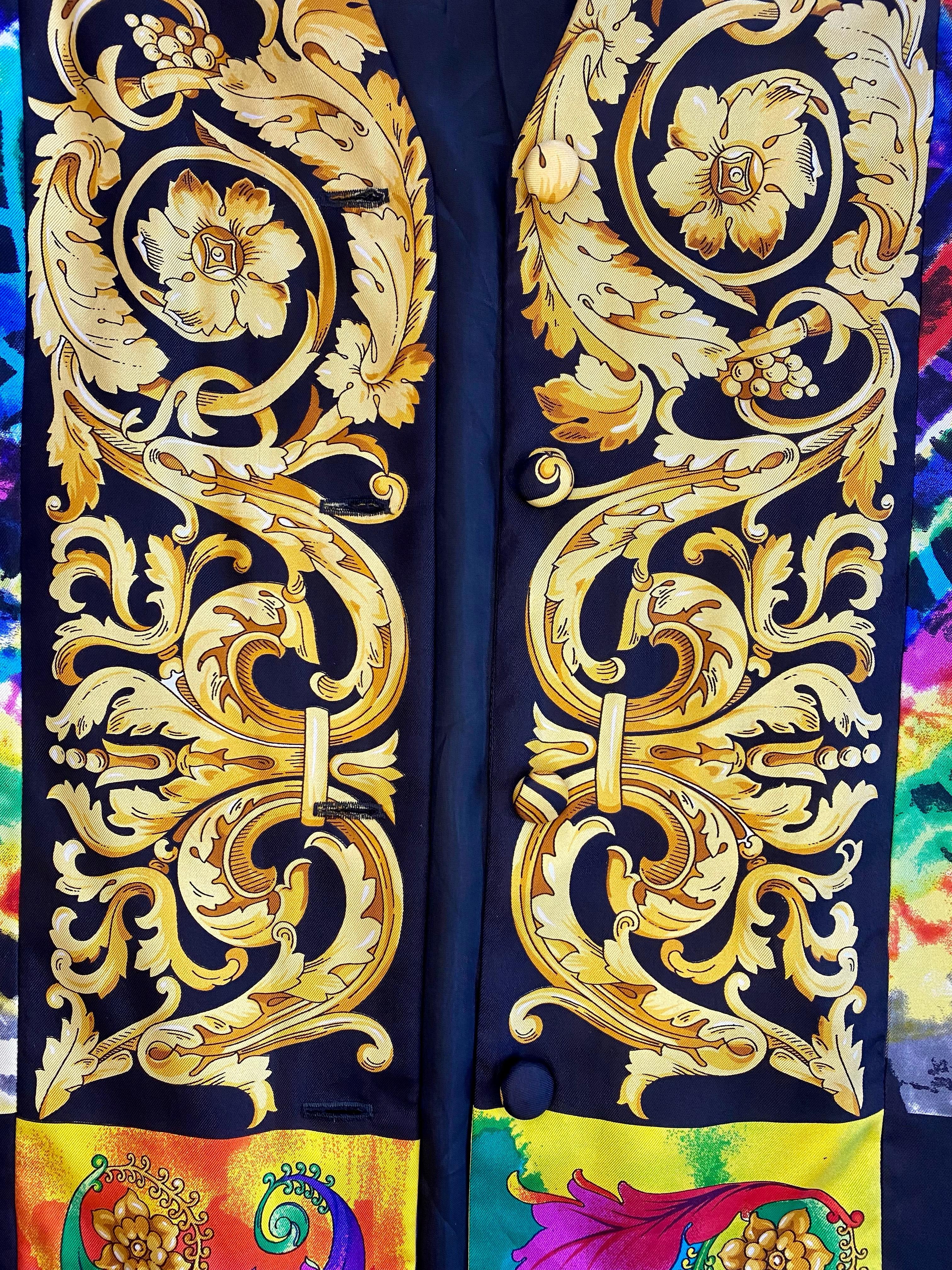 This Atelier Versace jacket, designed by Gianni Versace, combines the house’s iconic baroque motif with a distinctive tie-dye treatment. The piece features structured shoulders with lightly padded construction and front panels adorned in the signature black and gold baroque pattern. The remainder of the jacket is rendered in vibrant rainbow tie-dye, creating a striking contrast. A hidden detail beneath the lining reveals the printed phrase “modern baroque.” Rare and highly collectible, this jacket represents an exceptional example of Versace’s innovative design.