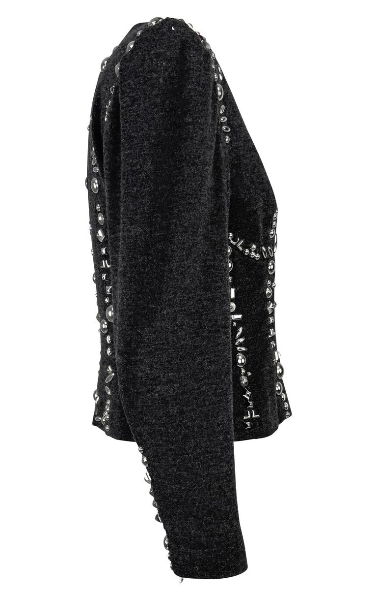 This Angelo Tarlazzi jacket from the Fall/Winter 1991 collection is crafted in charcoal grey wool and defined by its intricate stud embellishments. Silver-tone studs in varying shapes and sizes are arranged in symmetrical patterns across the front, back, and sleeves, creating a striking, jewel-like effect. Designed with a zip front, lightly padded shoulders, and zippered cuffs, the jacket combines clean tailoring with bold chrome embellishment. As worn on the runway by Cynthia Bailey.