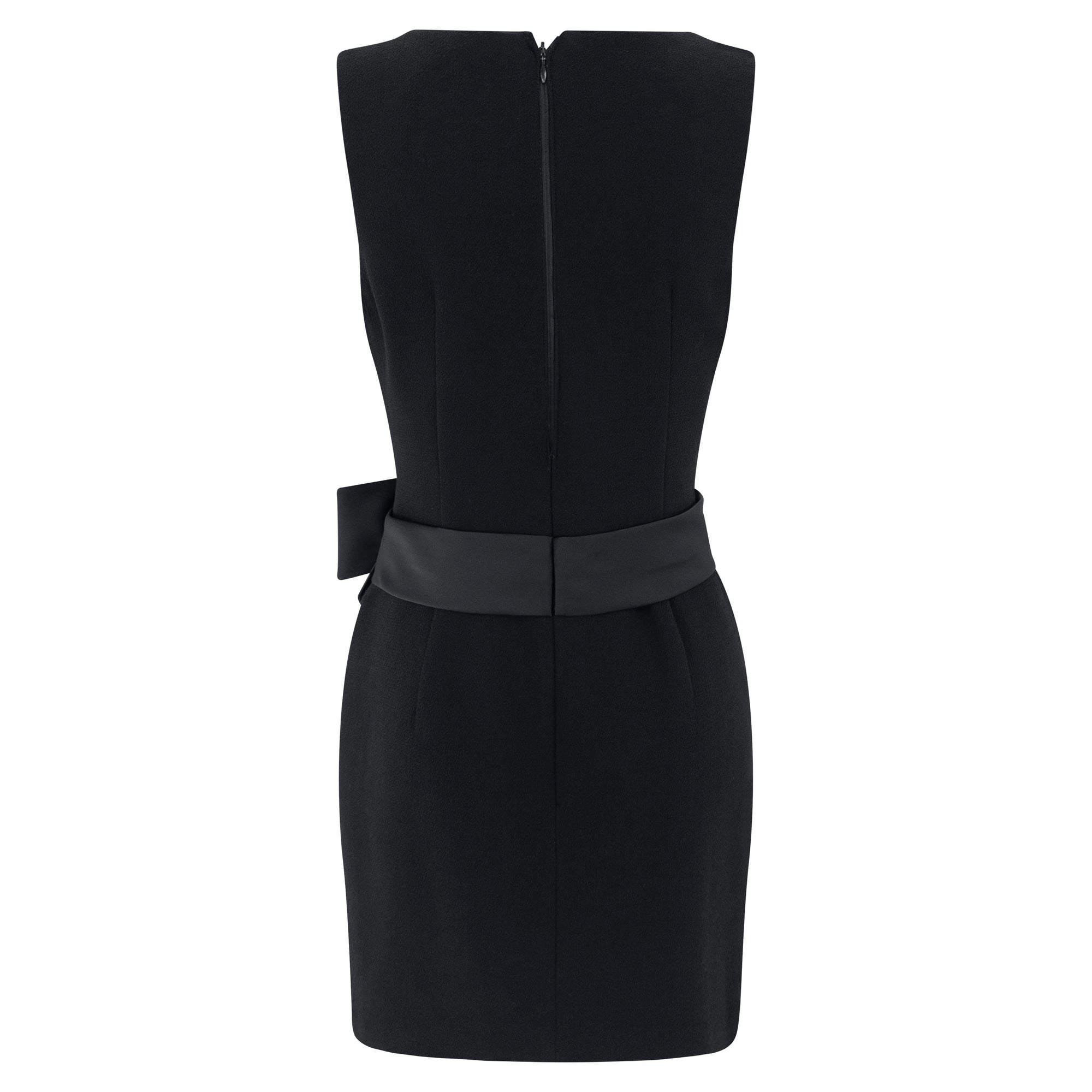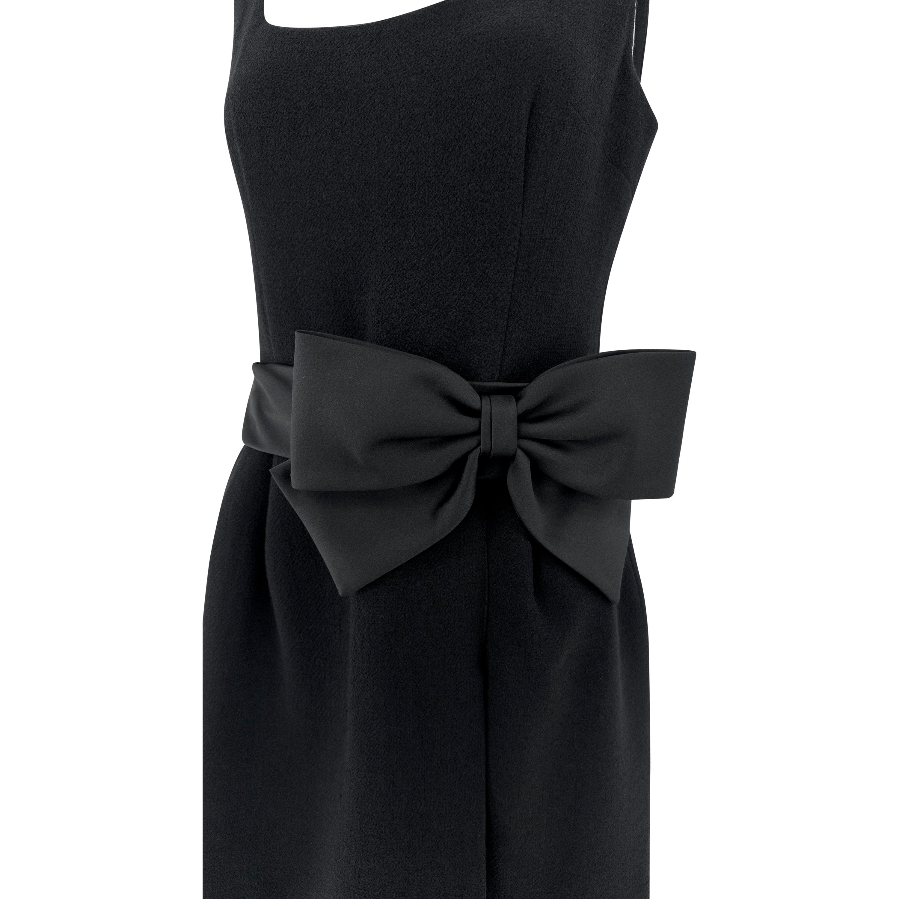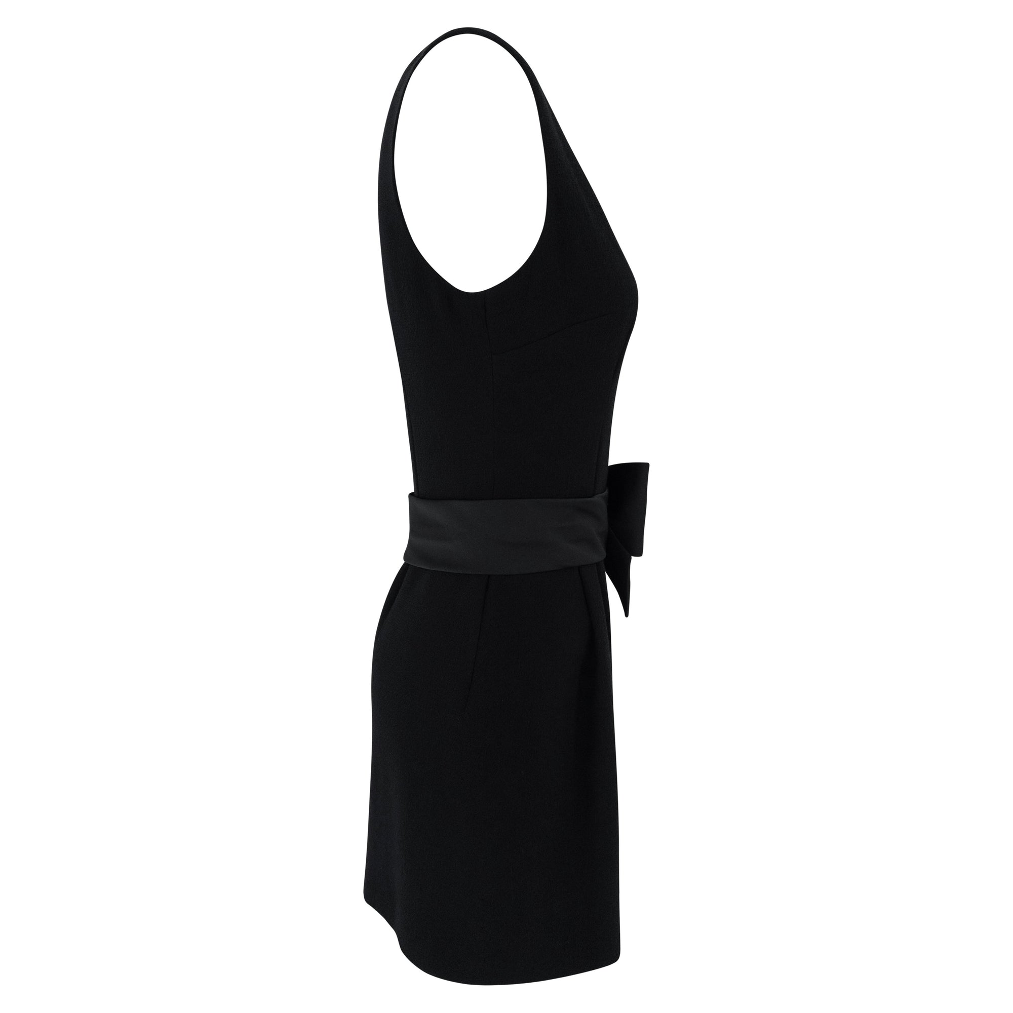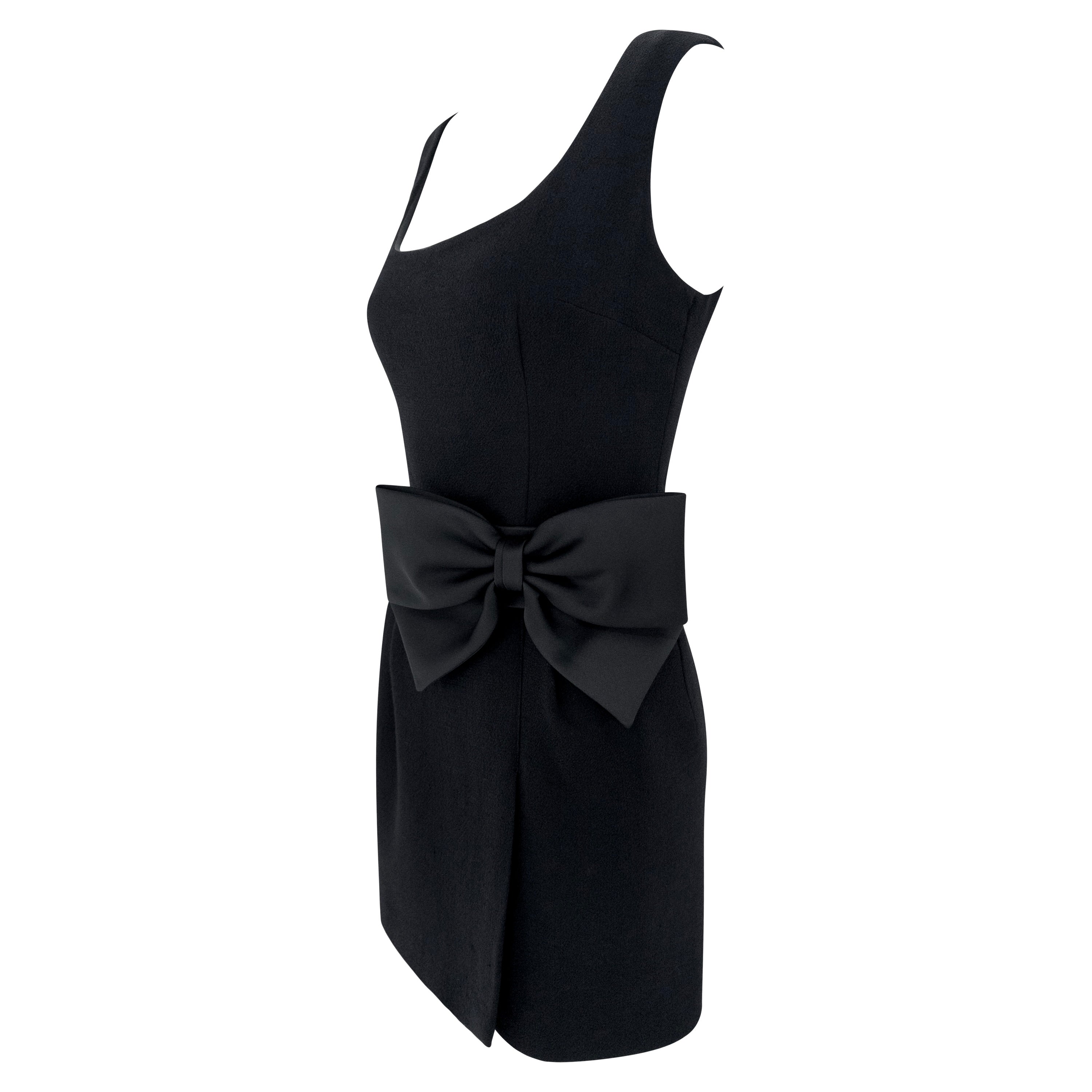 This Dolce & Gabbana sleeveless mini dress from the Fall/Winter 1995 collection is crafted in black wool. The design features a square neckline and a fitted silhouette, accented by a dramatic oversized satin bow at the waist. This design debuted on the season's runway.