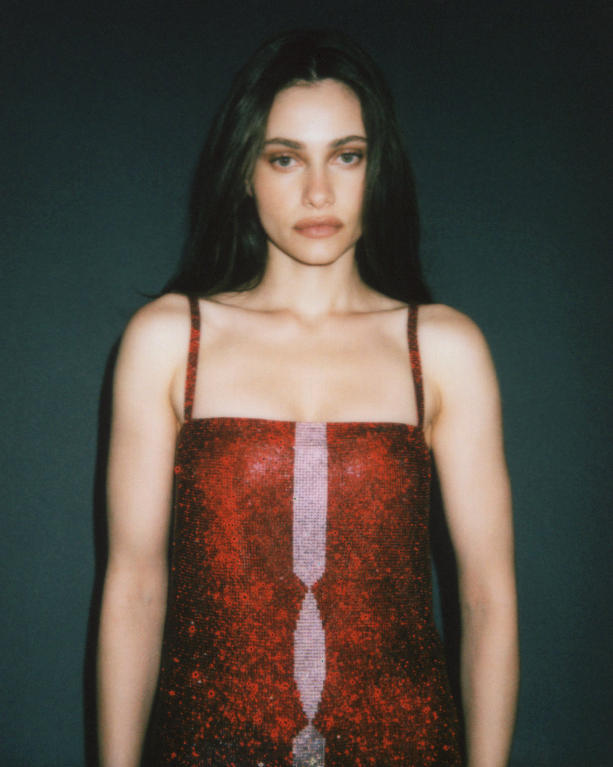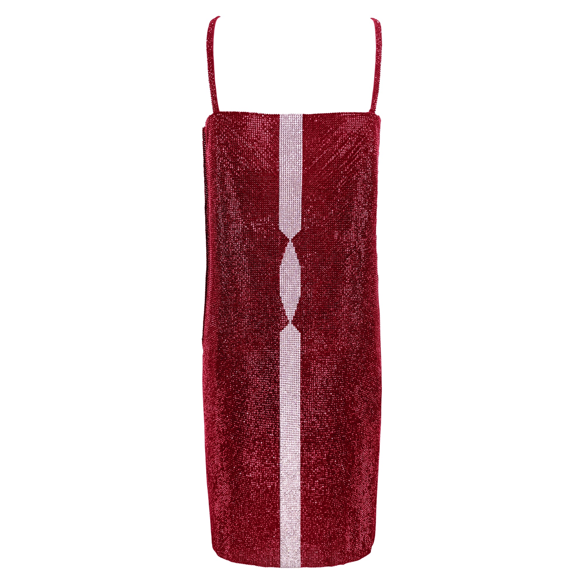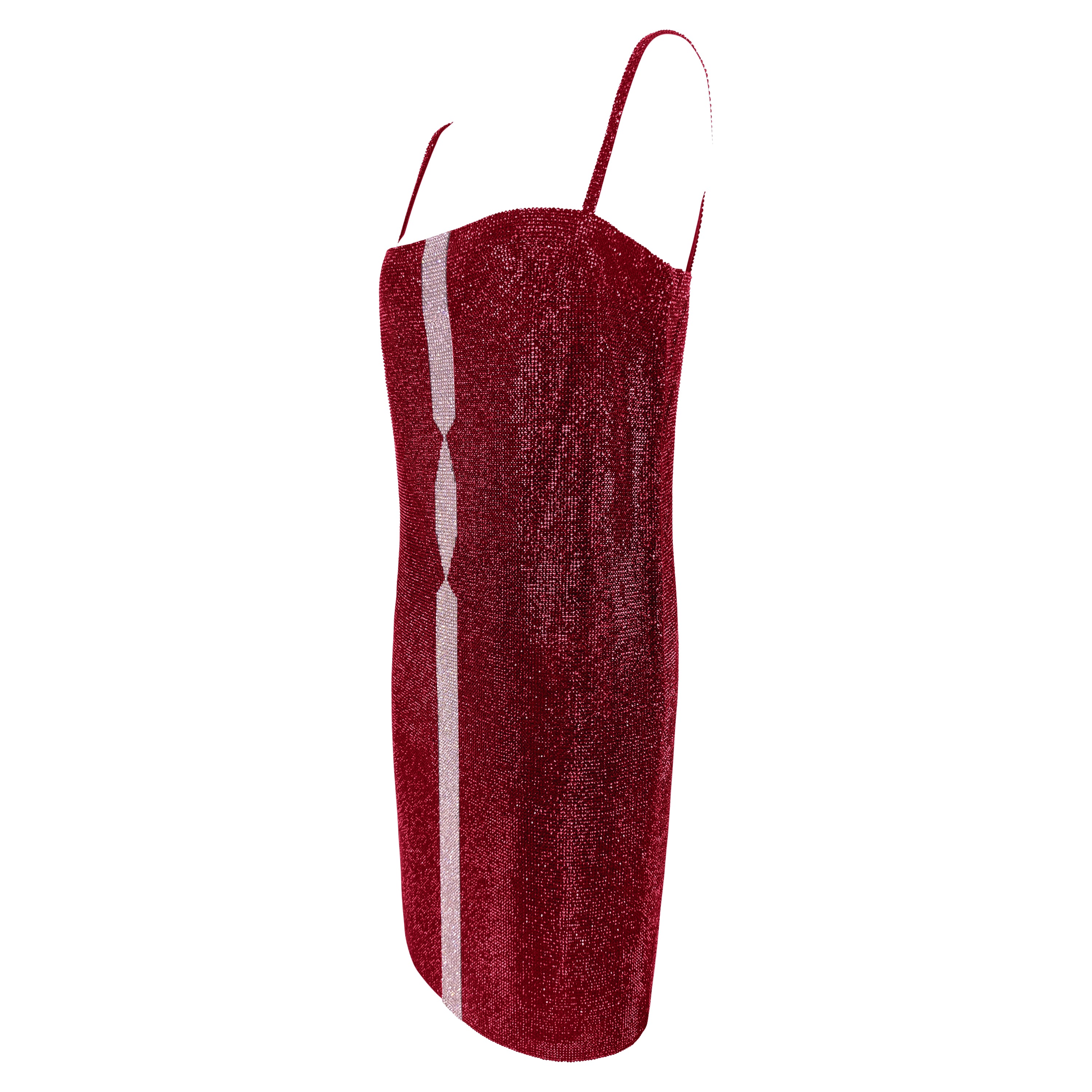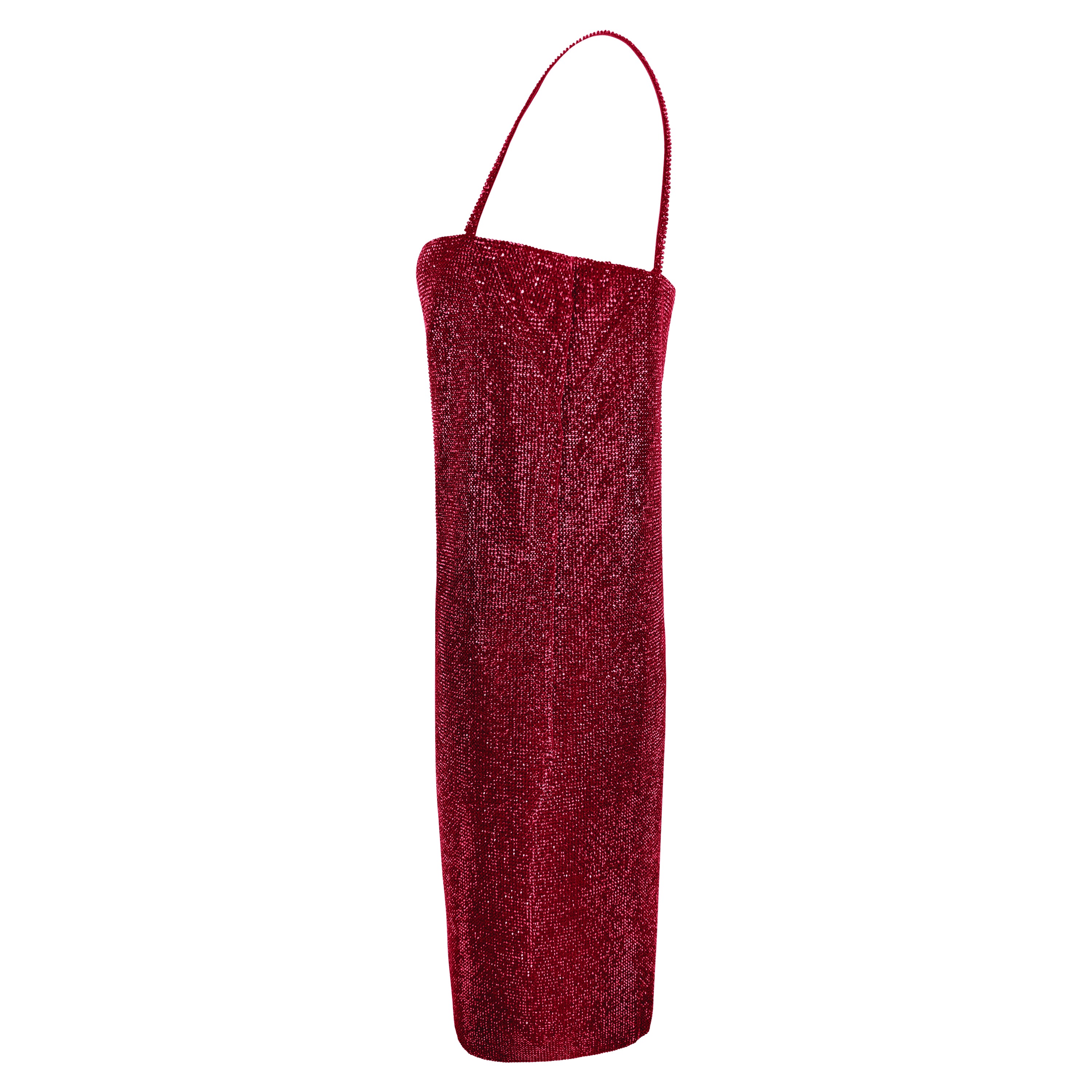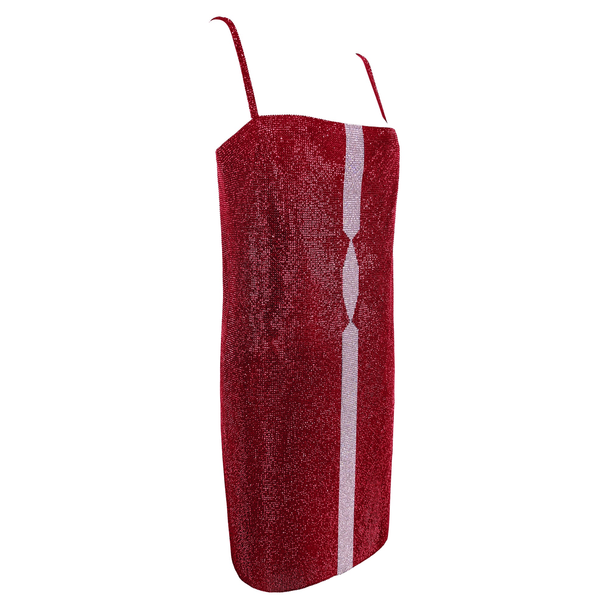 This Gianni Versace mini dress from the Fall/Winter 1997 collection is constructed from ruby red Swarovski crystal-encrusted black metal chainmail. The straight silhouette is detailed with a contrasting vertical pink crystal stripe down the front, creating a geometric focal point. Featuring delicate shoulder straps and a square neckline, the piece embodies Versace’s mastery of sensual design. The design debuted on Gianni's final ready-to-wear runway presentation in multiple variations and is complete with the original brand tags.
