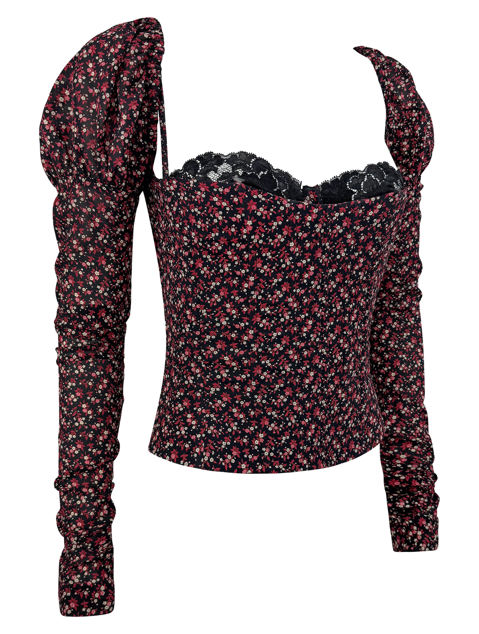 This Dolce & Gabbana top from the Fall/Winter 2001 collection is crafted in black lace with a red floral print and features an internal corset structure with boning throughout. The long-sleeve silhouette includes ruched arms, a sweetheart neckline trimmed with scalloped lace, and a built-in underwire bra. Finished with a deep V-back and exposed zip closure. Worn by Gisele Bündchen as Look 46 on the season's runway and in the ad campaign, captured by Steven Meisel.