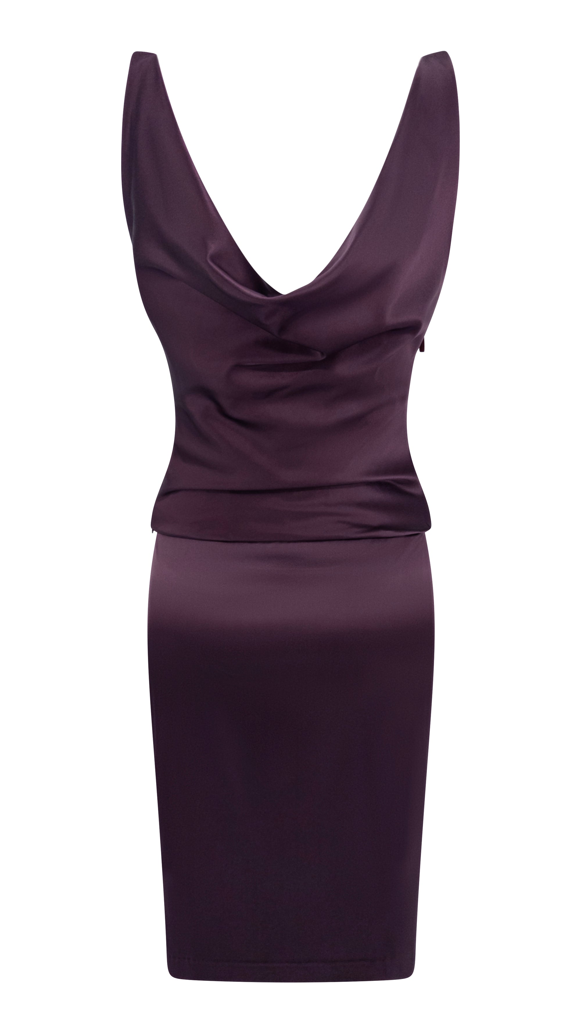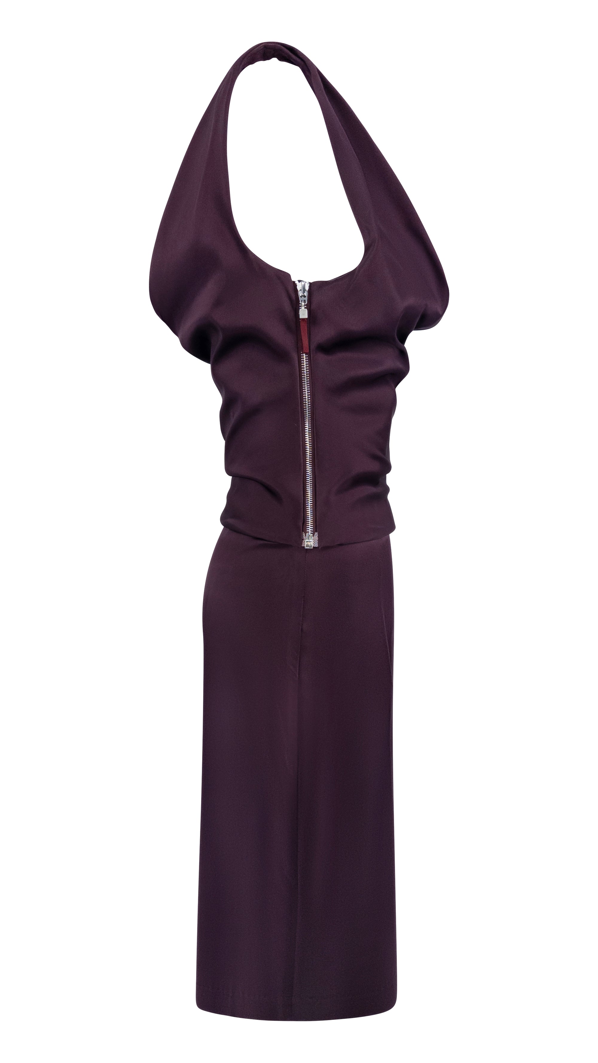 From Stella McCartney’s Fall/Winter 2003 collection, this burgundy cocktail dress is crafted from stretch satin with a soft sheen. The bodice features a dramatic cowl neckline and internal corset for support and shape. A zip accent runs along both sides of the bodice, while the skirt falls into a sleek, pencil silhouette that hits mid-calf. Modeled on the season's runway in an alternate colorway by Mor Katzir.