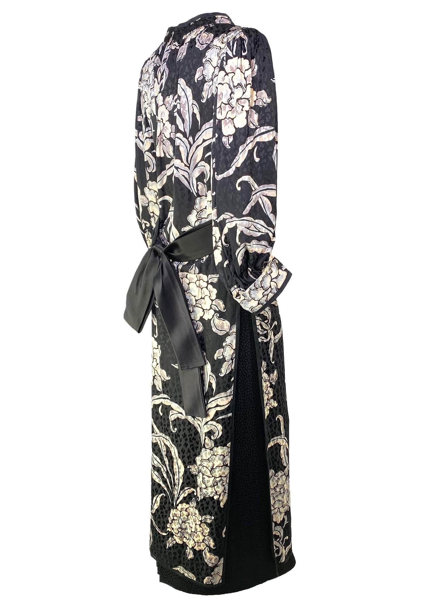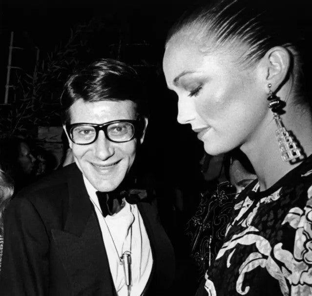 This dress, designed by Yves Saint Laurent, is a documented piece from his seminal “Les Chinoises” or “Opium Couture” collection, Fall/Winter 1977 Haute Couture. A Cheongsam-inspired belted dress from the collection debuted on the runway in July 1977 and appears in Saint Laurent’s original archival sketches, now preserved at the Musée Yves Saint Laurent in Marrakesh. The collection coincided with the launch of the house’s Opium fragrance and presented Saint Laurent’s romantic reinterpretation of Chinese design elements. Marino Schiano, one of the designer’s muses, wore a similar ensemble to the Opium fragrance launch on September 20, 1978, held aboard the historic Peking ship at the South Street Seaport Museum in New York. Related works from this collection were later highlighted in the Metropolitan Museum of Art’s Costume Institute exhibition China: Through the Looking Glass (2015), in collaboration with the Department of Asian Art. This historically significant collection has also served as a touchstone for later YSL creative directors, from Tom Ford to Stefano Pilati. Rarely available on the market, this set represents a museum-worthy example of Saint Laurent’s defining work.