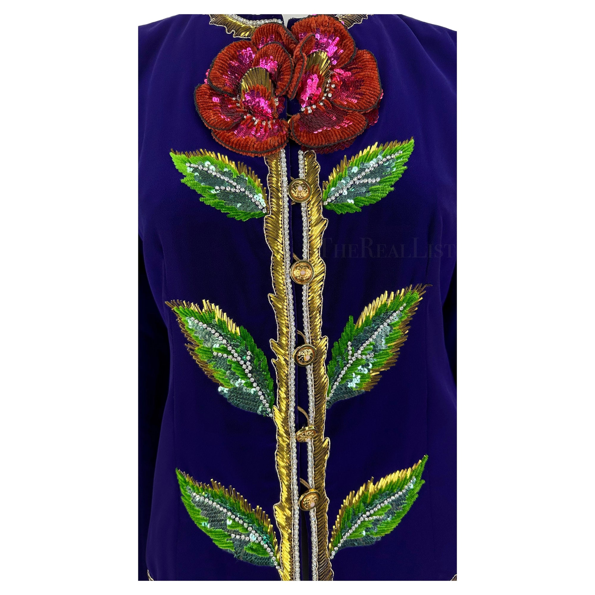 This extraordinary Yves Saint Laurent Haute Couture evening jacket from the Fall/Winter 1978 collection exemplifies the designer’s reverence for both artistry and history. Handcrafted in sumptuous deep purple velvet, the jacket features an opulent three-dimensional floral embellishment at the front, accented with delicate gold-tone metal ribbon and rhinestone trim.