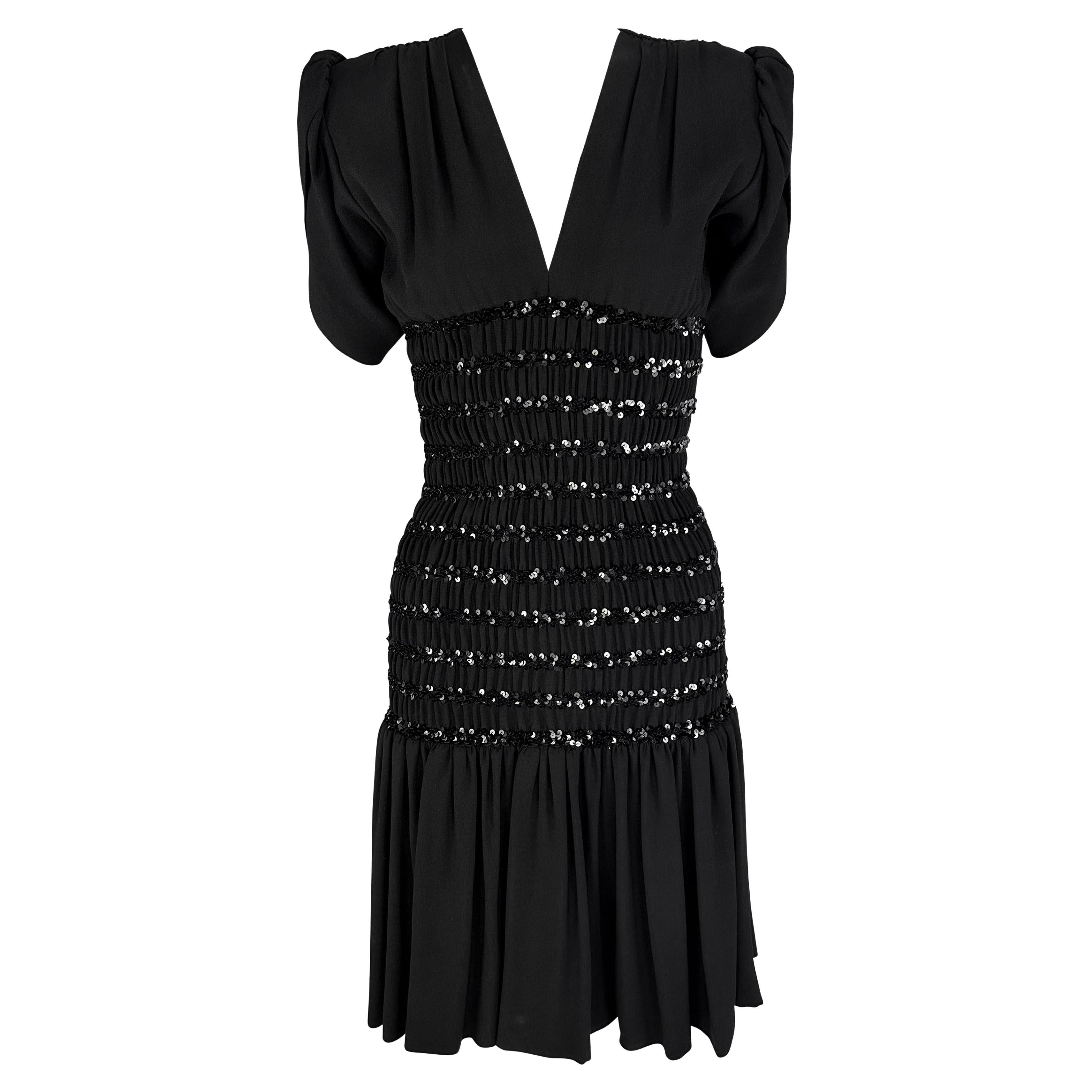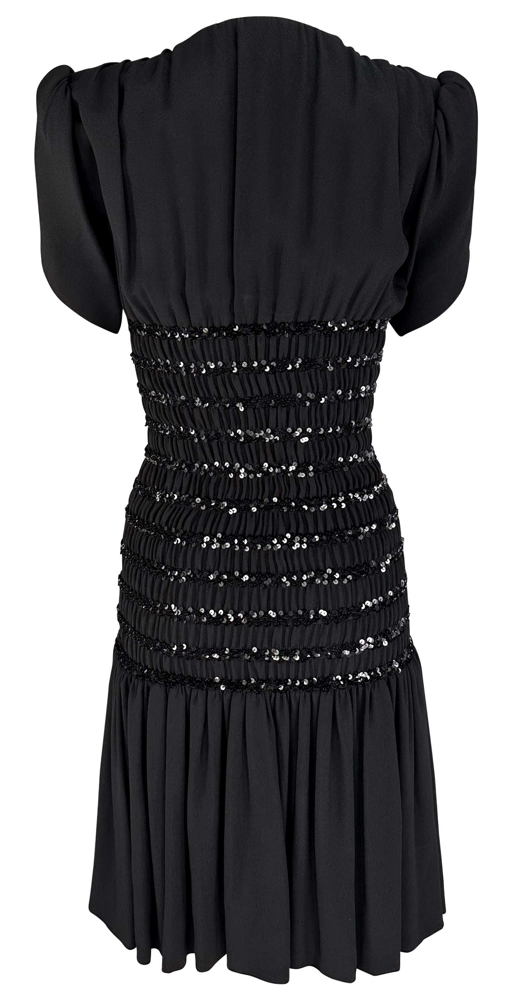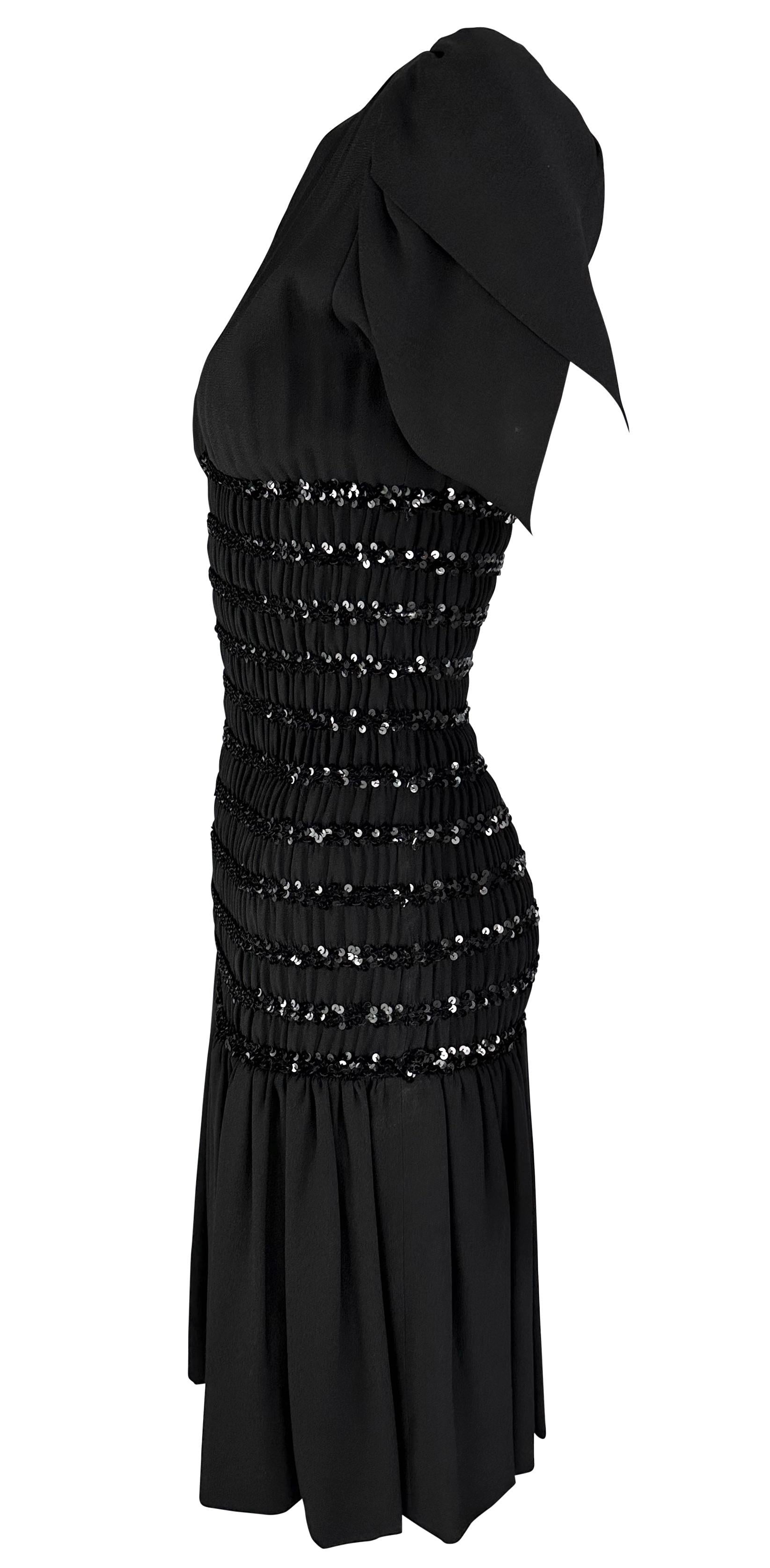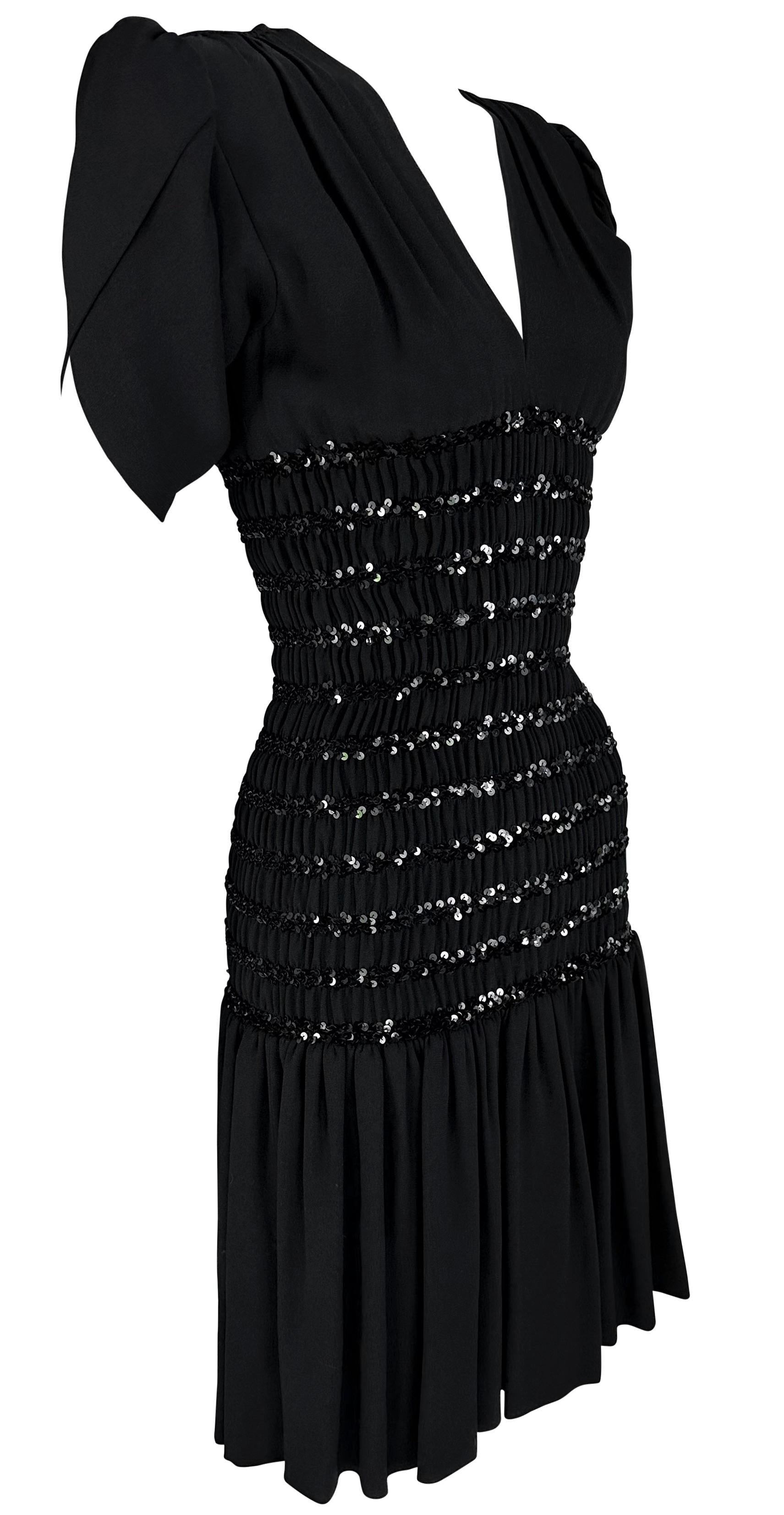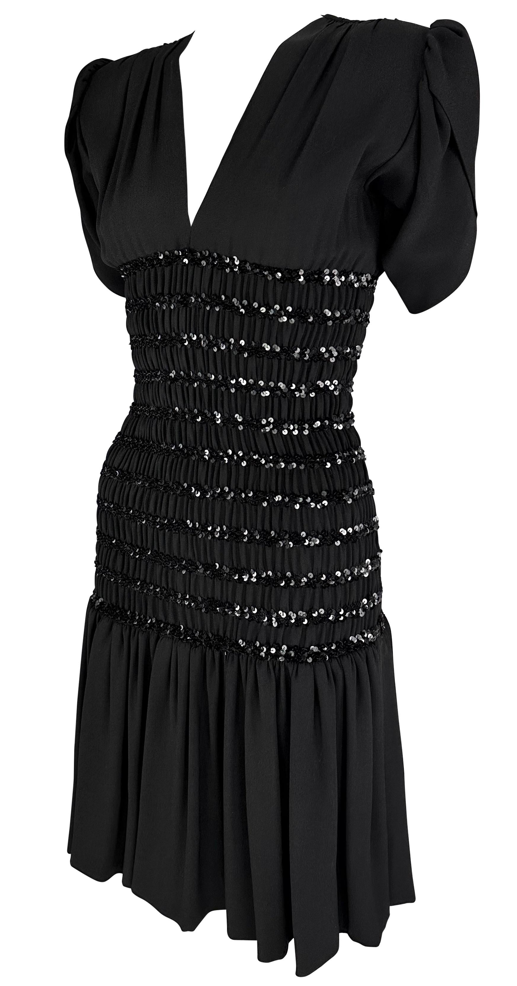 From the Fall/Winter 1983 collection, this fabulous black Saint Laurent Rive Gauche ruched dress, designed by Yves Saint Laurent was highlighted in the season's ad campaign, captured by Helmut Newton in Venice. Shoulder pads, deep V-plunging neckline, short petal sleeves, and a pleated skirt add flirty appeal to this chic dress. The dress is complete with a stretch ruching around the waist highlighted with rows of black sequins. Timeless, this Saint Laurent Rive Gauche dress is the perfect addition to any refined wardrobe!