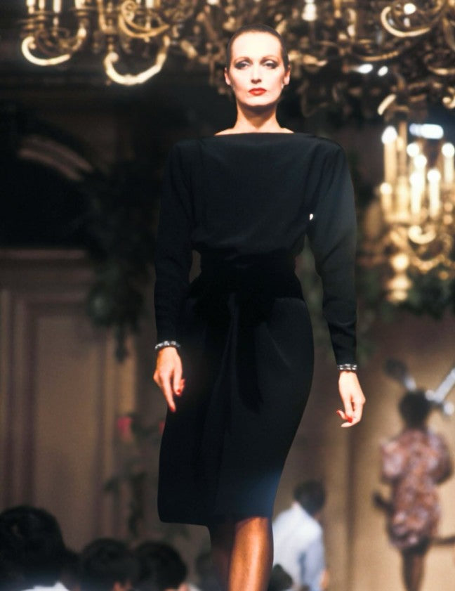 F/W 1983 Yves Saint Laurent Haute Couture Runway Black Velvet Bow Midi Dress