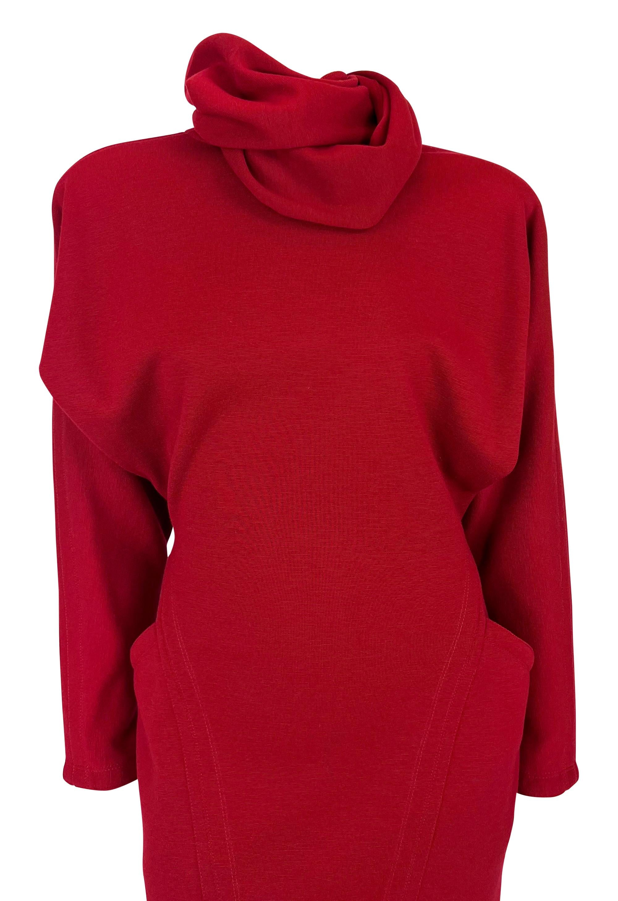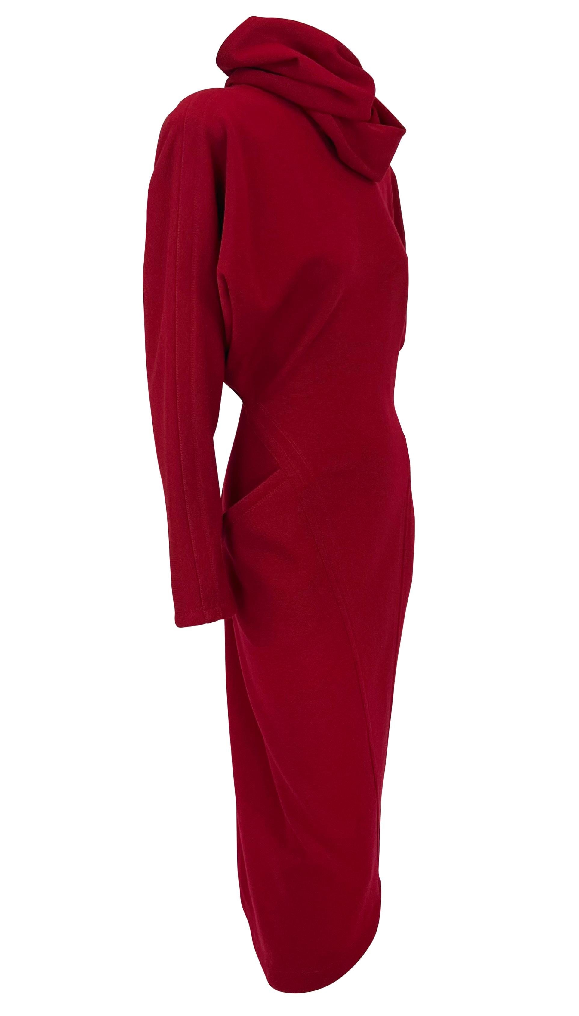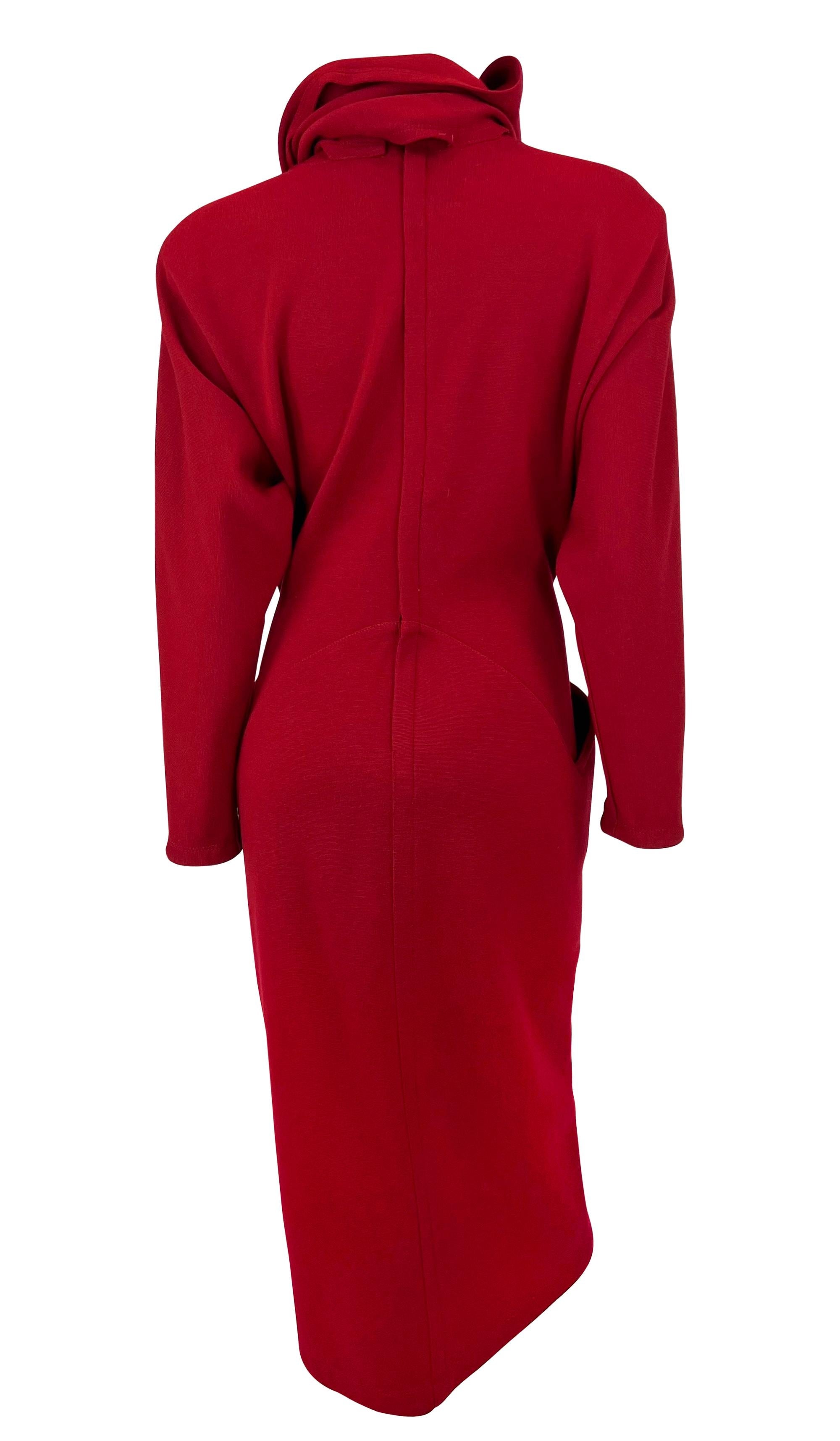 This Gianni Versace red bodycon knit wool scarf dress is from the Fall/Winter 1984 collection. Designed with a sleek, long-sleeve silhouette, it features an integrated draped scarf detail at the neckline. This piece was highlighted in the season's ad campaign, worn by Talisa Soto and captured by Richard Avedon.