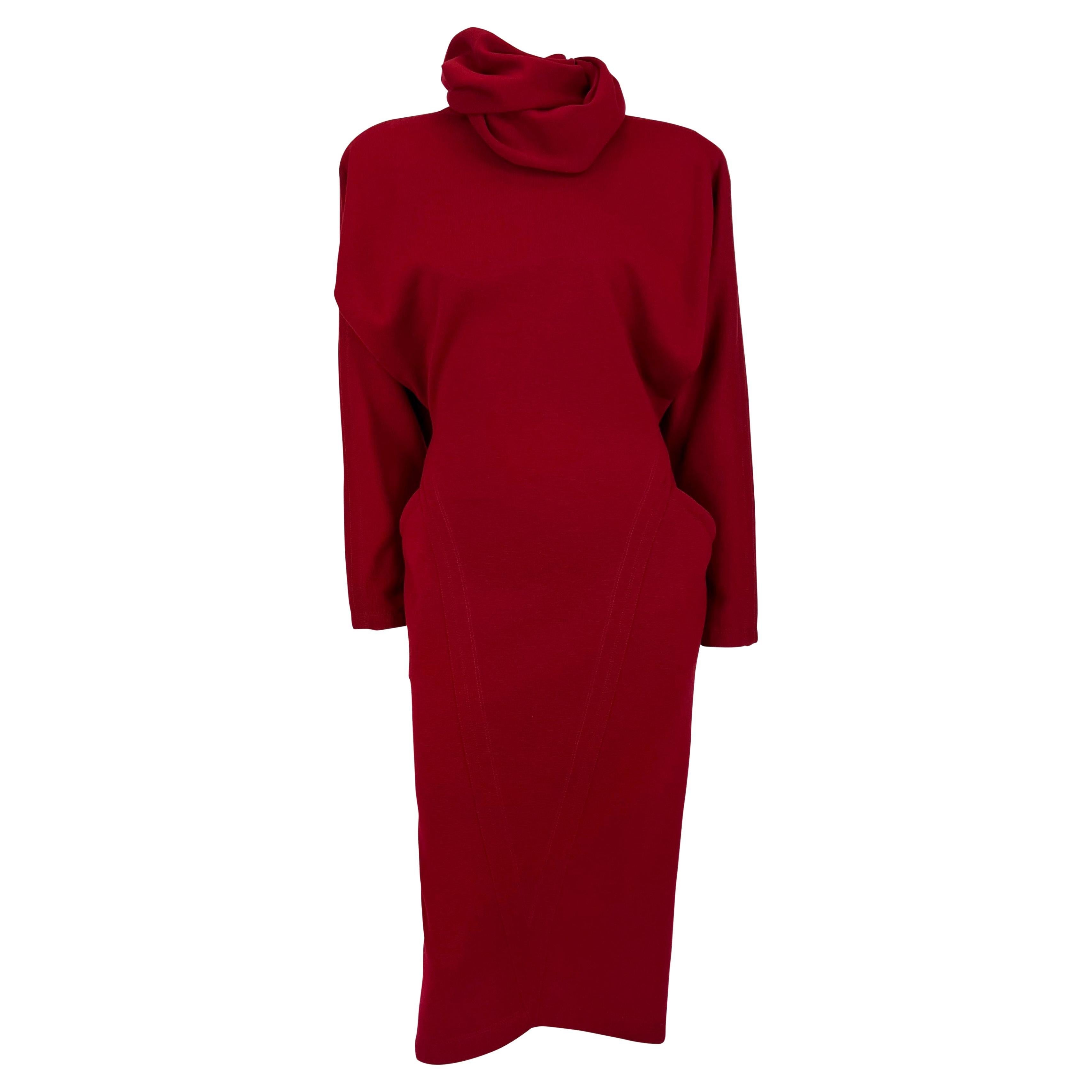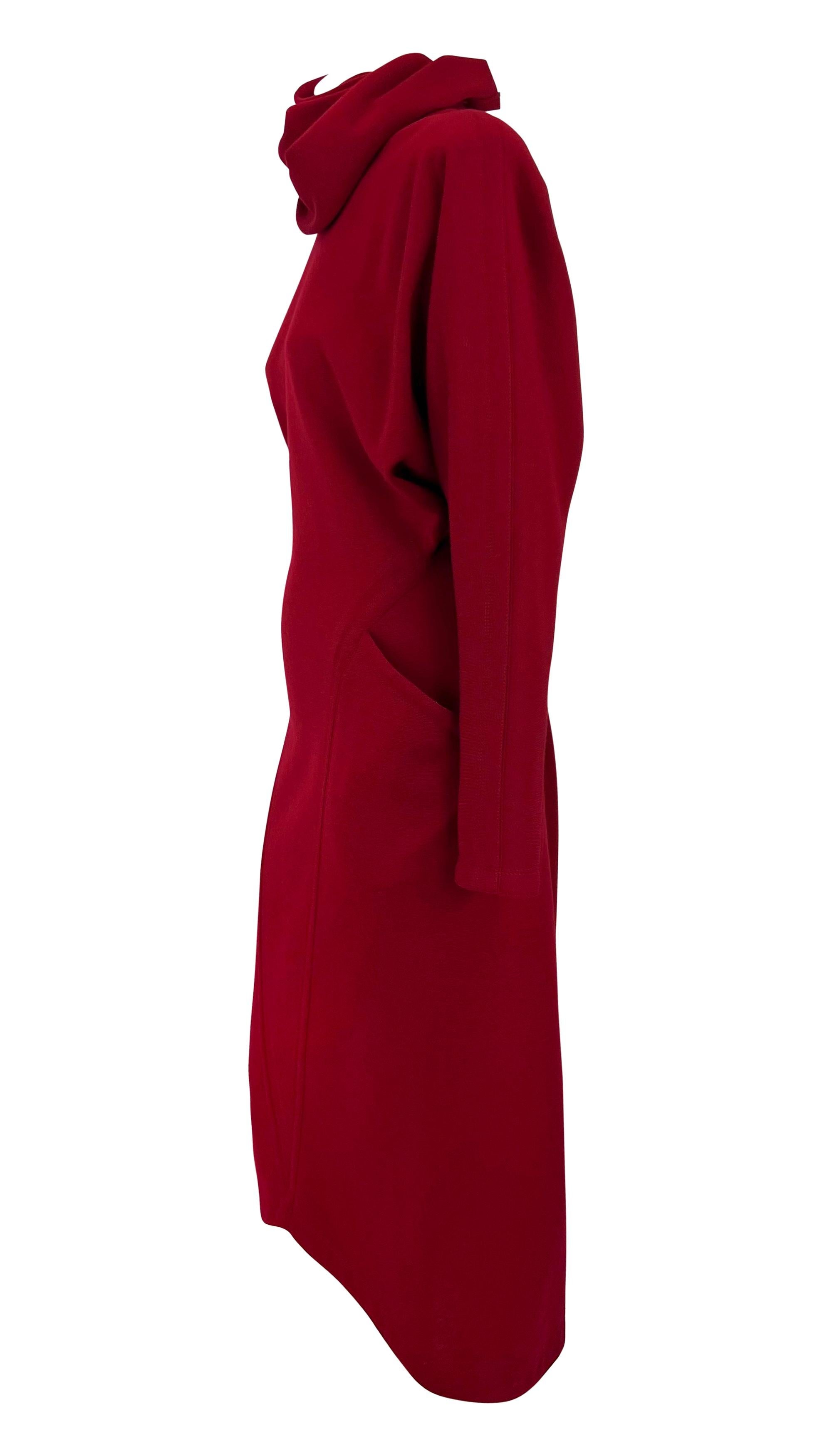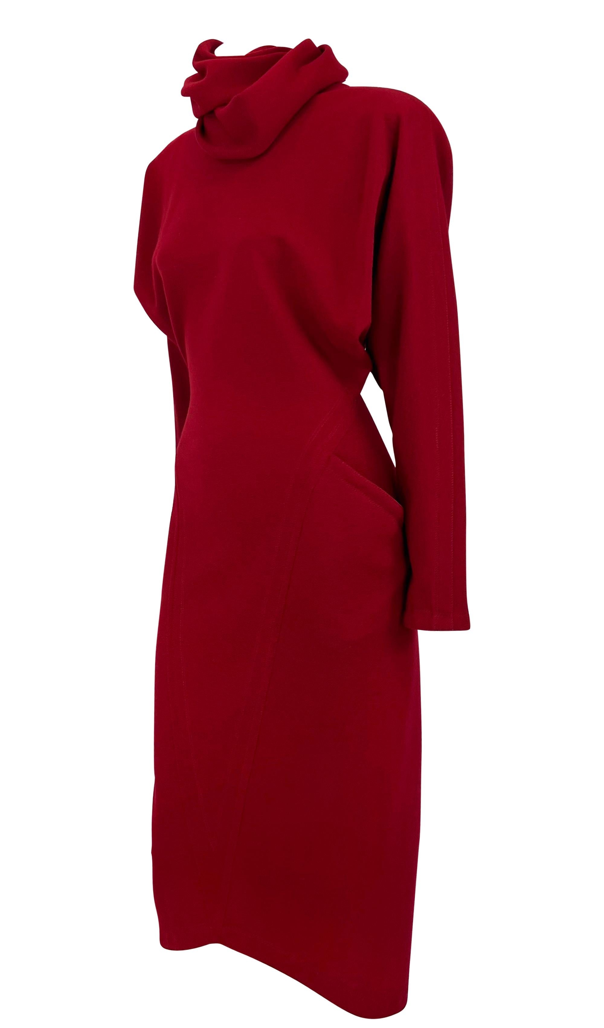 This Gianni Versace red bodycon knit wool scarf dress is from the Fall/Winter 1984 collection. Designed with a sleek, long-sleeve silhouette, it features an integrated draped scarf detail at the neckline. This piece was highlighted in the season's ad campaign, worn by Talisa Soto and captured by Richard Avedon.