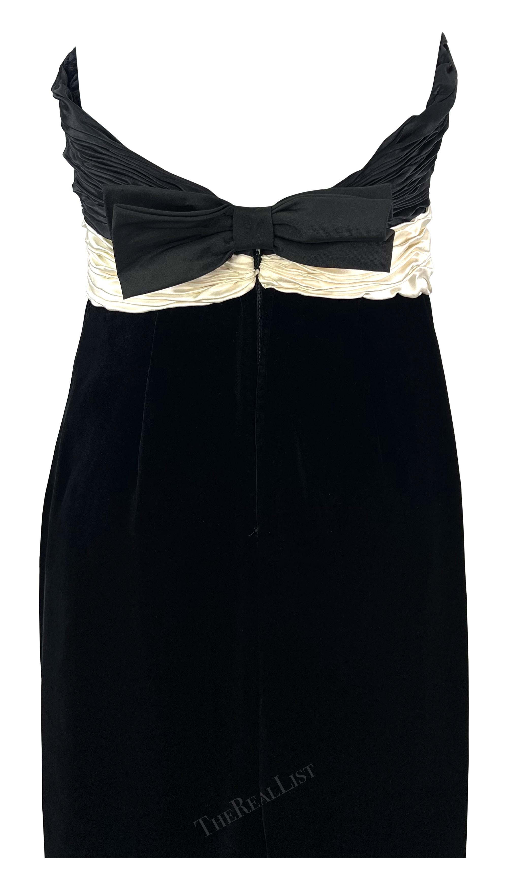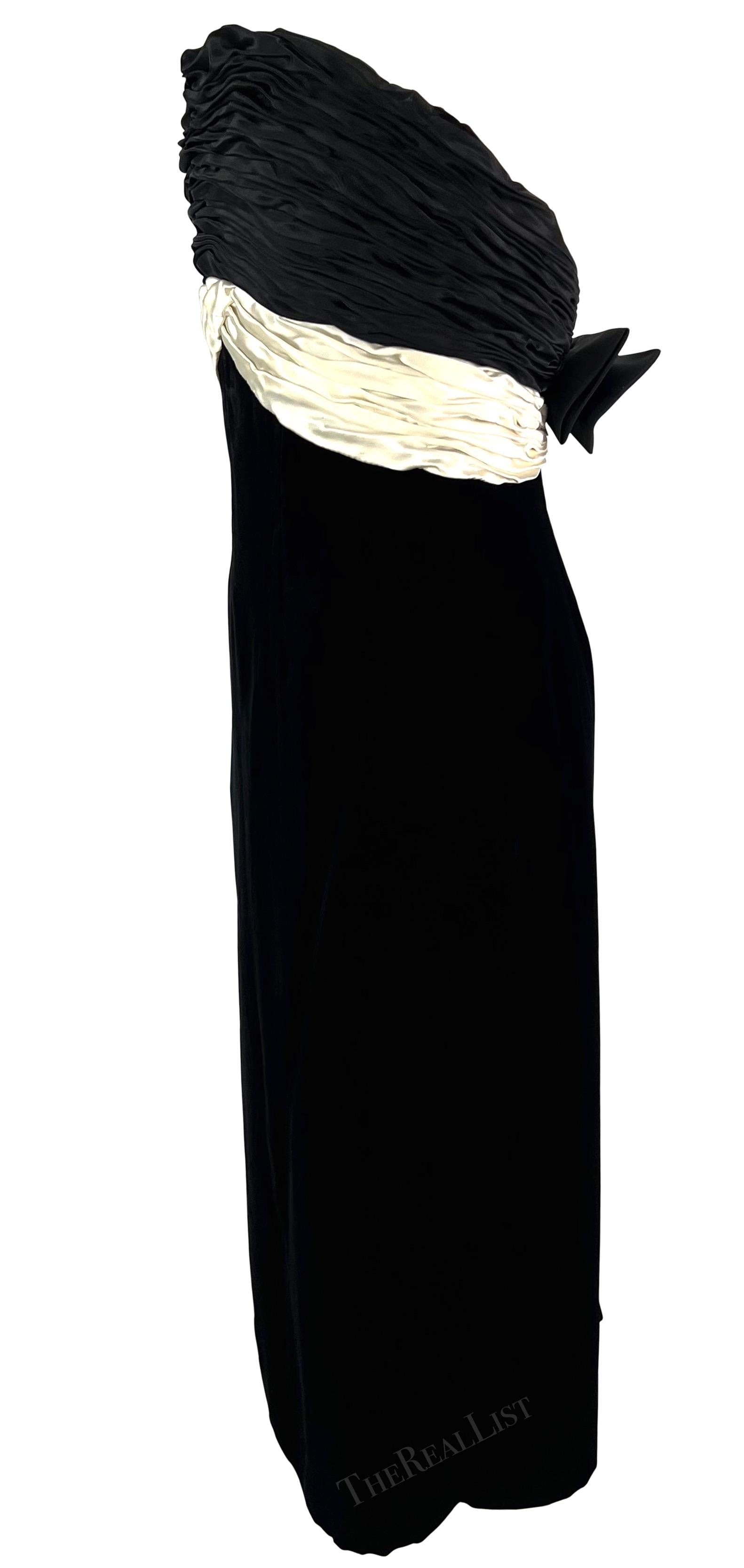 From the Fall/Winter 1985 collection, this elegant strapless Valentino dress debuted on the season's runway. This chic dress combines black and white silk ruching that drapes gracefully around the bust, accented by a perfectly placed bow at the lower back. Complementing this design is a black velvet skirt, making this Valentino dress a timeless addition to your wardrobe.