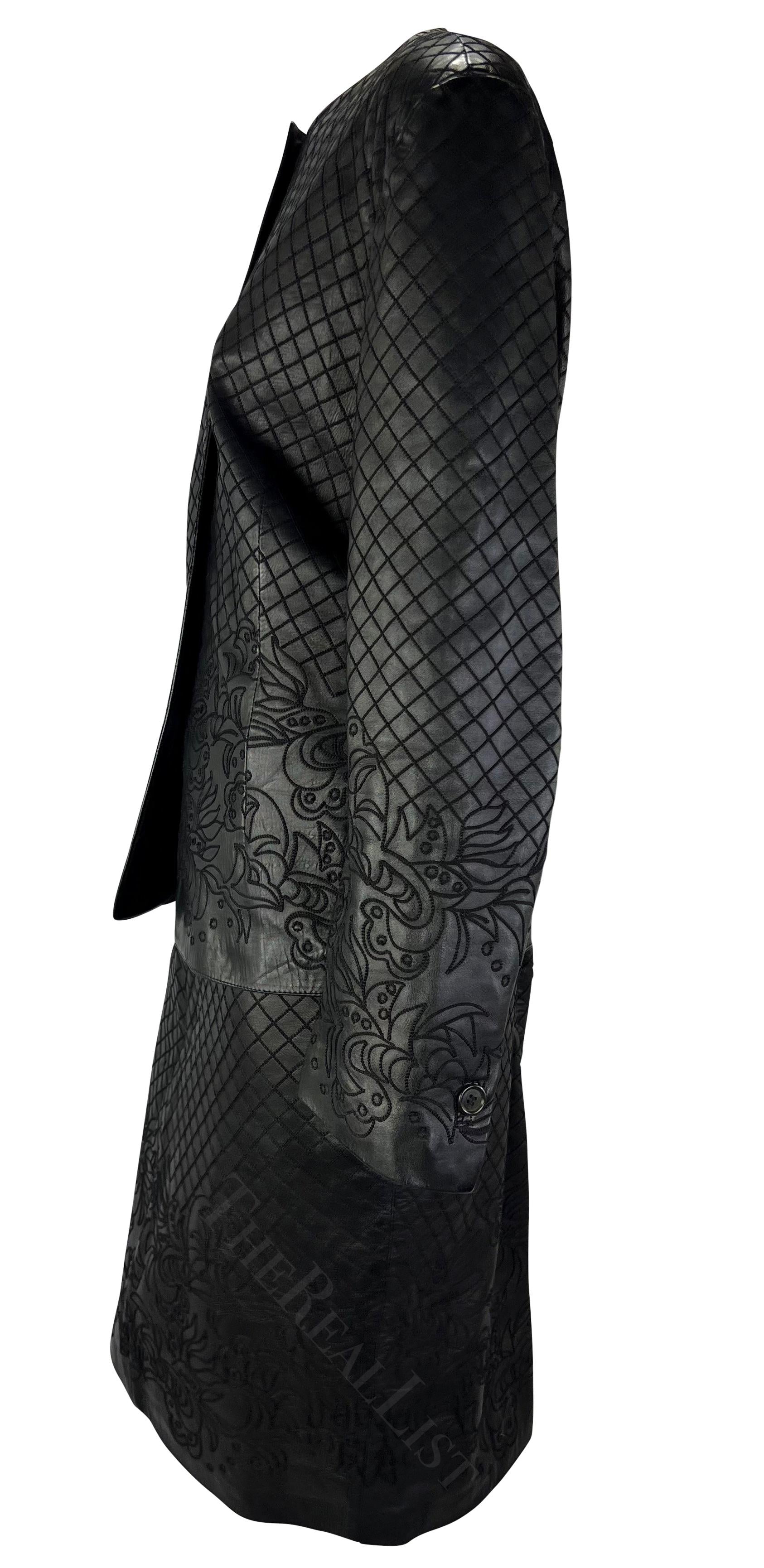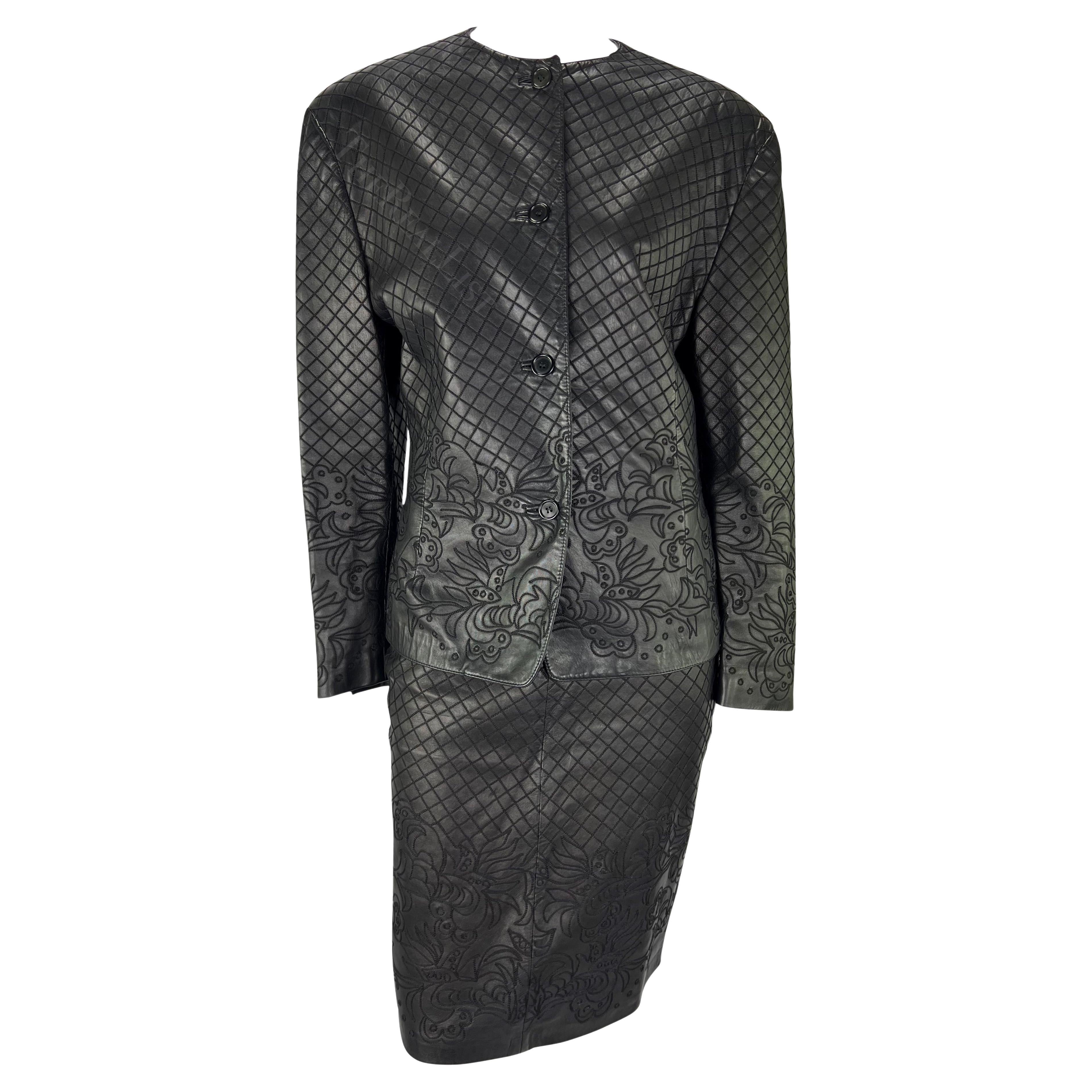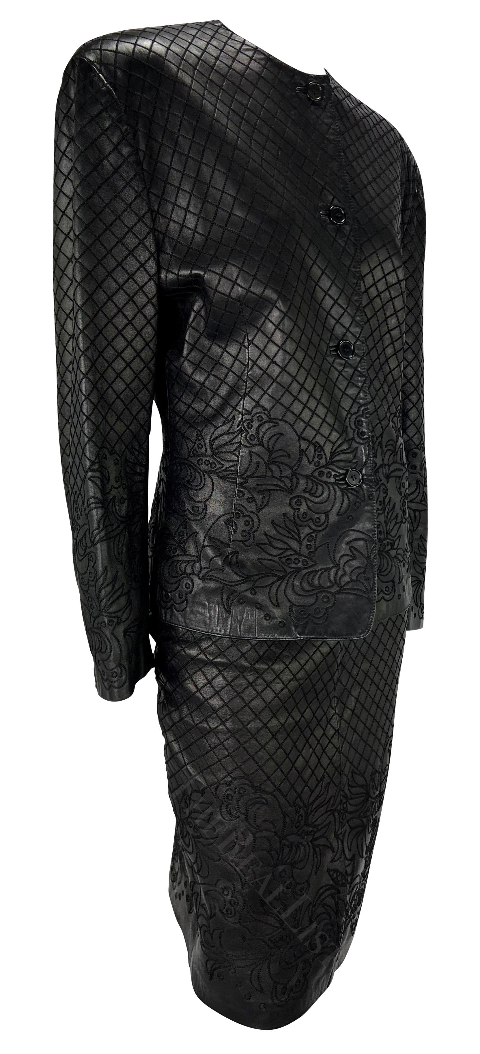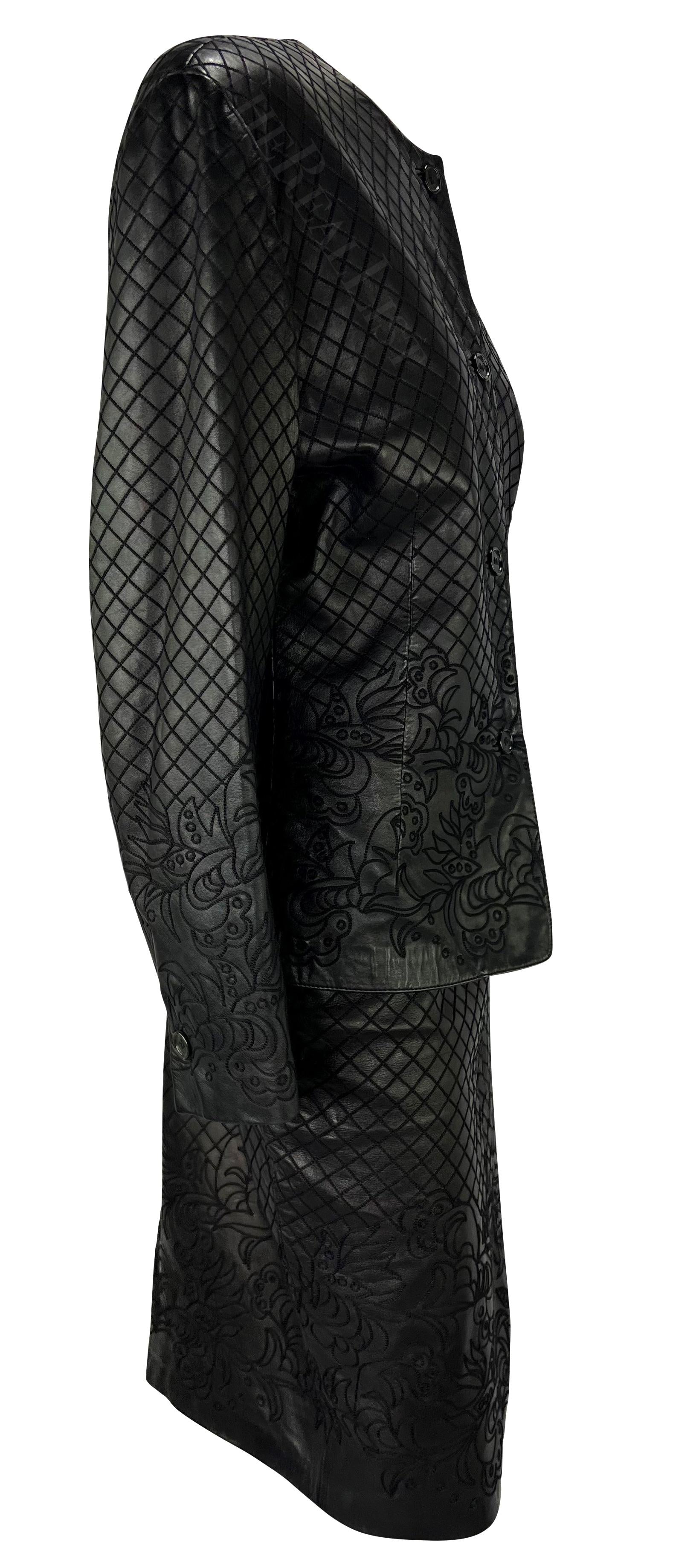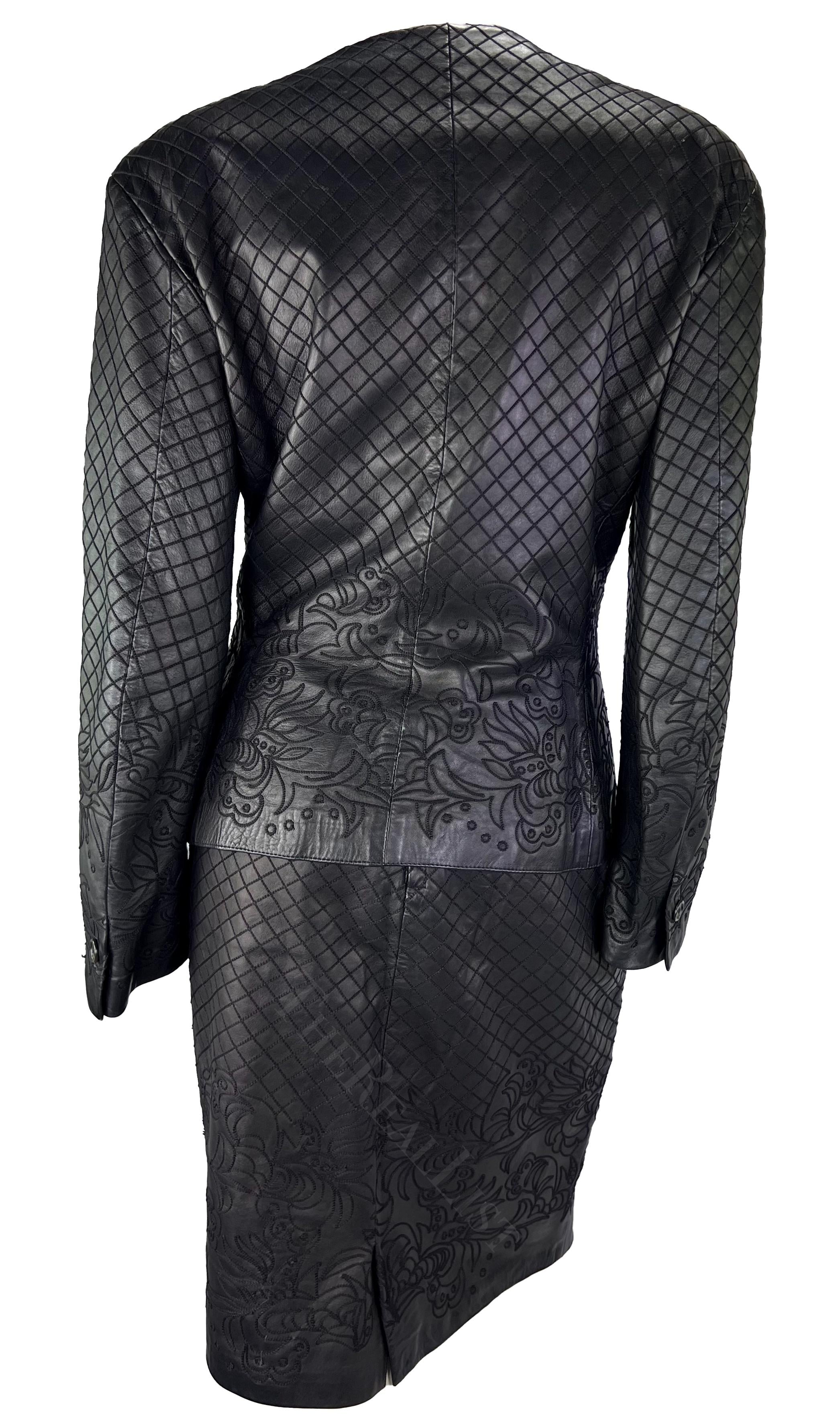 Presenting a beautiful black leather embroidered Gianni Versace skirt set, designed by Gianni Versace. From the Fall/Winter 1986 collection, this jacket from this set debuted on the season's runway. The set consists of a quilted collarless leather jacket and a matching skirt. Both the jacket and skirt feature a quilted diamond pattern at the top and a floral at the bottom.