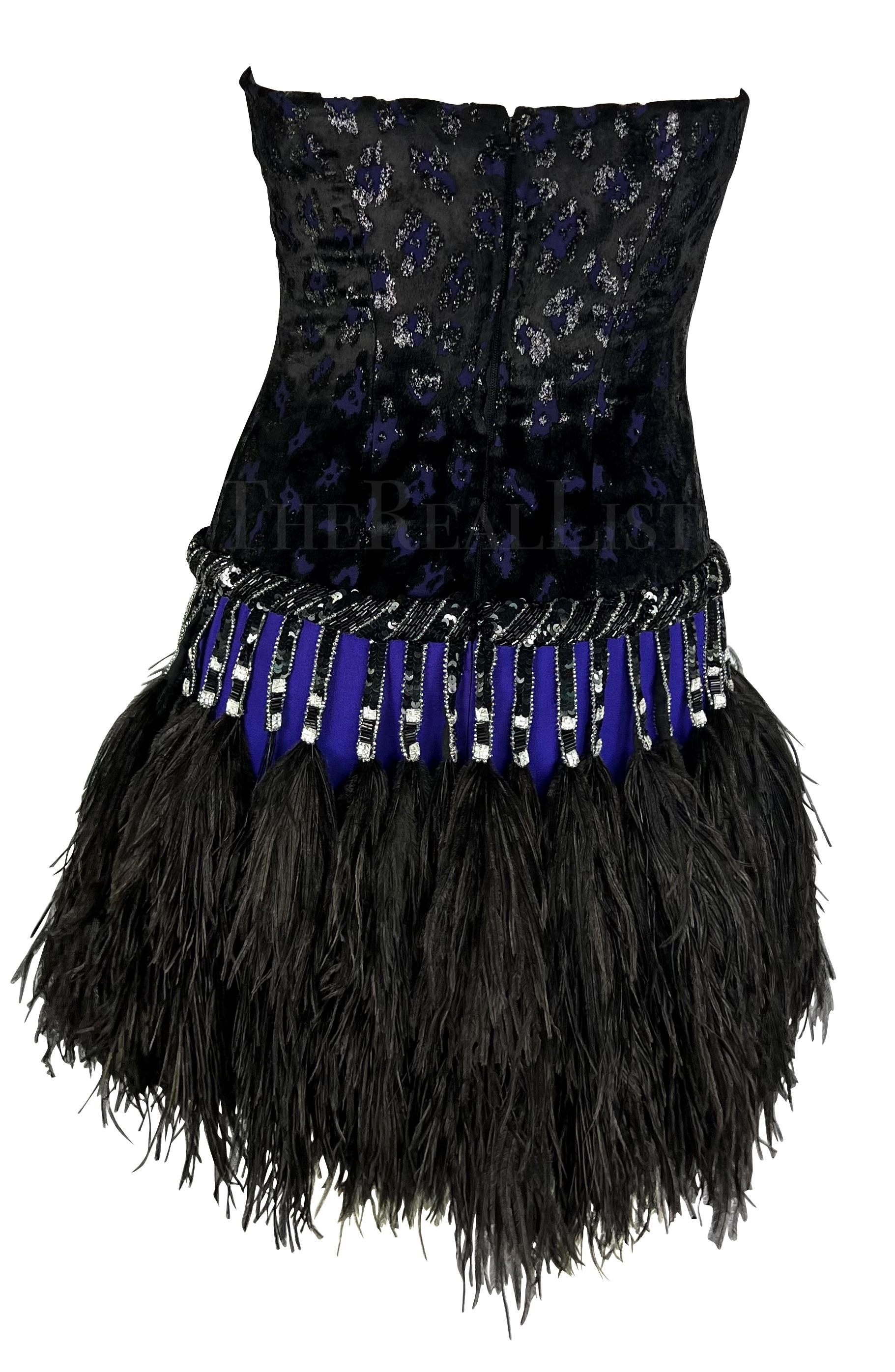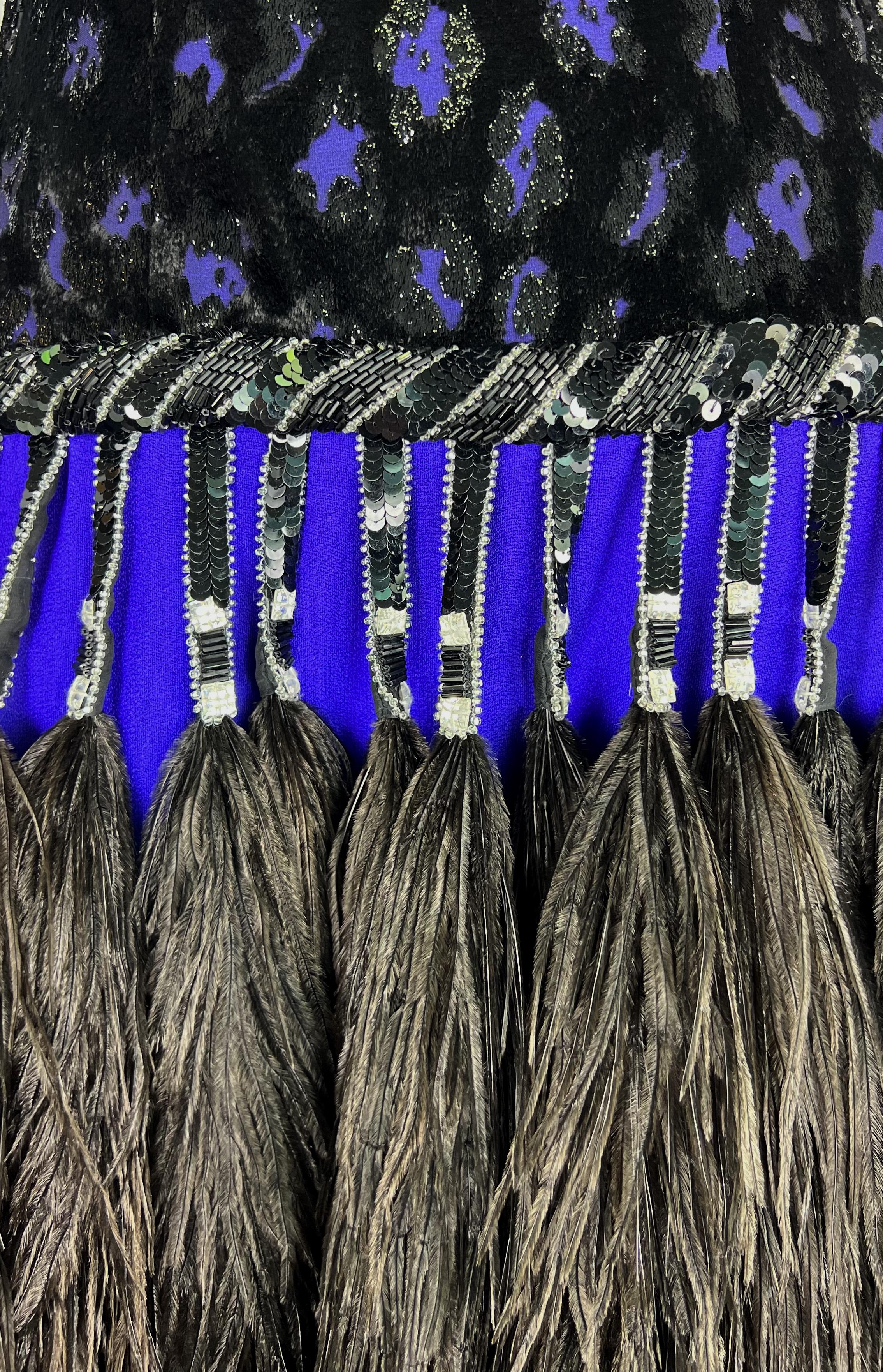 This jaguar-patterned mini dress from Bob Mackie is a dazzling example of the designer’s glamorous aesthetic. A yellow variation debuted on the Fall/Winter 1988 runway and was worn by Bernadette Peters with Mackie to the 1988 Met Gala. This custom strapless version is rendered in purple and fully embodies Mackie’s signature sparkle. The fitted bodice is crafted in velvet lurex with a shimmering jaguar motif, paired with a vibrant purple skirt. A beaded and sequined rope wraps around the hips, releasing plumes of ostrich feathers for dramatic effect. A rare and fabulous piece, it captures the theatrical glamour that defines Bob Mackie’s work.