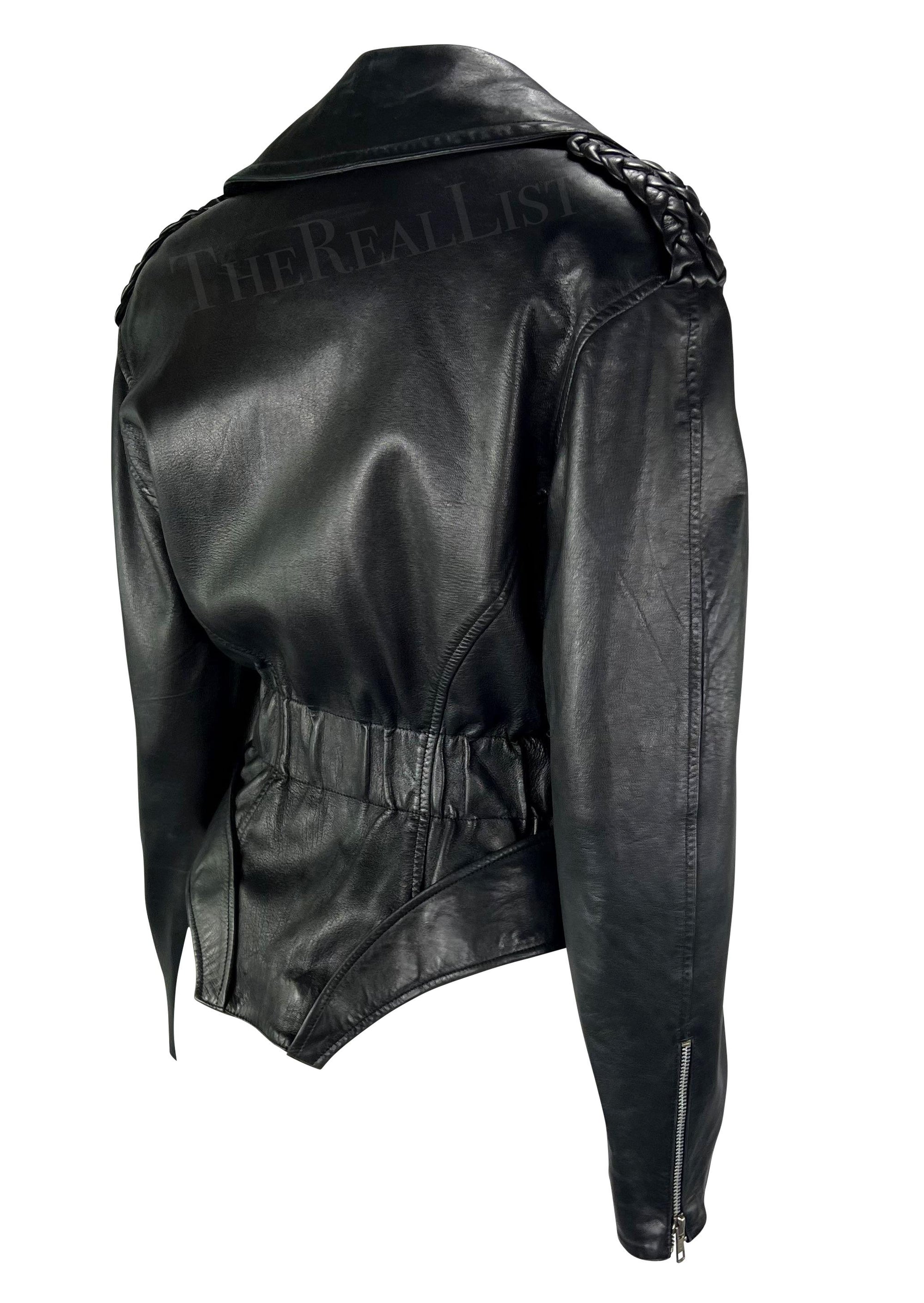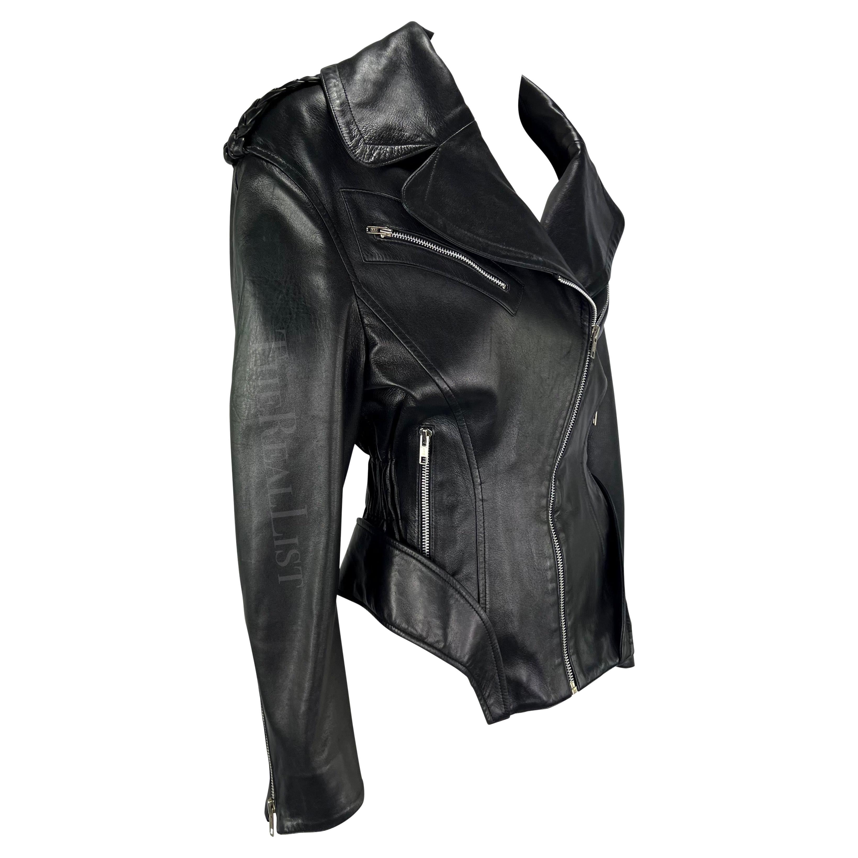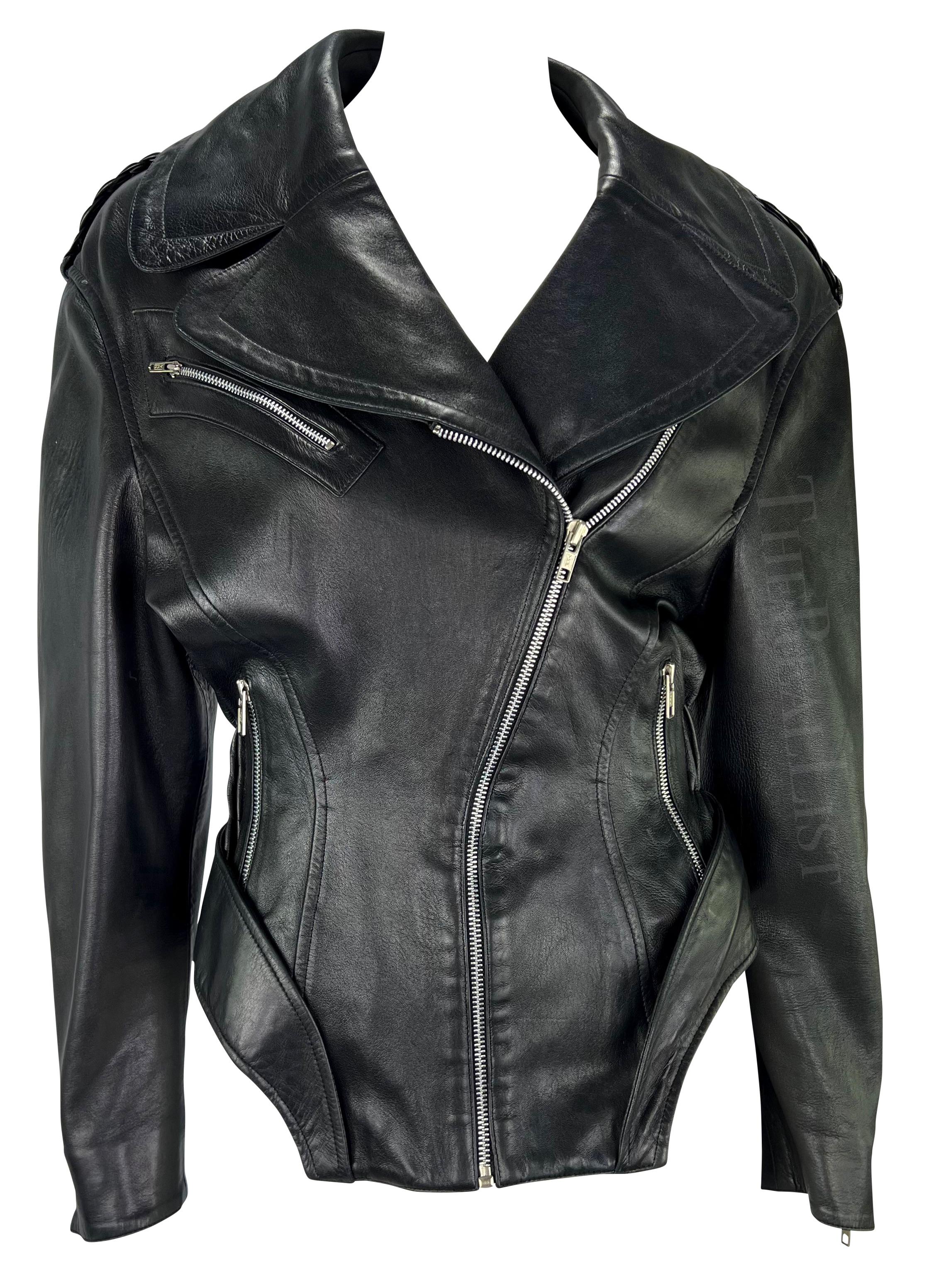 Presenting a fabulous black leather Thierry Mugler moto jacket, designed by Manfred Mugler. From the Fall/Winter 1988 "Les Infernales" collection, a version of this jacket debuted on the season's runway. The jacket is constructed of leather and features an asymmetrical zipper closure and braided leather epaulettes. Masterfully designed to accentuate the female form, Mugler tactfully tailored this jacket with a nipped waist and exaggerated angular leather accents at the hips. A masterpiece, this rare Thierry Mugler jacket is the perfect addition to any wardrobe or collection!