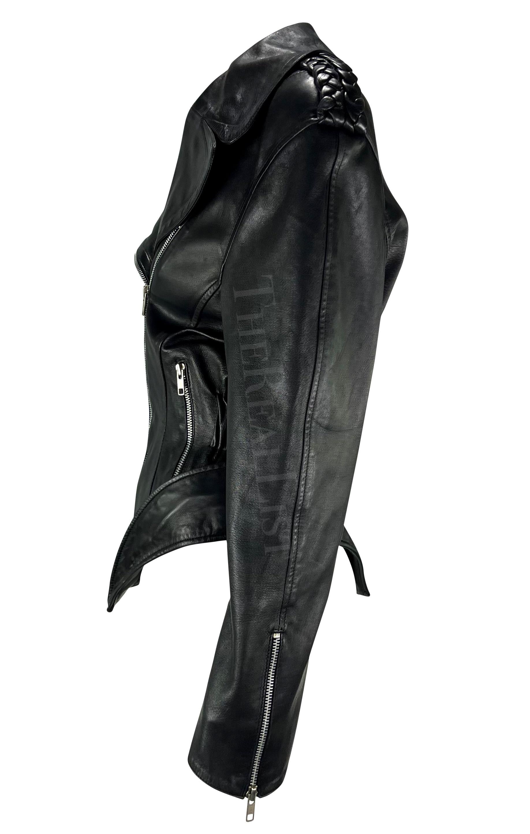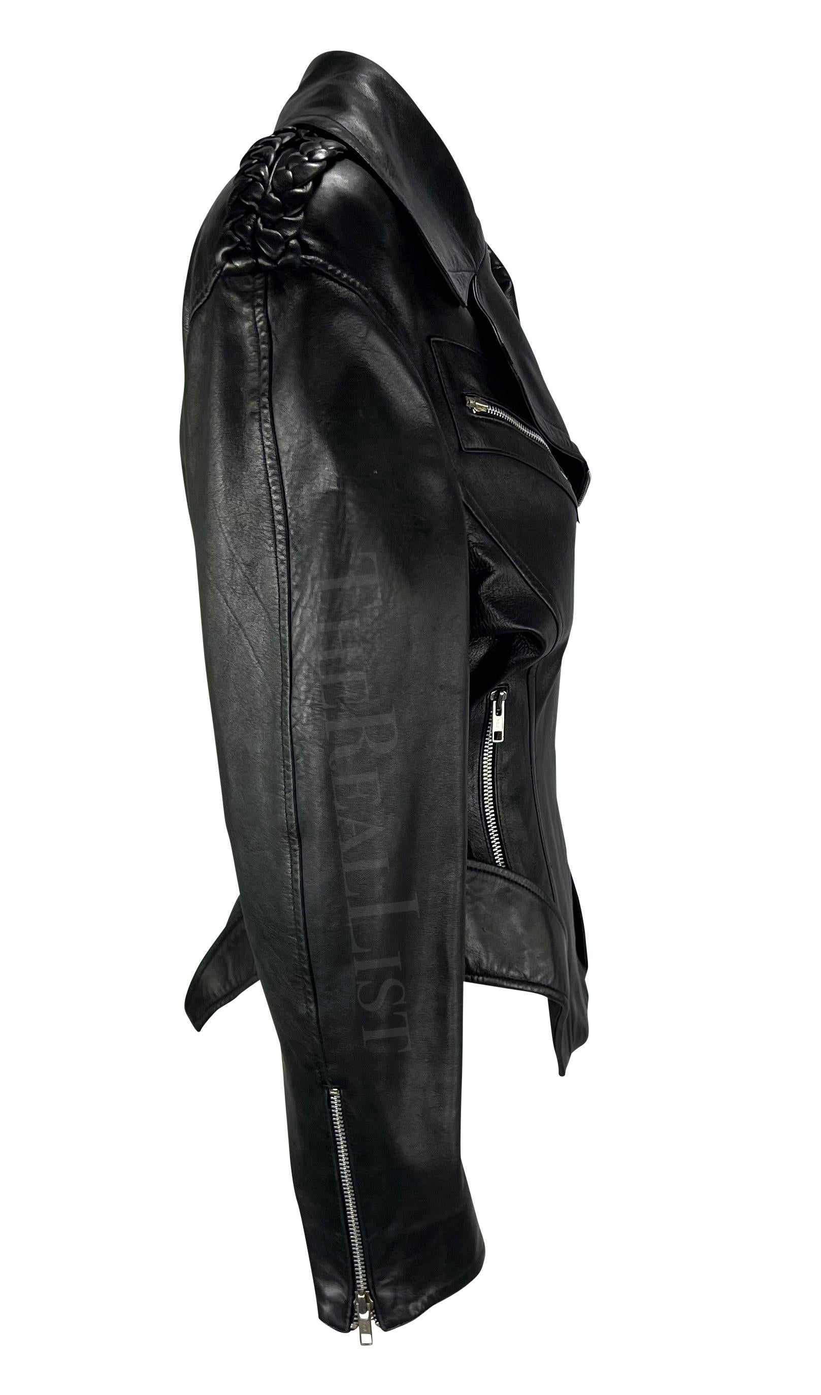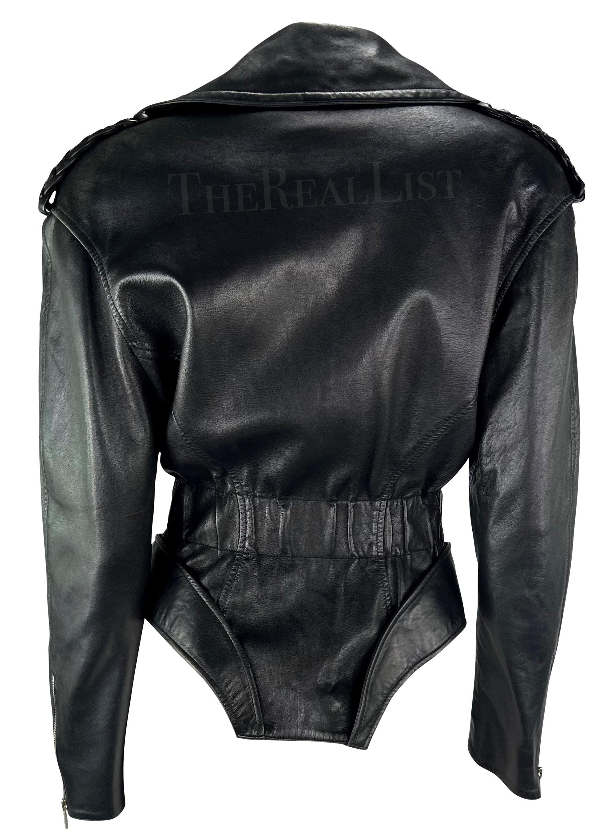 Presenting a fabulous black leather Thierry Mugler moto jacket, designed by Manfred Mugler. From the Fall/Winter 1988 "Les Infernales" collection, a version of this jacket debuted on the season's runway. The jacket is constructed of leather and features an asymmetrical zipper closure and braided leather epaulettes. Masterfully designed to accentuate the female form, Mugler tactfully tailored this jacket with a nipped waist and exaggerated angular leather accents at the hips. A masterpiece, this rare Thierry Mugler jacket is the perfect addition to any wardrobe or collection!