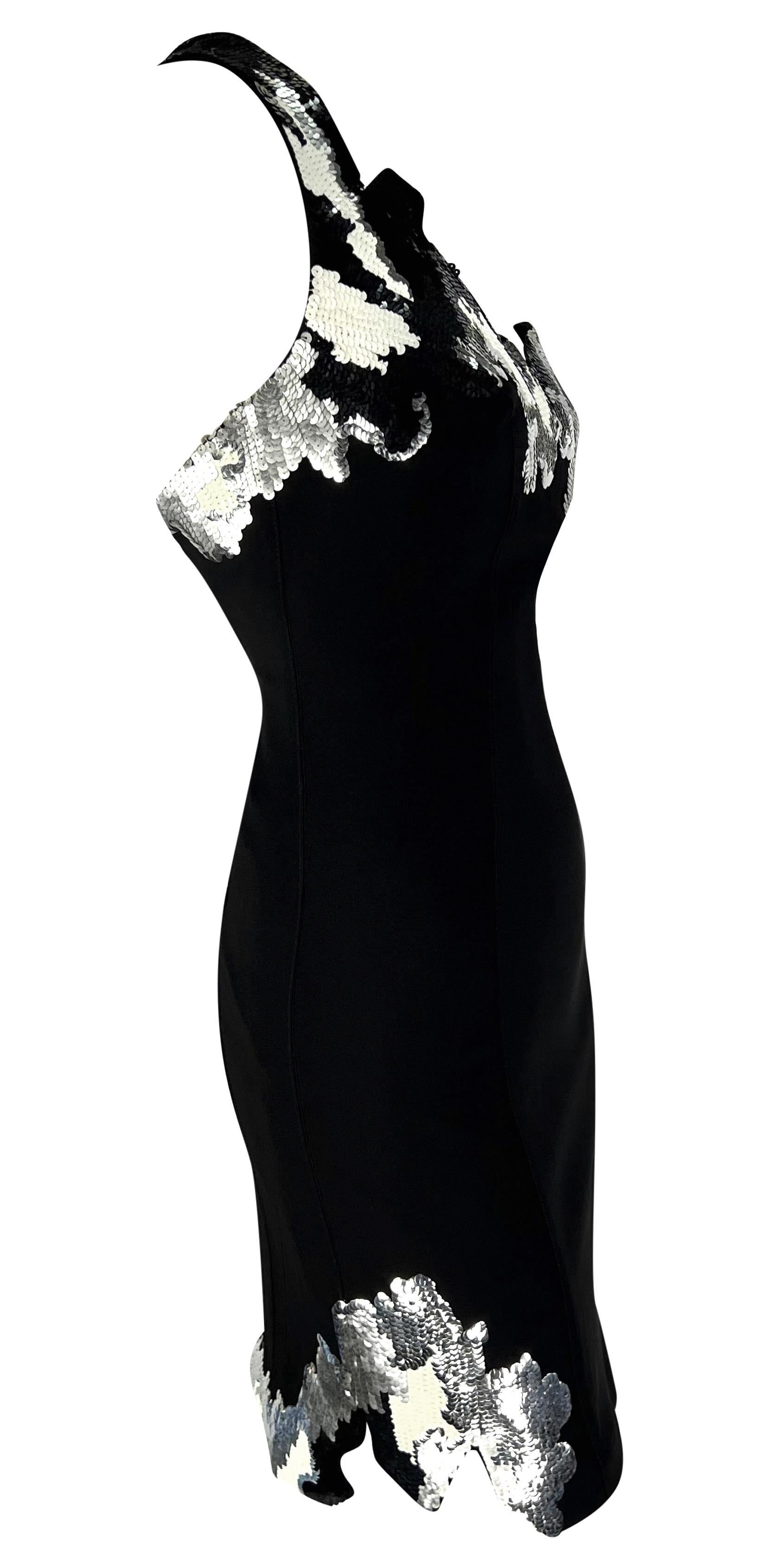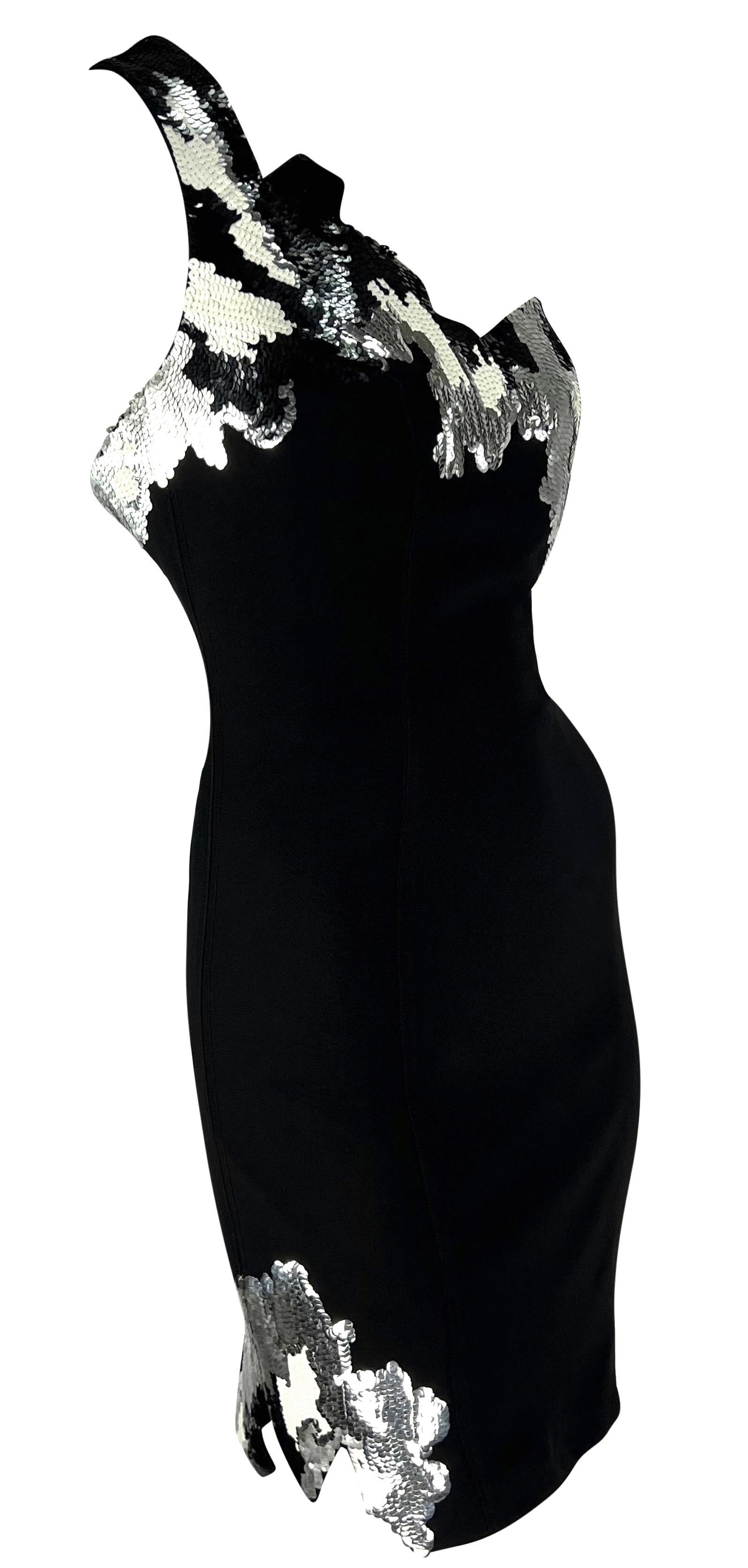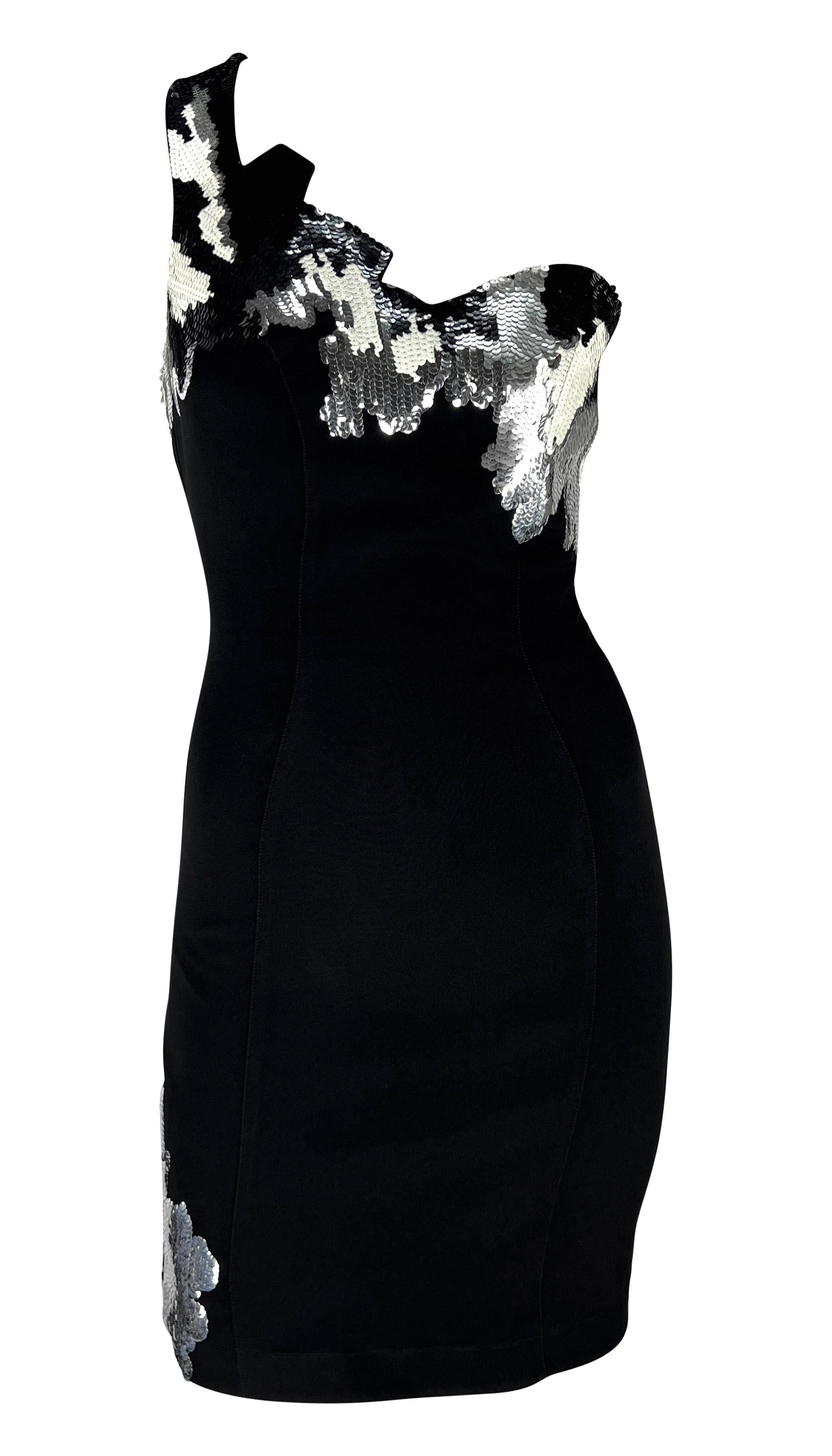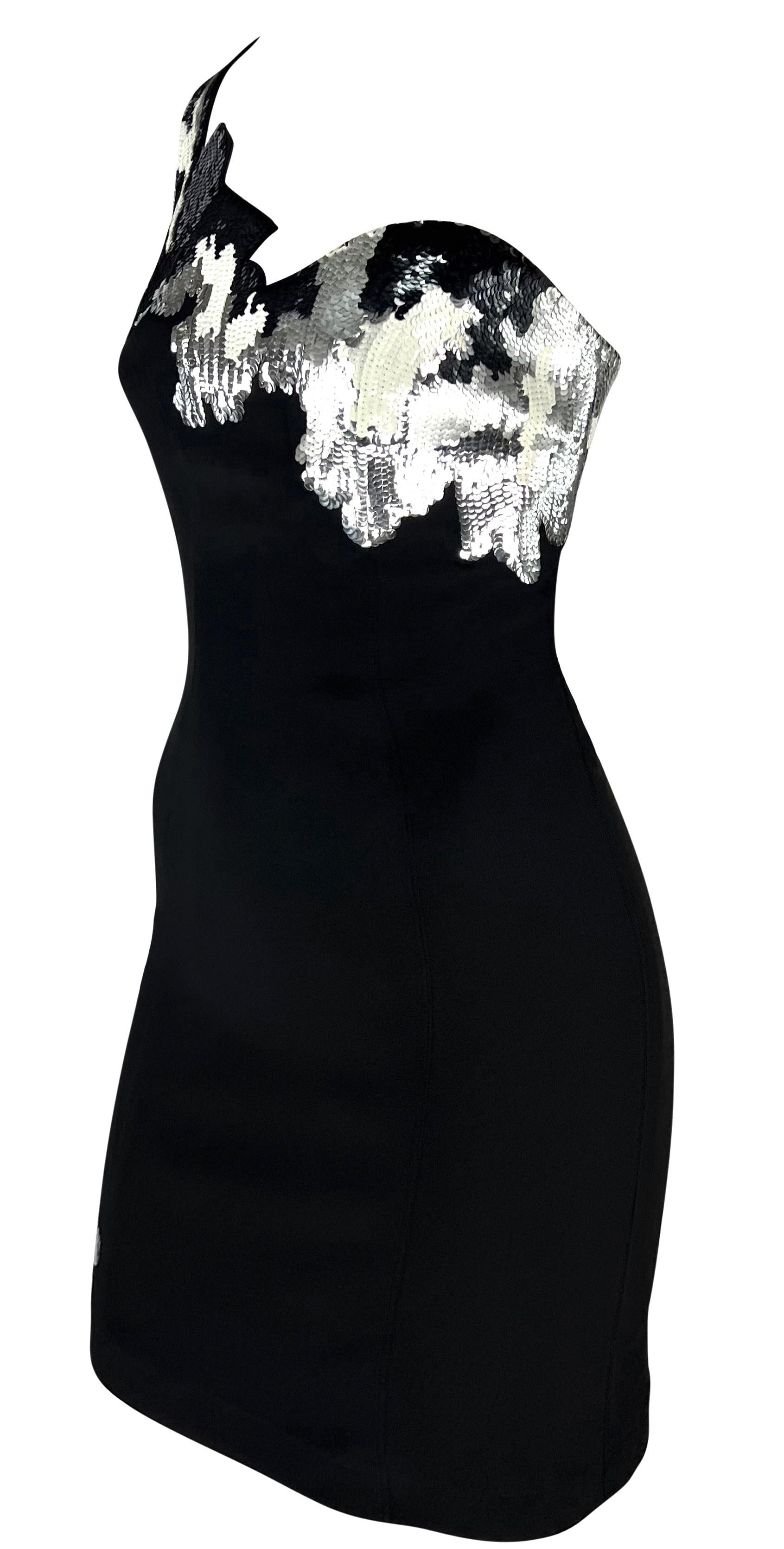 Manfred Mugler designed this stunning black Thierry Mugler mini dress for the Fall/Winter 1989 collection. This captivating dress features a single shoulder strap with an abstract angular cut bust accented with black, white, and silver sequins, with similar edges and gradient sequin details on the season's runway. The hem of this shiny mini dress also features a matching angular cutout hem and a gathering of sequins on one side. This rare Thierry Mugler dress is the perfect, sexy, lustrous addition to any wardrobe or collection.