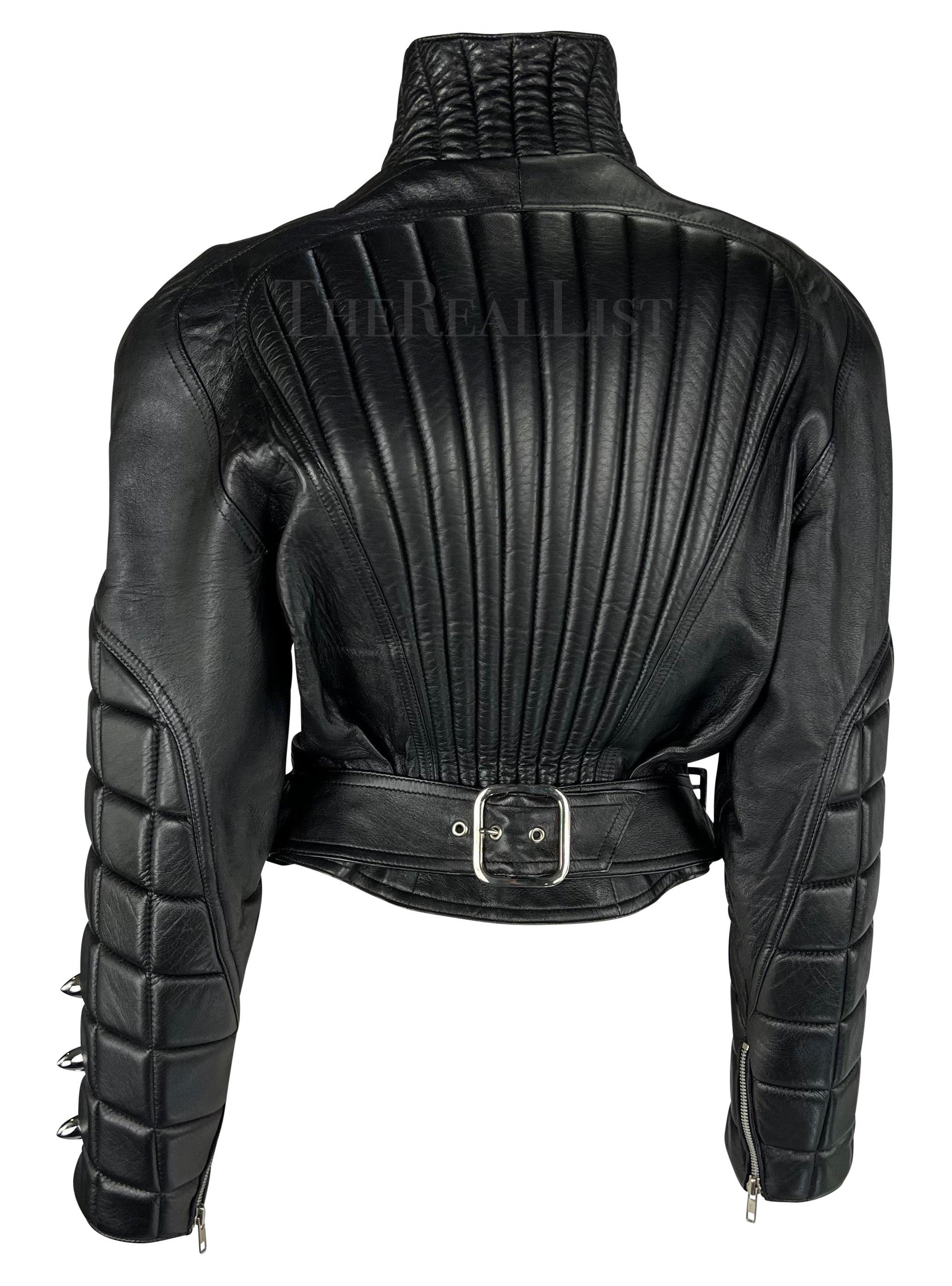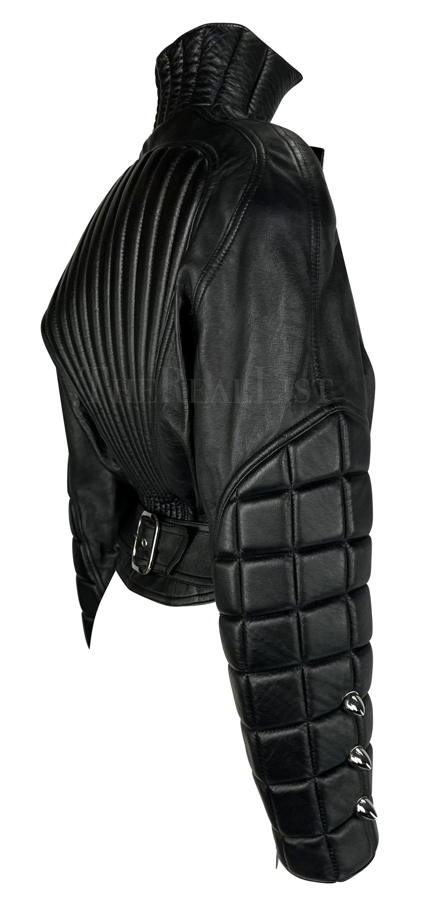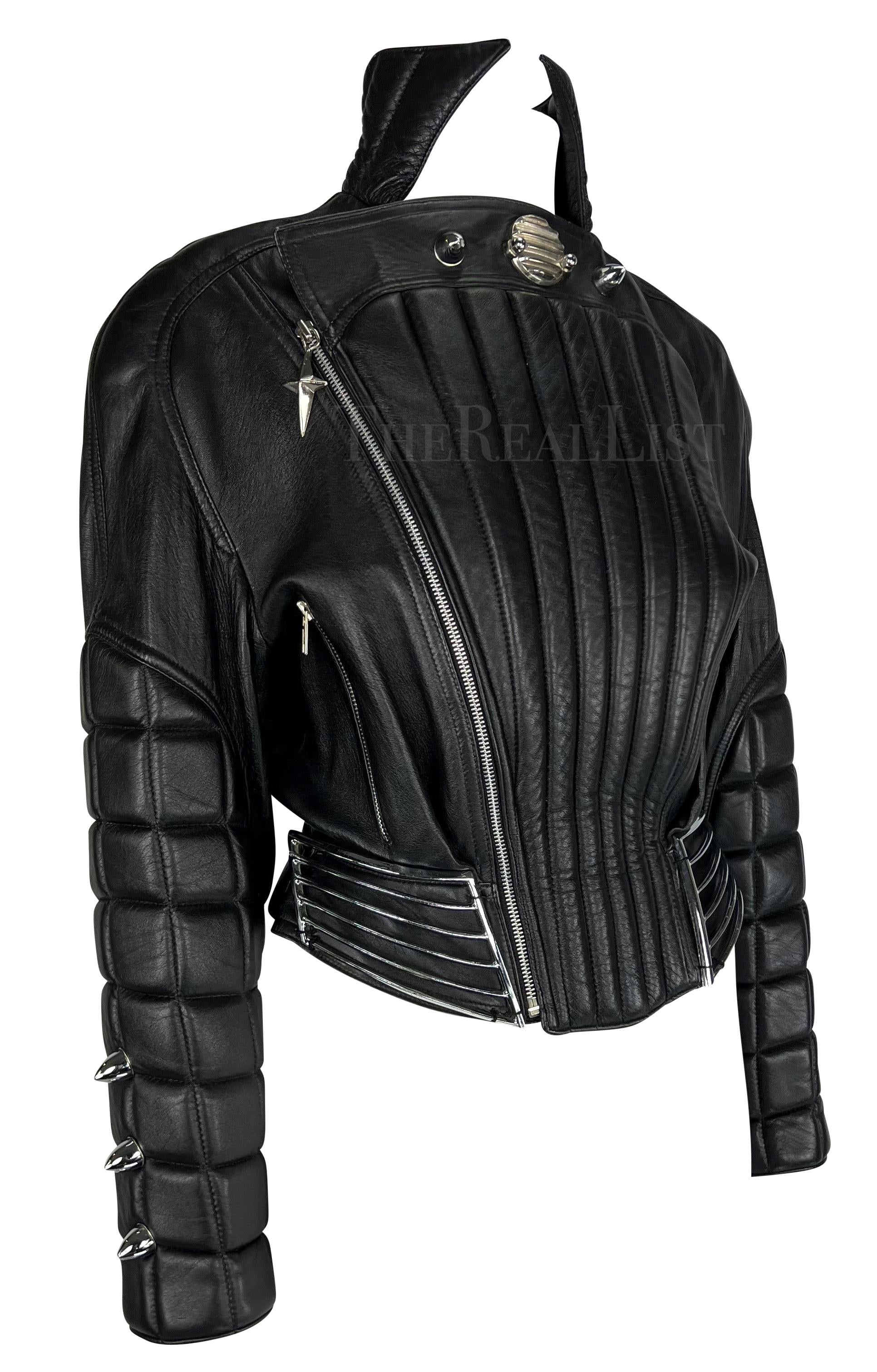 Presenting a major black leather Thierry Mugler biker motorcycle style jacket, designed by Manfred Mugler. From his Fall/Winter 1989 'Hiver Buick' collection, versions of this vintage eye-catching jacket debuted on the season's runway, on Roberta Chirko, and in numerous campaigns. The collection was inspired by the work of automotive designer Harley Earl, who designed with free-form sketches and hand-carved clay models and authorized the introduction of Franklin Quick Hershey's aerospace-inspired tail-fins on the 1948 Cadillac. This sculptural jacket takes cues from the highly-stylized American cars of the Space Age with chrome-tone accents throughout. These shiny accents include aerodynamic studs at the arms and neckline, radiator grille inspired accents at the hips, a star-shaped zipper reminiscent of a hood ornament, and round hardware adornment at the neckline. Quilting accentuates the lines of the cinched silhouette while reflecting the style of automotive seats. A must-have for any Thierry Mugler lover, this coat is the perfect encapsulation of Mugler's visionary style and commitment to masterful design and construction.