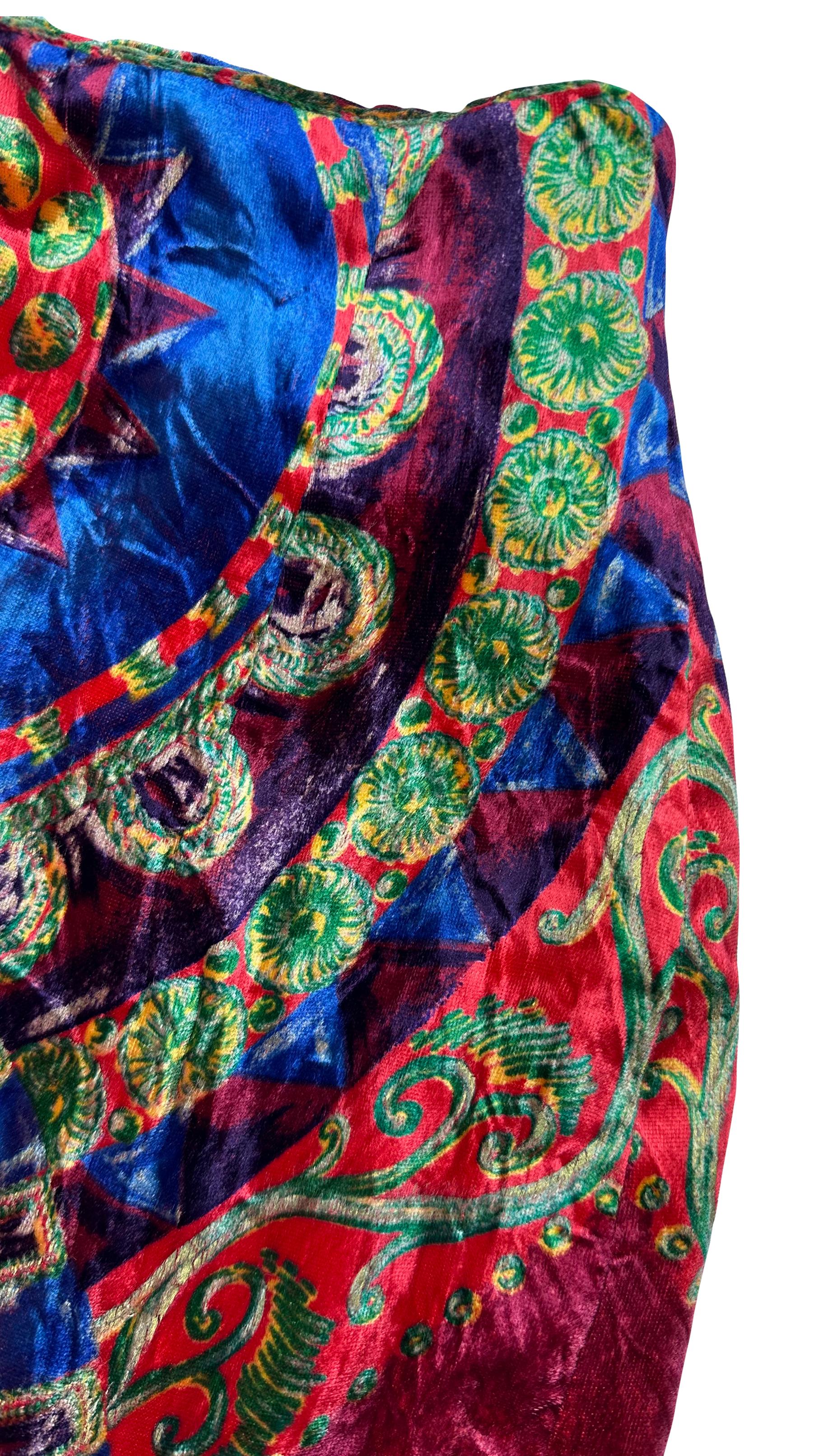 This multicolor velvet skirt from Gianni Versace's Fall/Winter 1990 collection features a striking, intricate pattern. This rich pattern debuted on the season's runway, the design combines bold circular patterns in deep red, blue, green, and gold tones. The supple velvet fabric enhances the vibrant color scheme.