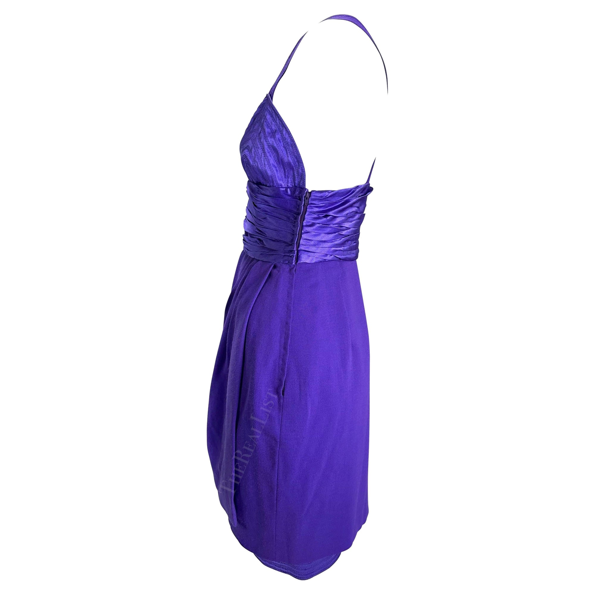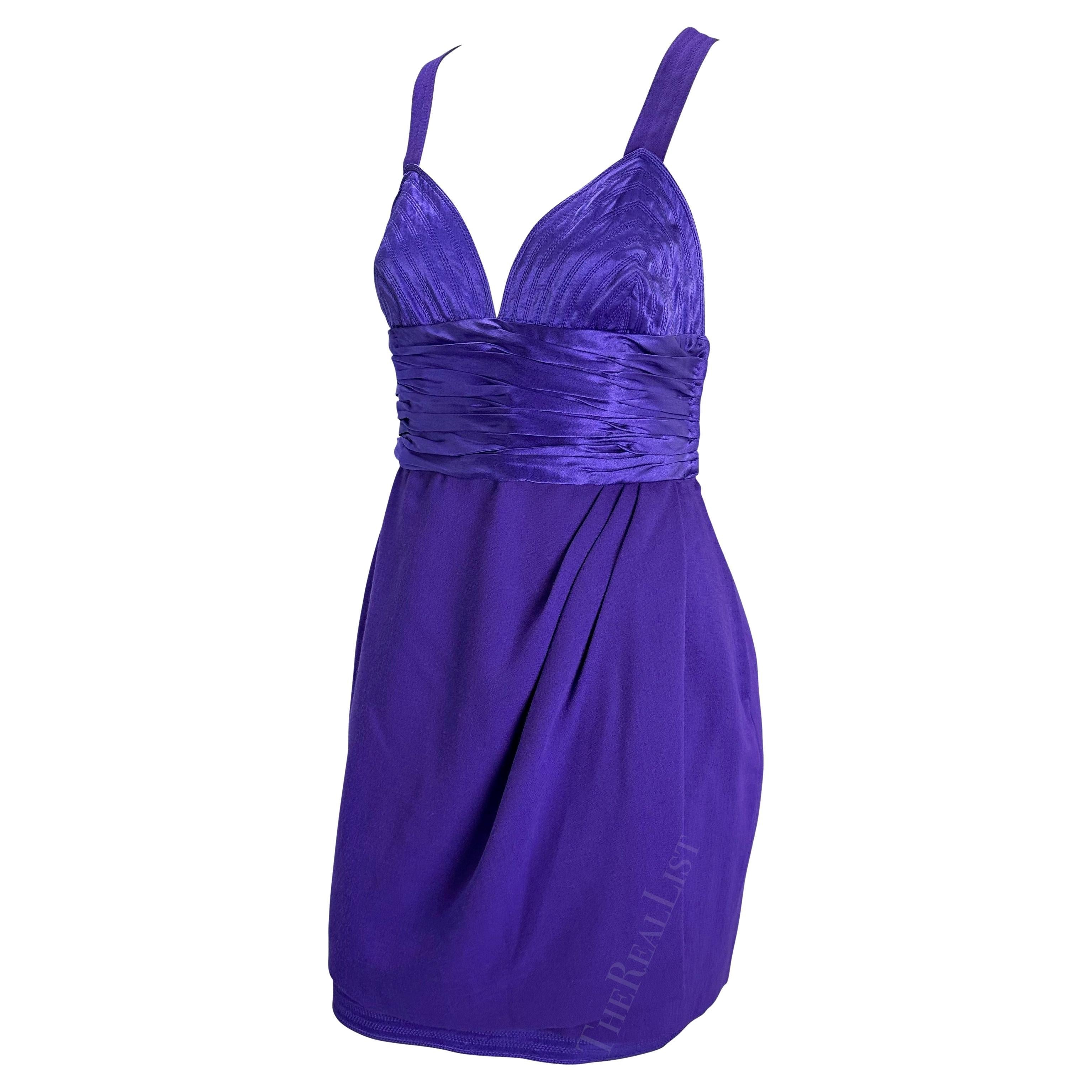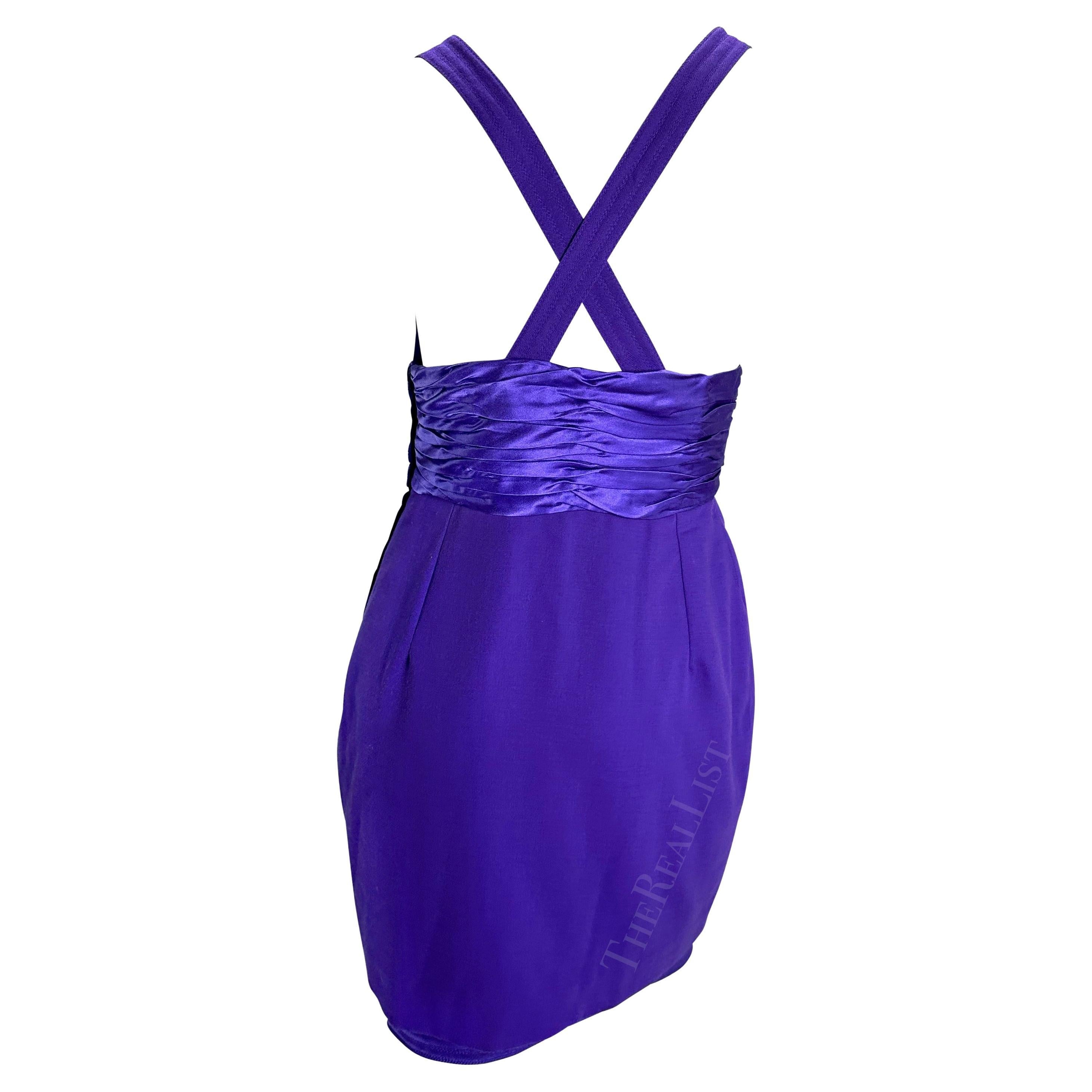 F/W 1990 Gianni Versace Runway Ruched Purple Satin Trim Wrap Mini Dress