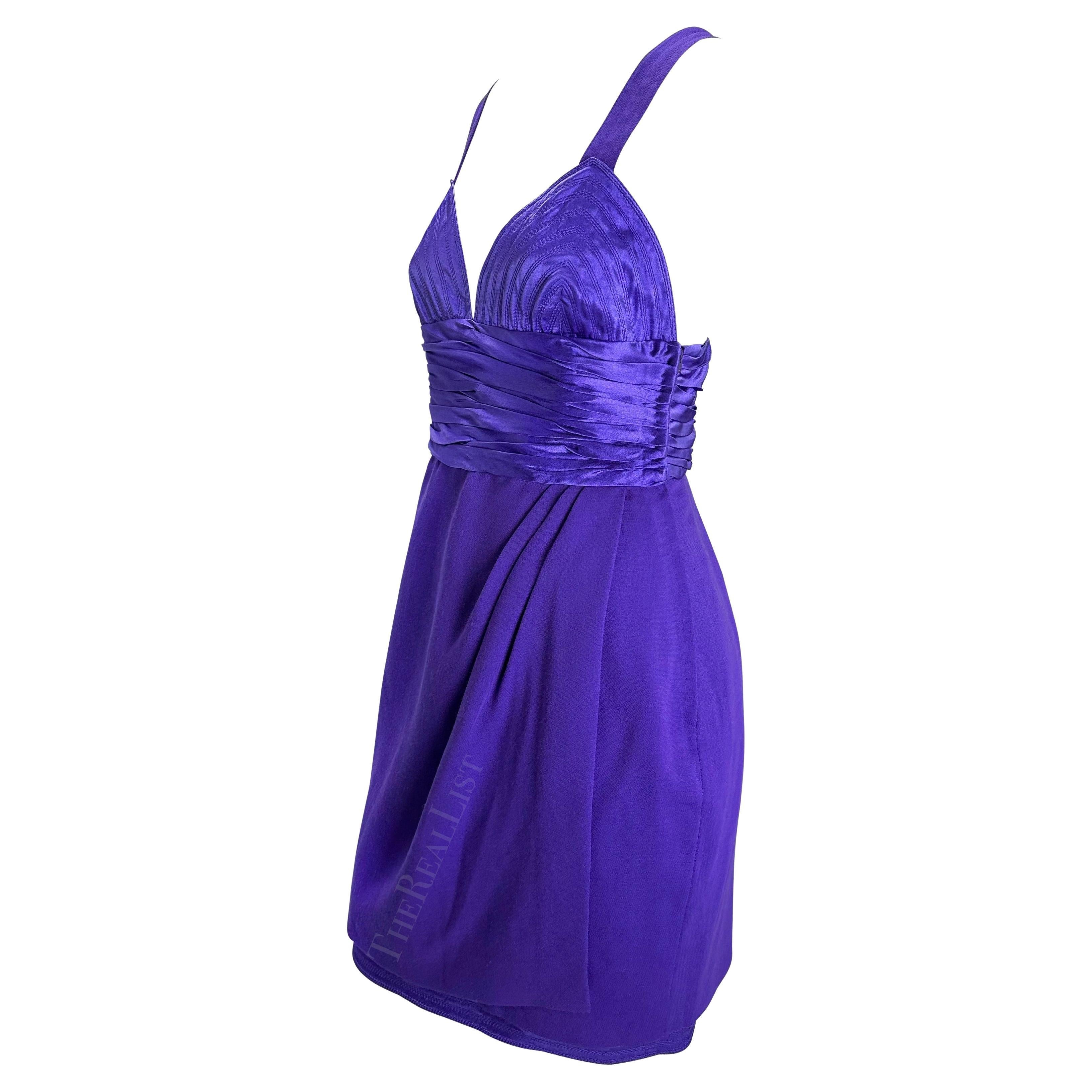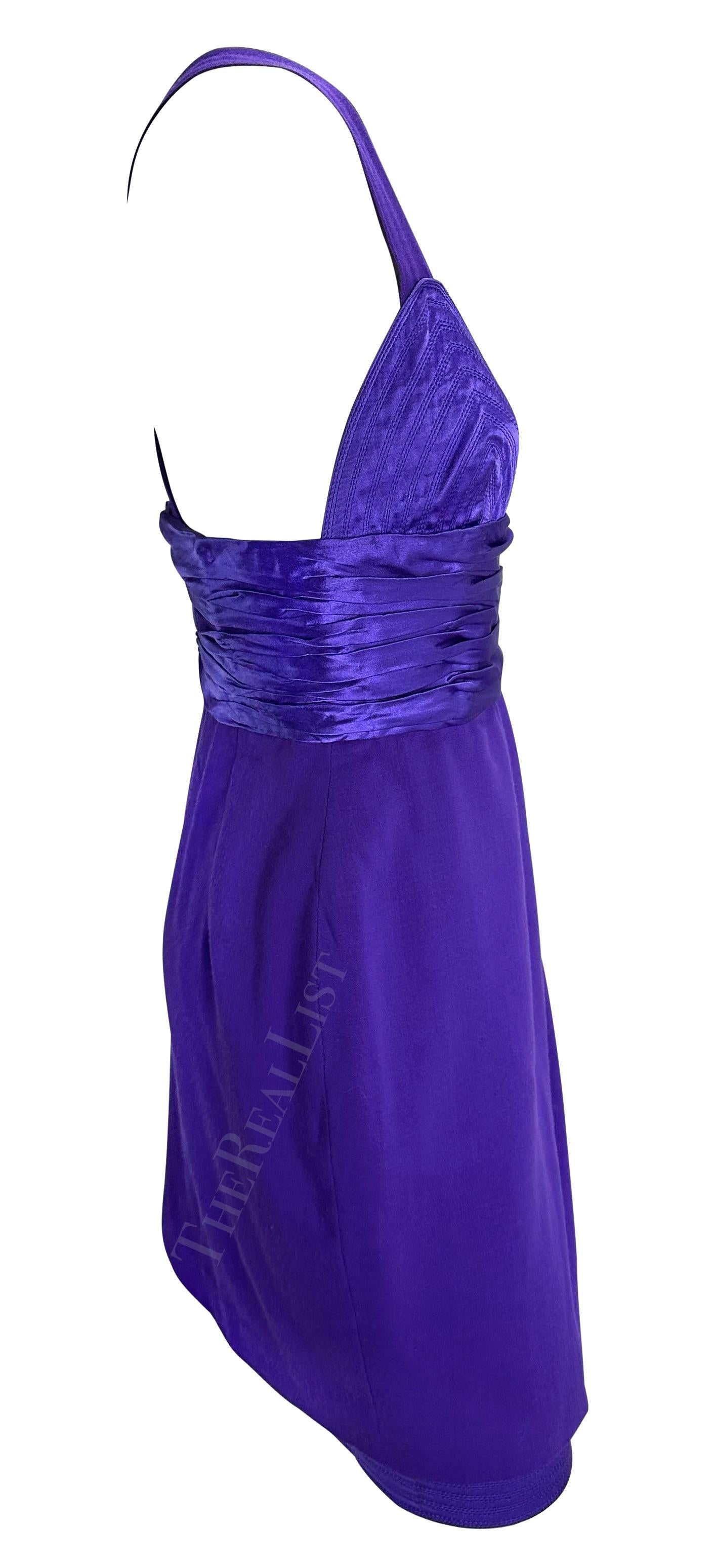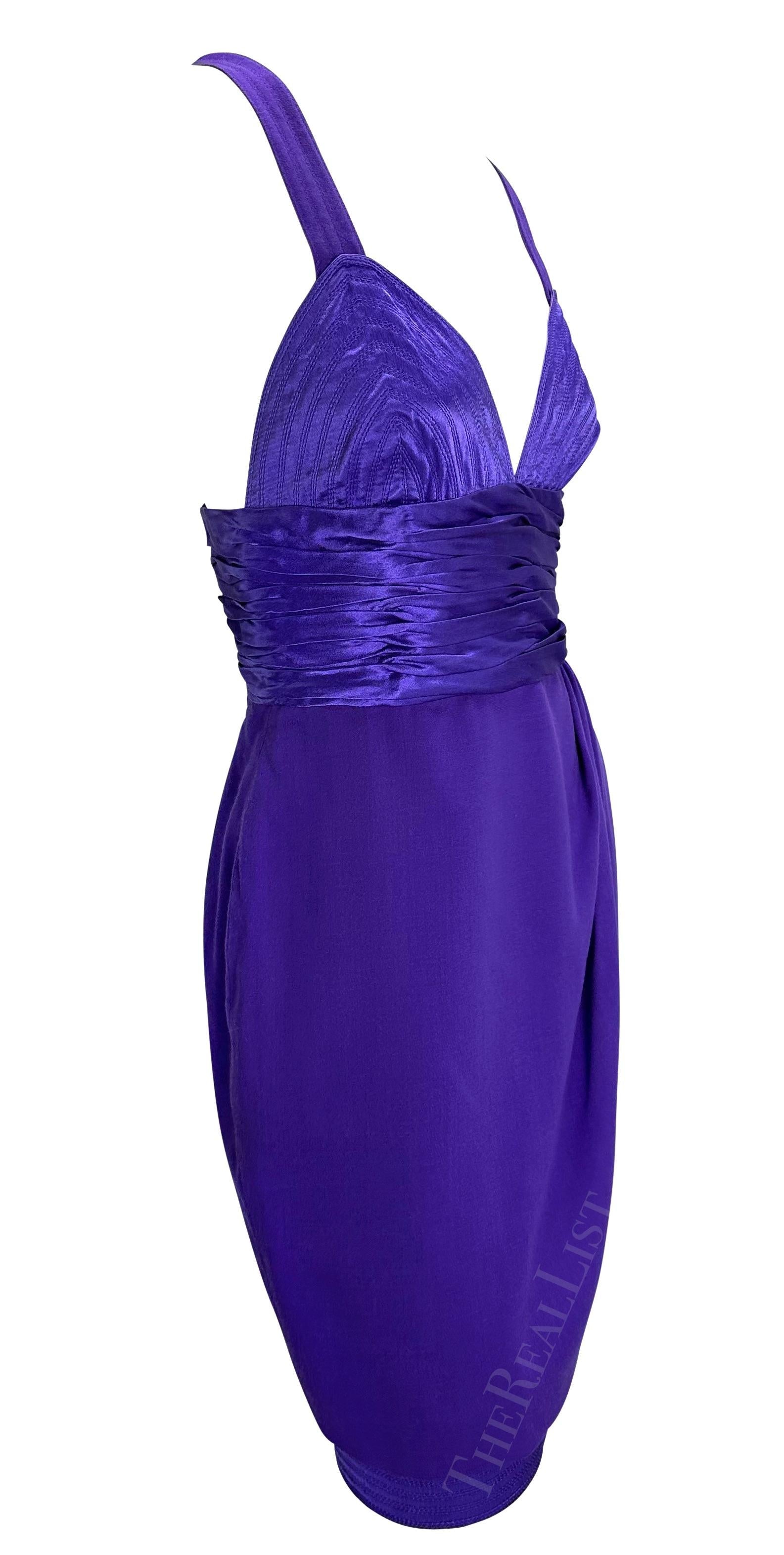 F/W 1990 Gianni Versace Runway Ruched Purple Satin Trim Wrap Mini Dress