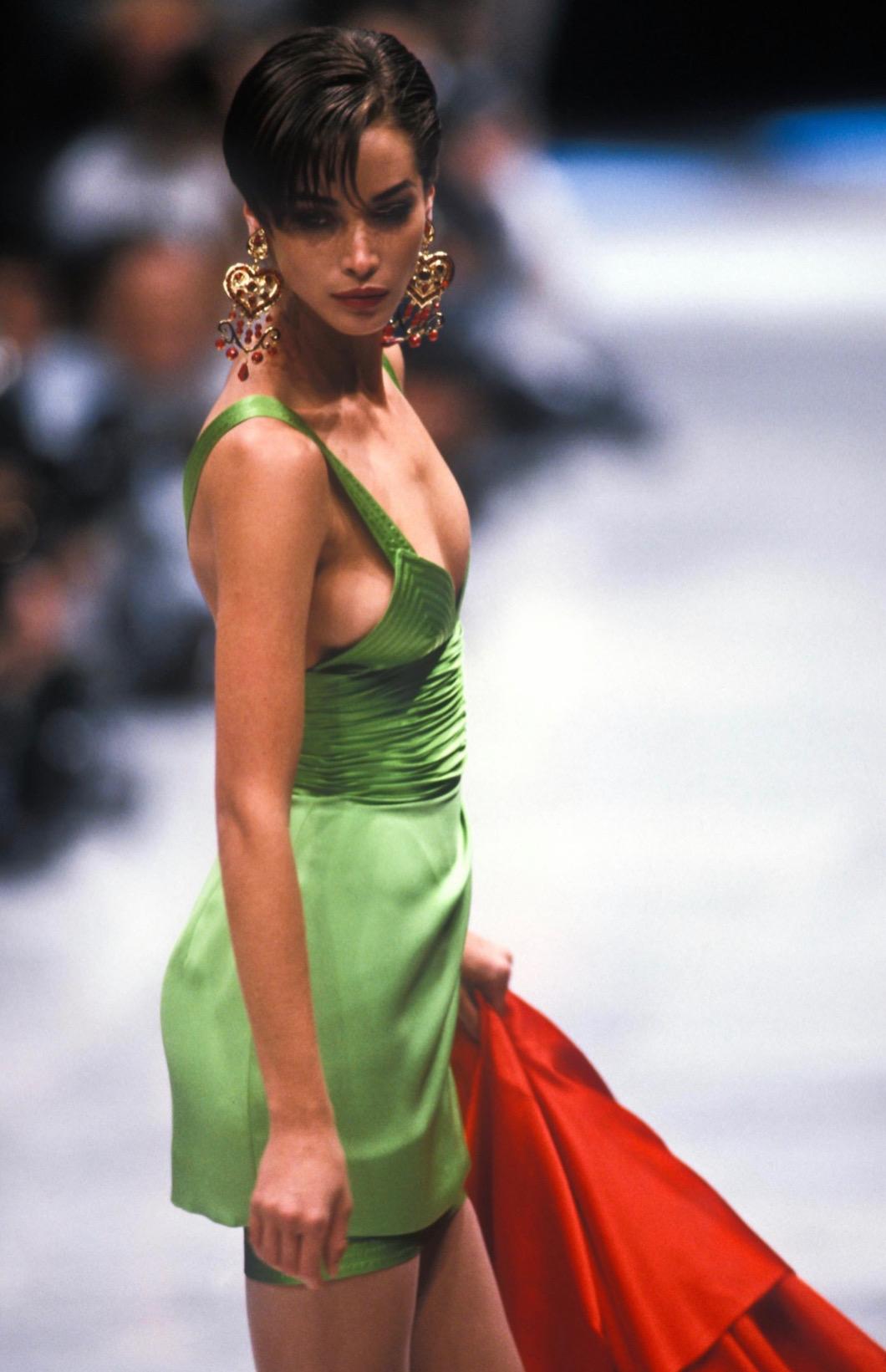 This bright purple Gianni Versace mini dress from the Spring/Summer 1990 collection showcases Gianni’s signature early ’90s sensual elegance. The dress debuted in green on the season’s runway and features a ruched satin waistband, crisscross straps, and a plunging v-neckline. Light pleating at the skirt adds movement and structure to the figure-hugging silhouette. A striking example of Versace’s bold yet refined design from this era, this rare piece embodies the confident glamour that defined his work in the early 1990s.