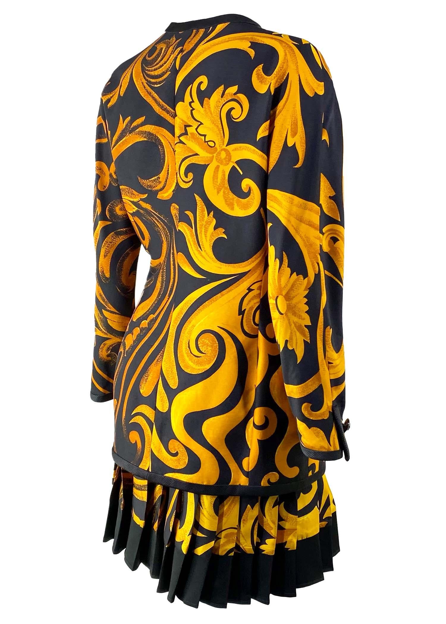 F/W 1991 Gianni Versace Couture Black Gold Baroque Print Silk Pleated Skirt Suit