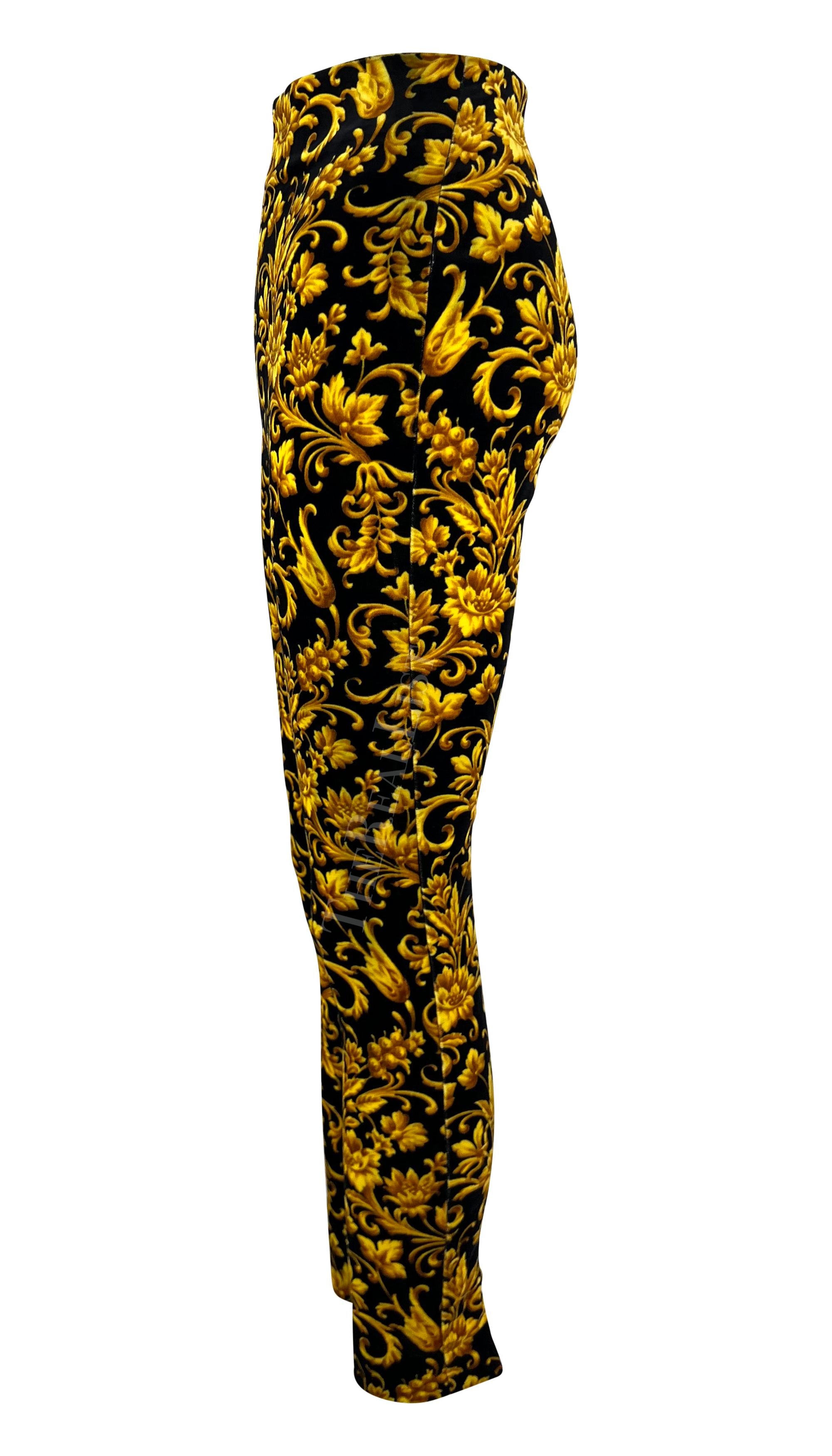 Presenting a fabulous pair of black-yellow-gold baroque print Gianni Versace velvet print, designed by Gianni Versace. From the Fall/Winter 1991 collection, these pants debuted on the season's runway as part of look 65, modeled by Yasmeen Ghauri. These form-fitting stretchy velvet pants are covered in a yellow-gold baroque and feature a high waist. A fabulous addition to any collection or wardrobe, these Gianni Versace jeans are the perfect encapsulation of 1990s Versace.