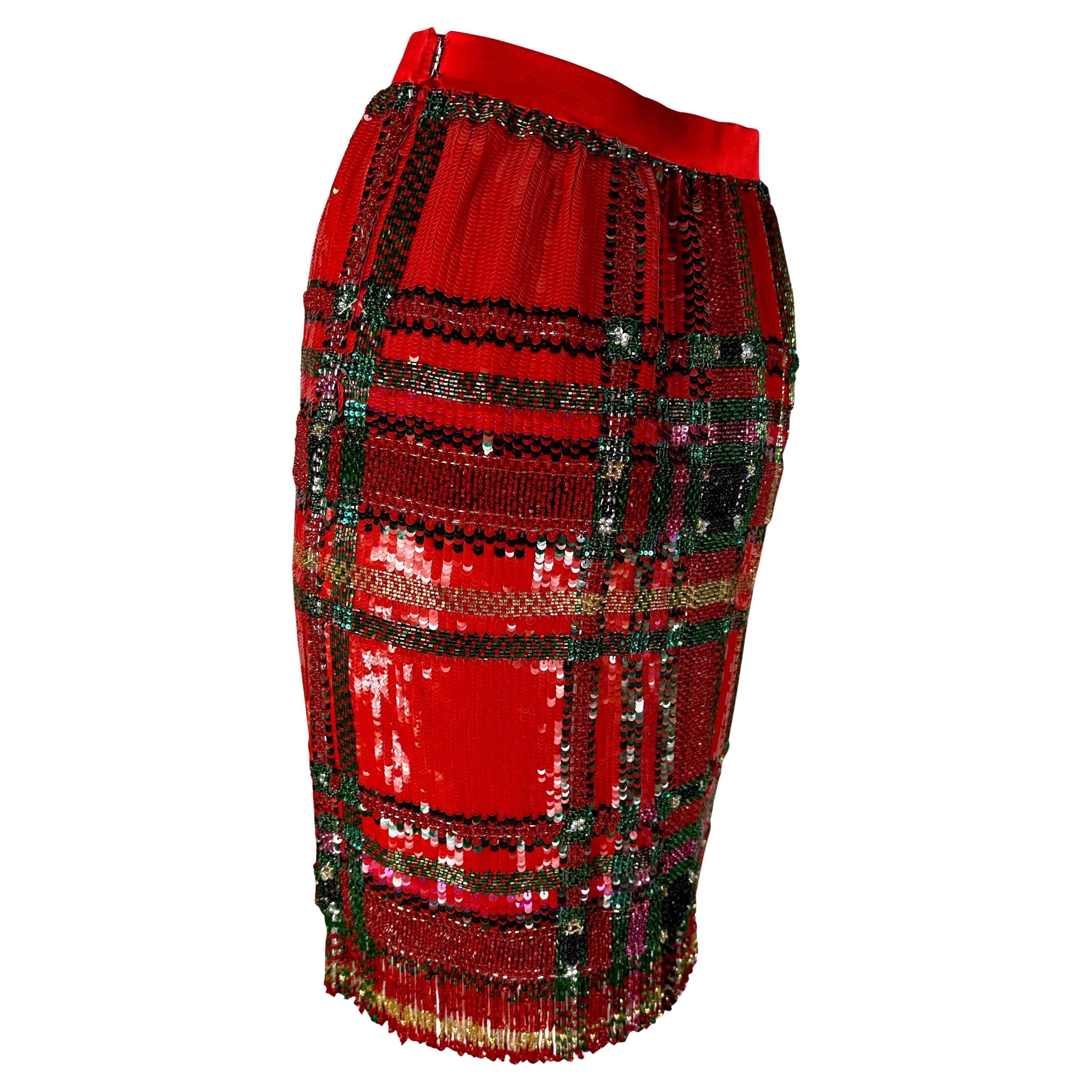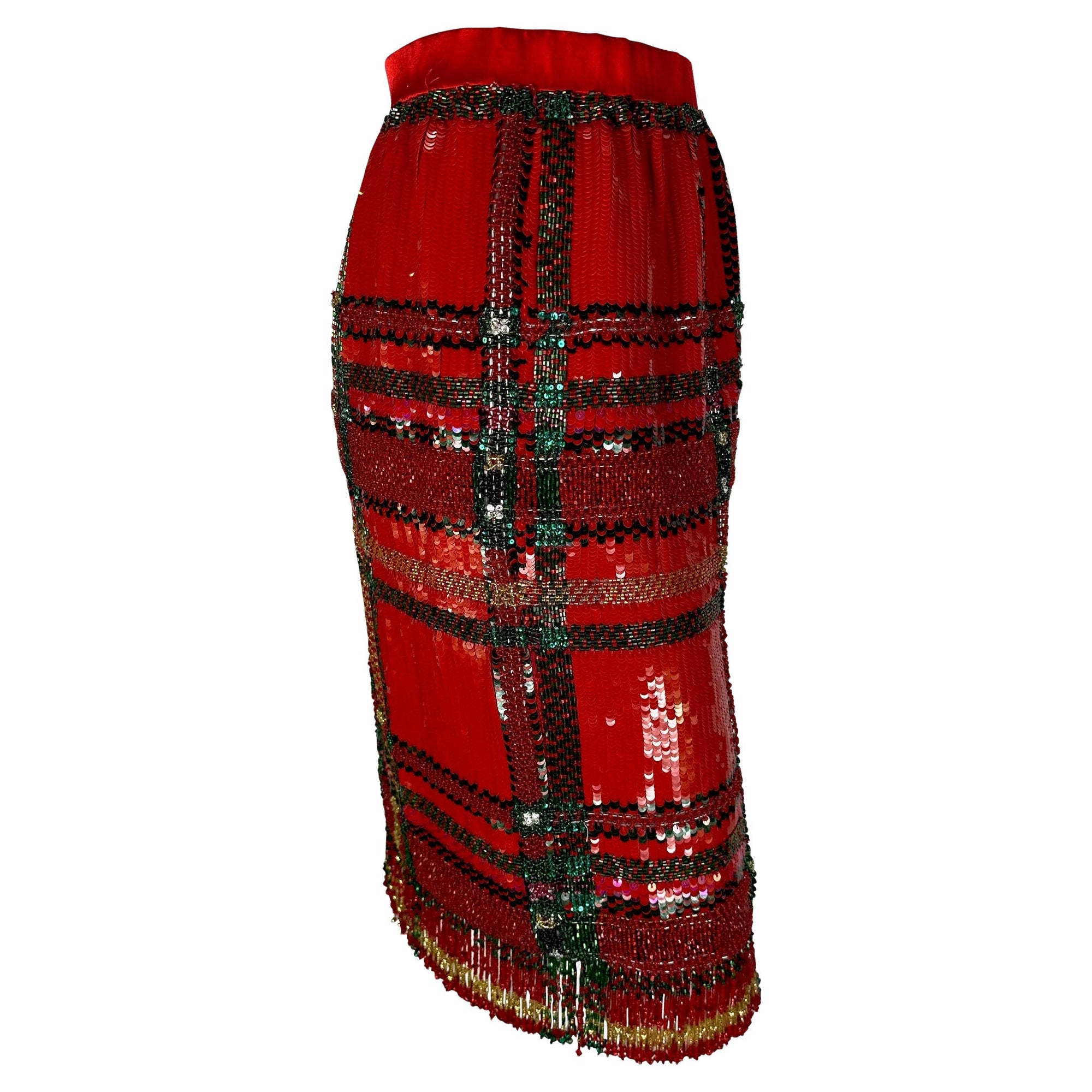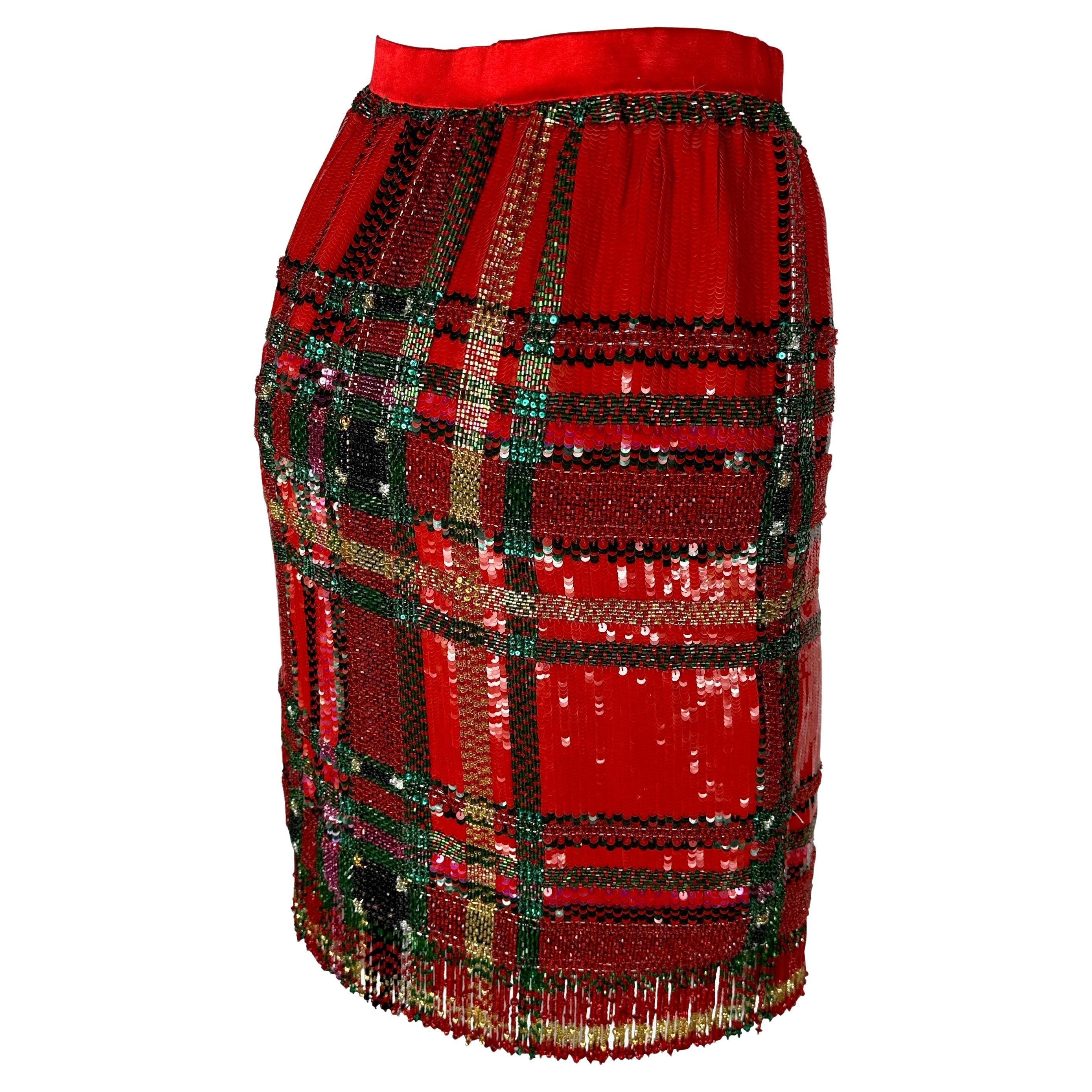 F/W 1991 Oscar de La Renta Runway Red Tartan Sequin Beaded Fringe Pencil Skirt