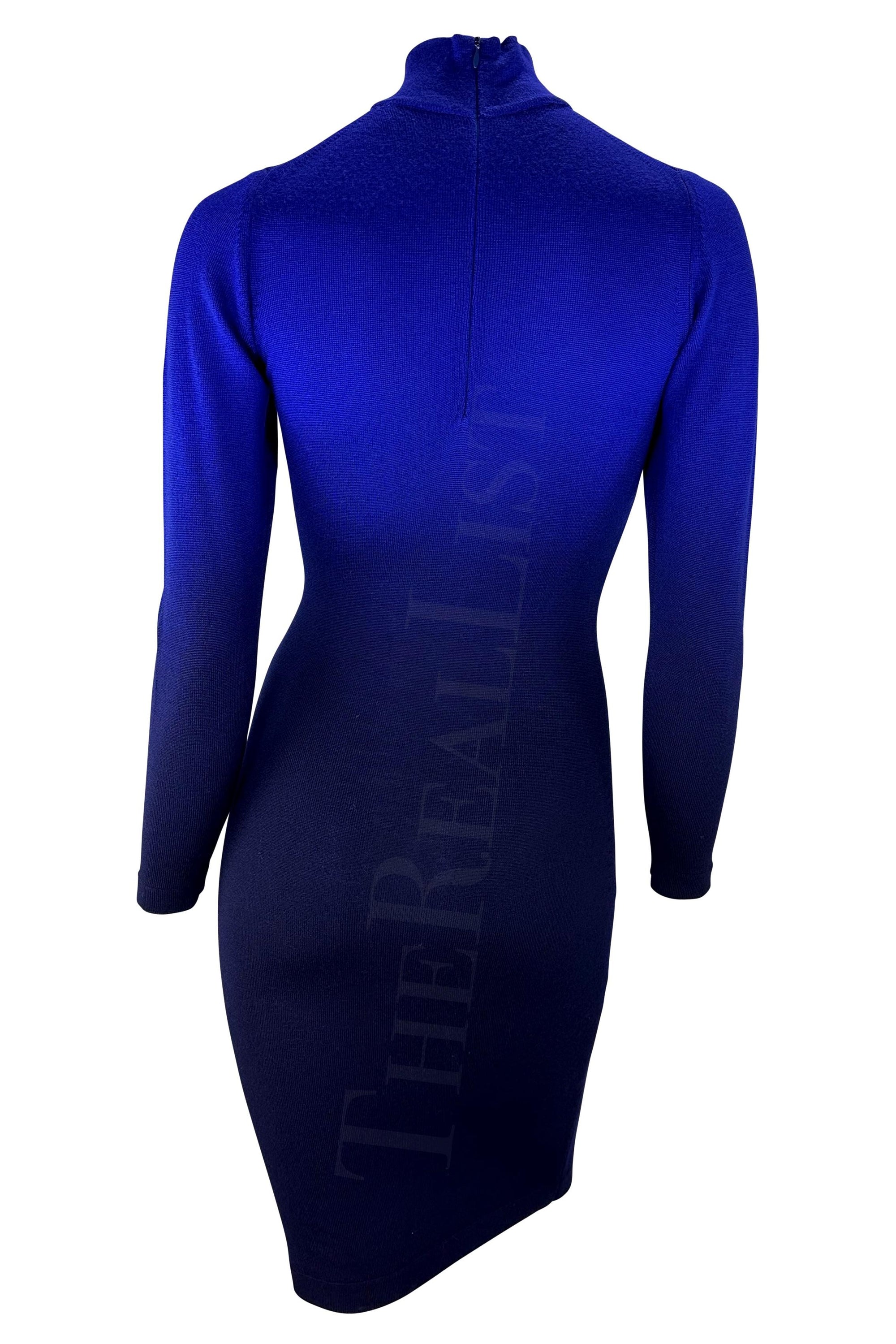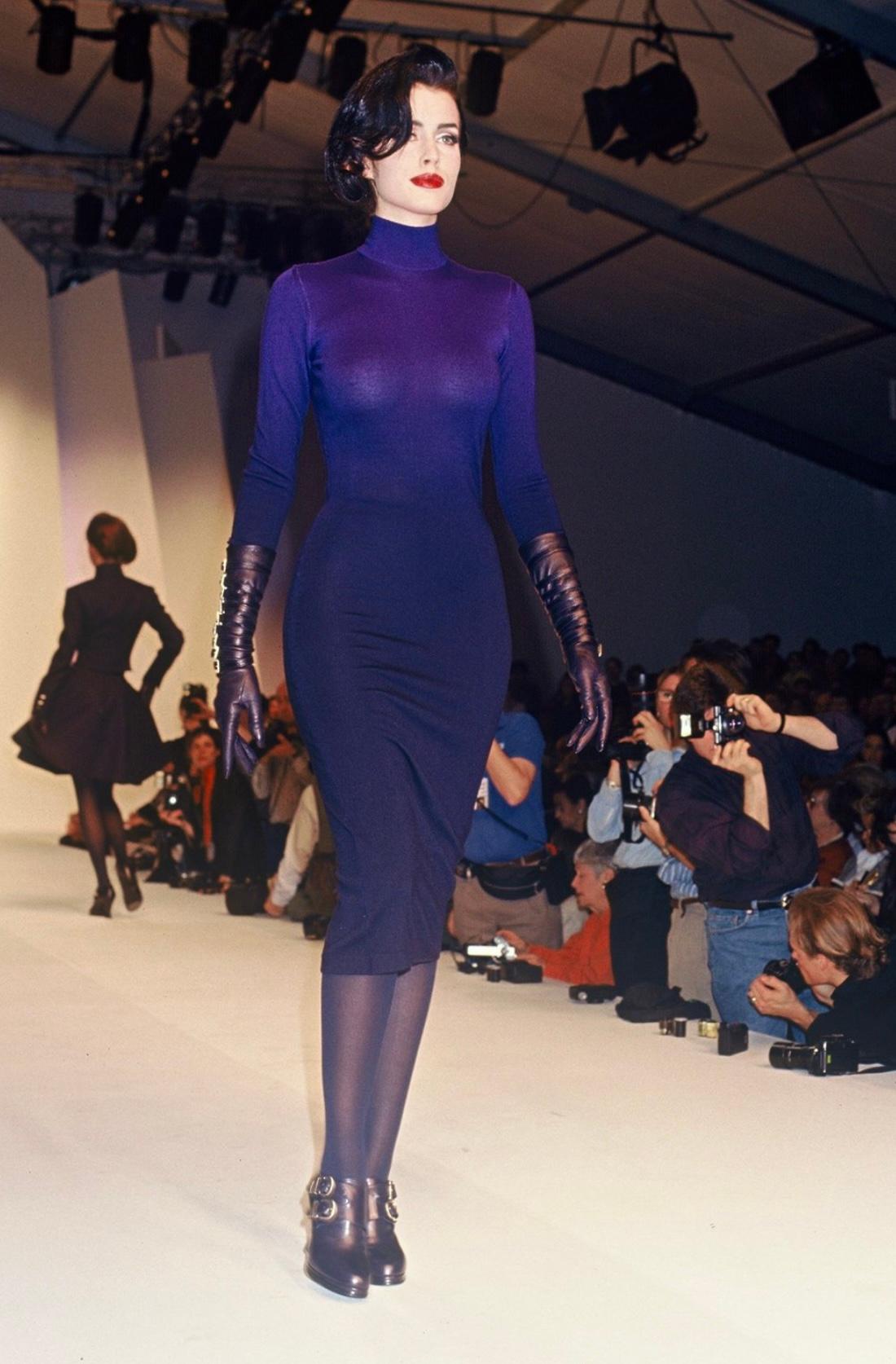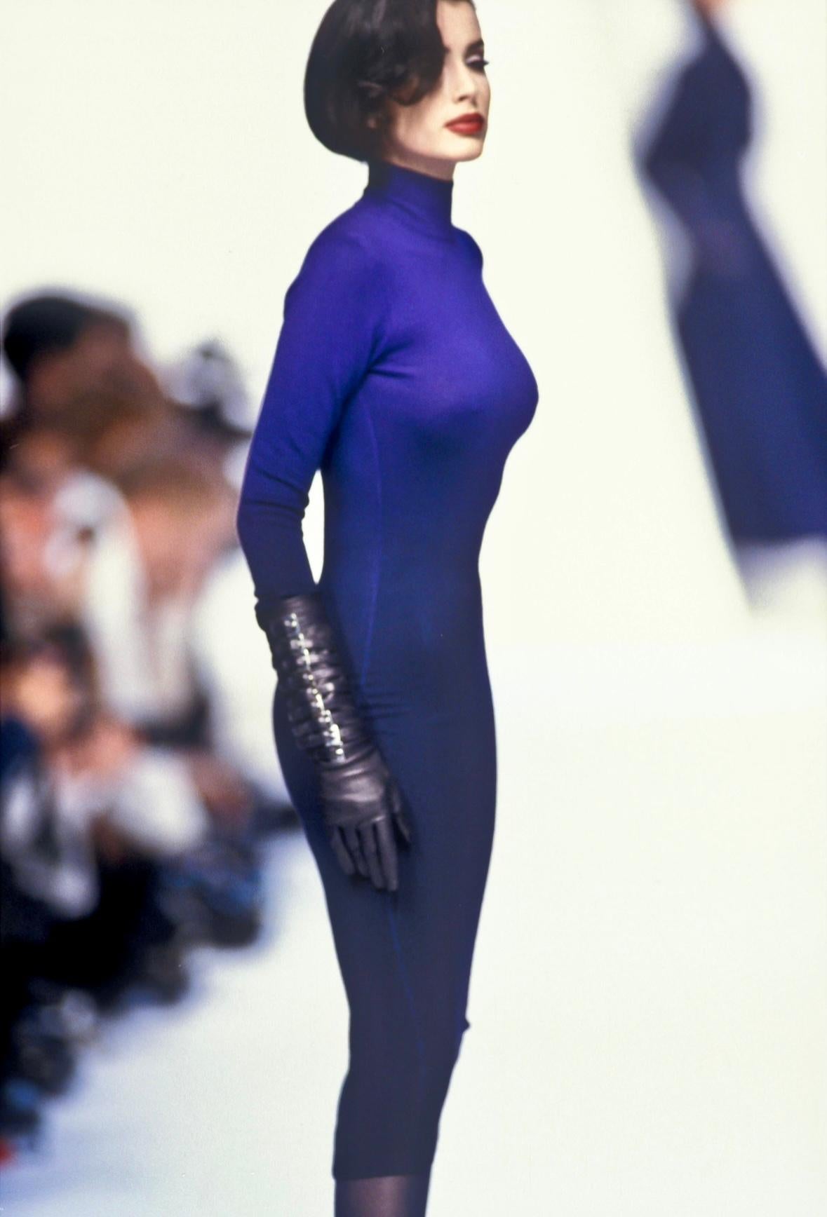 This indigo blue ombré knit dress from Claude Montana’s Fall/Winter 1992 collection is a documented runway piece. It debuted on the catwalk, modeled by Julie Anderson, and appeared in the season’s ad campaign with Susan Holmes, photographed by Tyen. The dress was also featured in Elle’s editorial “Paris Revealed: The New Season.” The form-fitting design includes a mock neckline and long sleeves, showcasing Montana’s sleek early-1990s aesthetic. A rare archival piece, it remains a striking example of the designer’s refined vision.