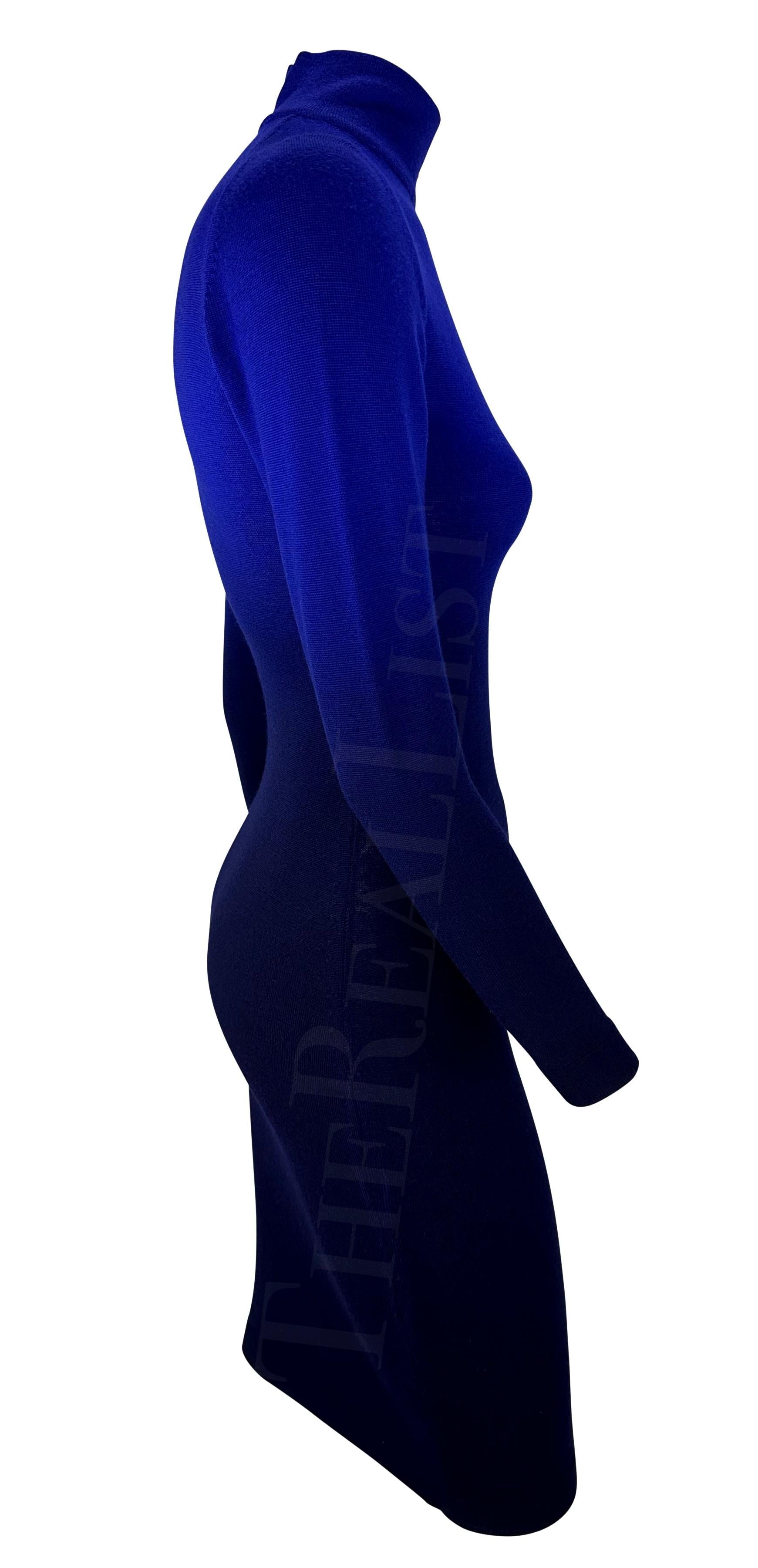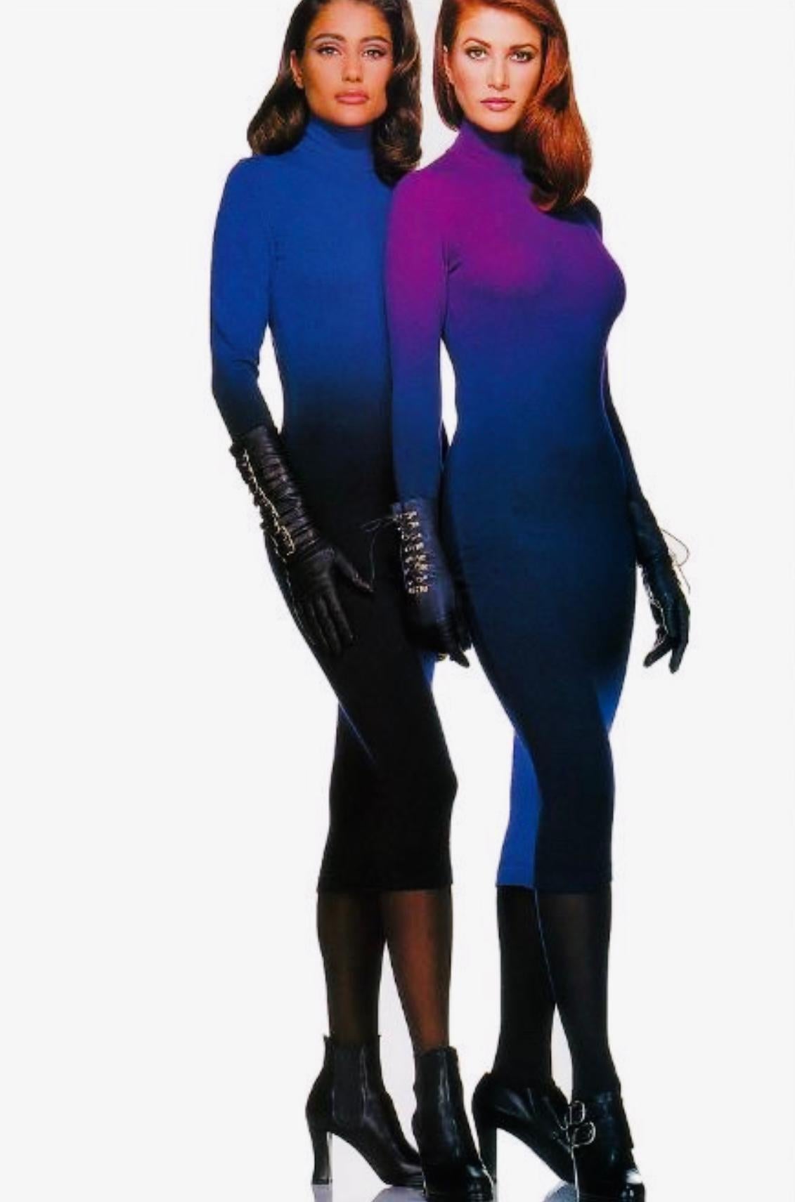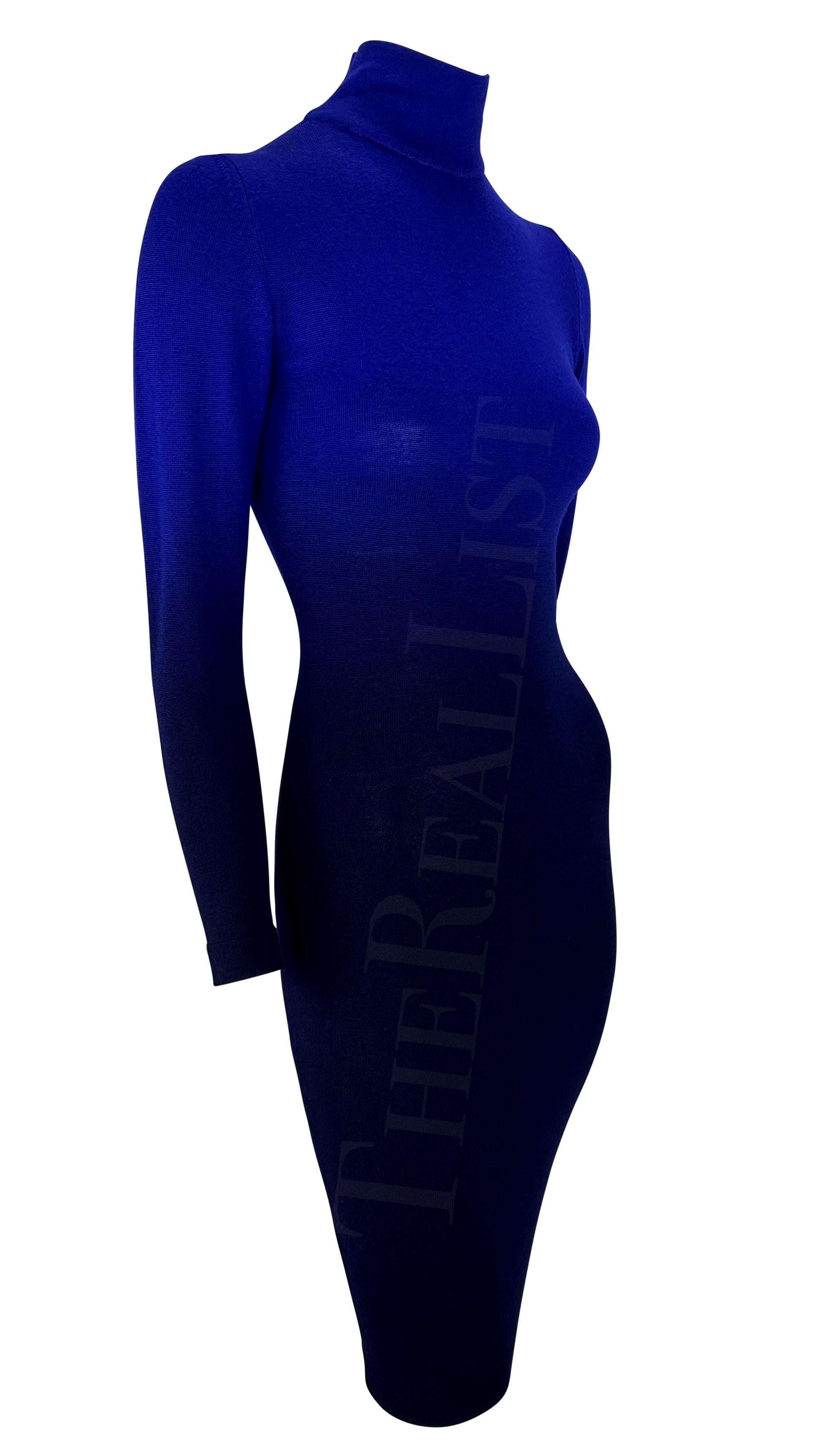 This indigo blue ombré knit dress from Claude Montana’s Fall/Winter 1992 collection is a documented runway piece. It debuted on the catwalk, modeled by Julie Anderson, and appeared in the season’s ad campaign with Susan Holmes, photographed by Tyen. The dress was also featured in Elle’s editorial “Paris Revealed: The New Season.” The form-fitting design includes a mock neckline and long sleeves, showcasing Montana’s sleek early-1990s aesthetic. A rare archival piece, it remains a striking example of the designer’s refined vision.