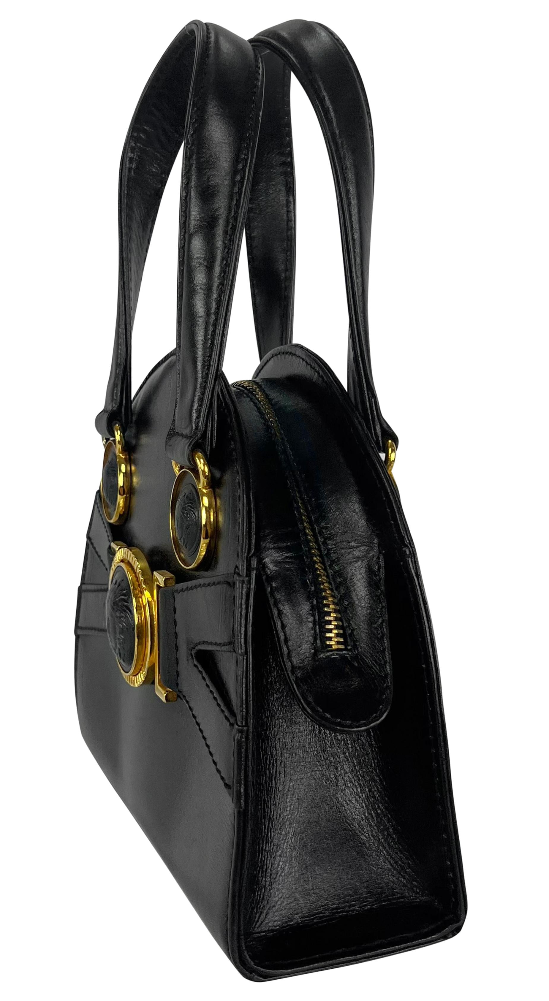 This Gianni Versace black leather mini bag from the Fall/Winter 1992 collection features signature bondage straps and gold-tone Medusa hardware. The bag comes with dual top handles and a removable crossbody strap, offering versatile carrying options.