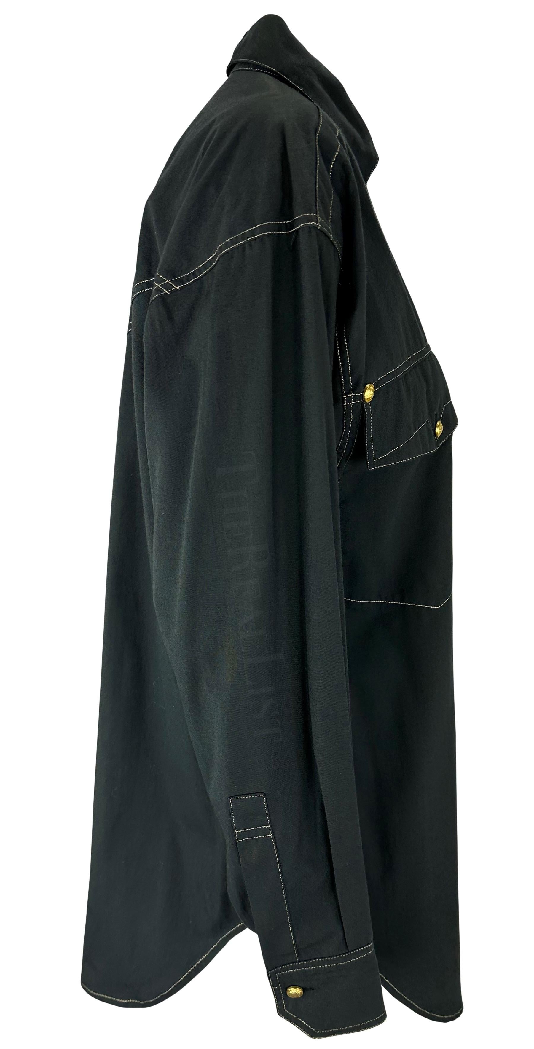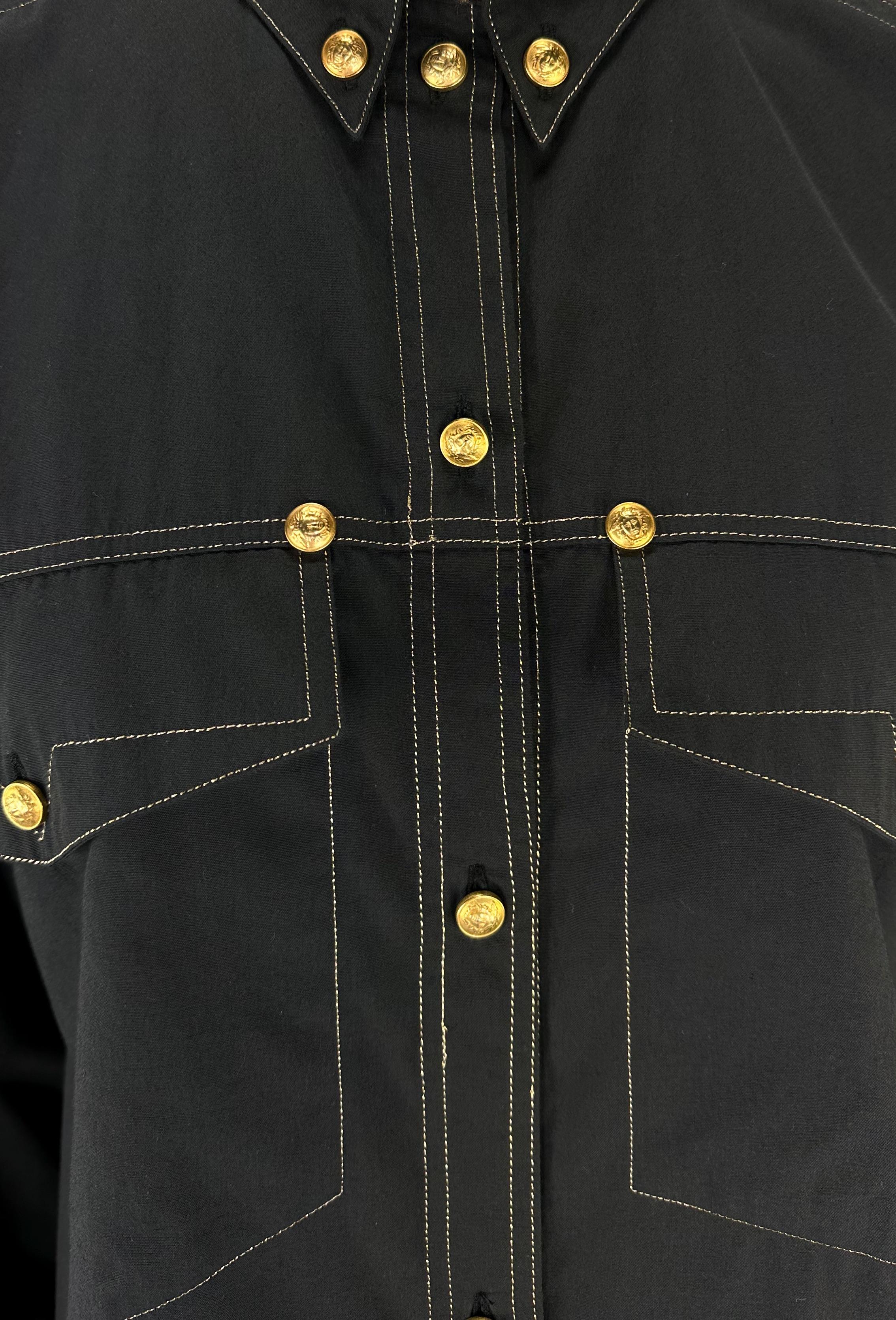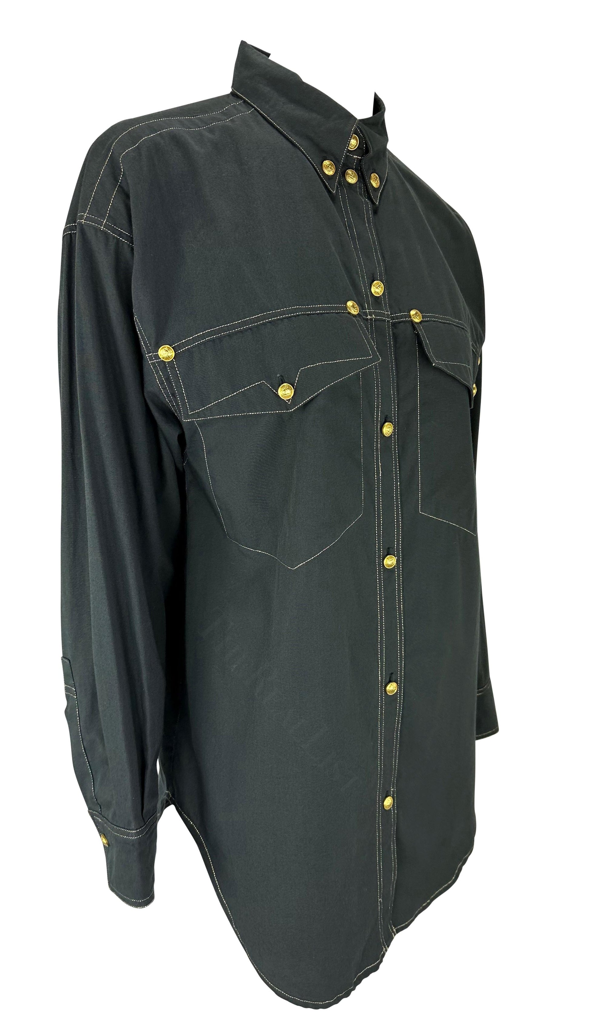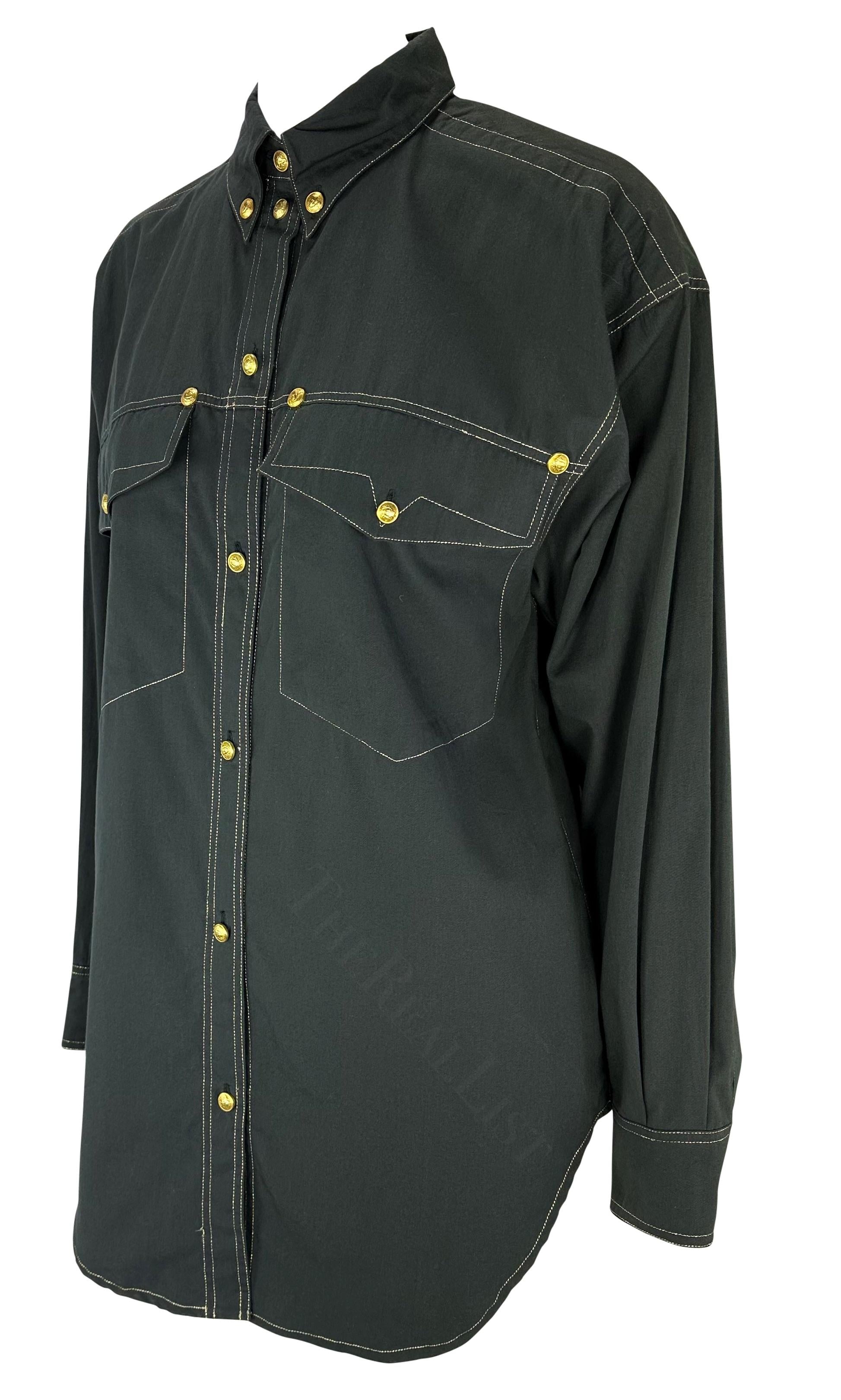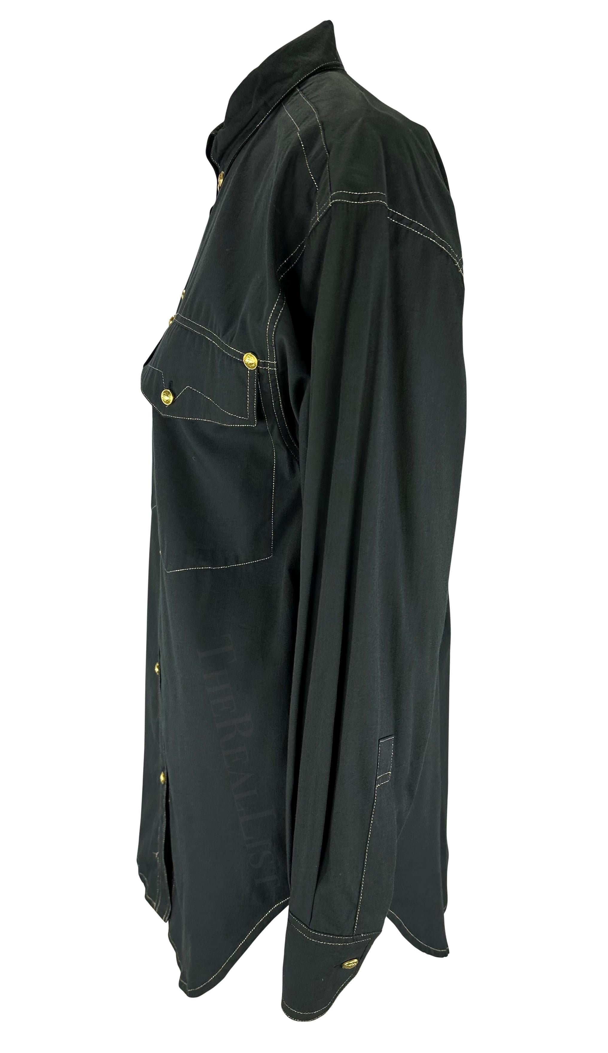 Presenting a fabulous black button-down Gianni Versace shirt, designed by Gianni Versace. From the Fall/Winter 1992 collection, this Western-inspired shirt is covered in gold-tone Versace Medusa relief buttons and studs. This oversized top features two large pockets at the bust and gold stitching.
