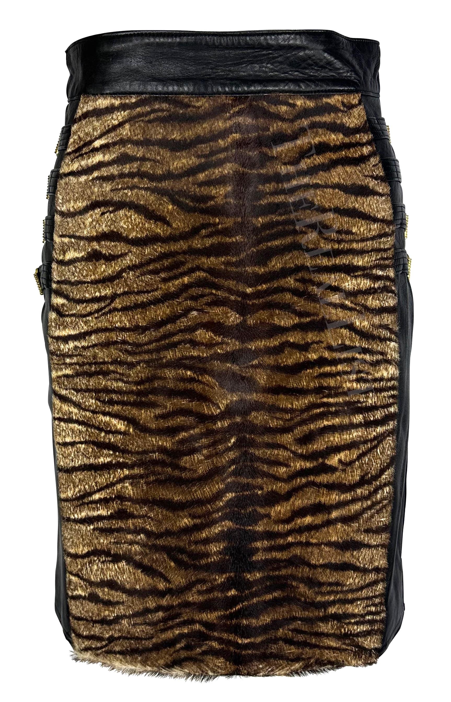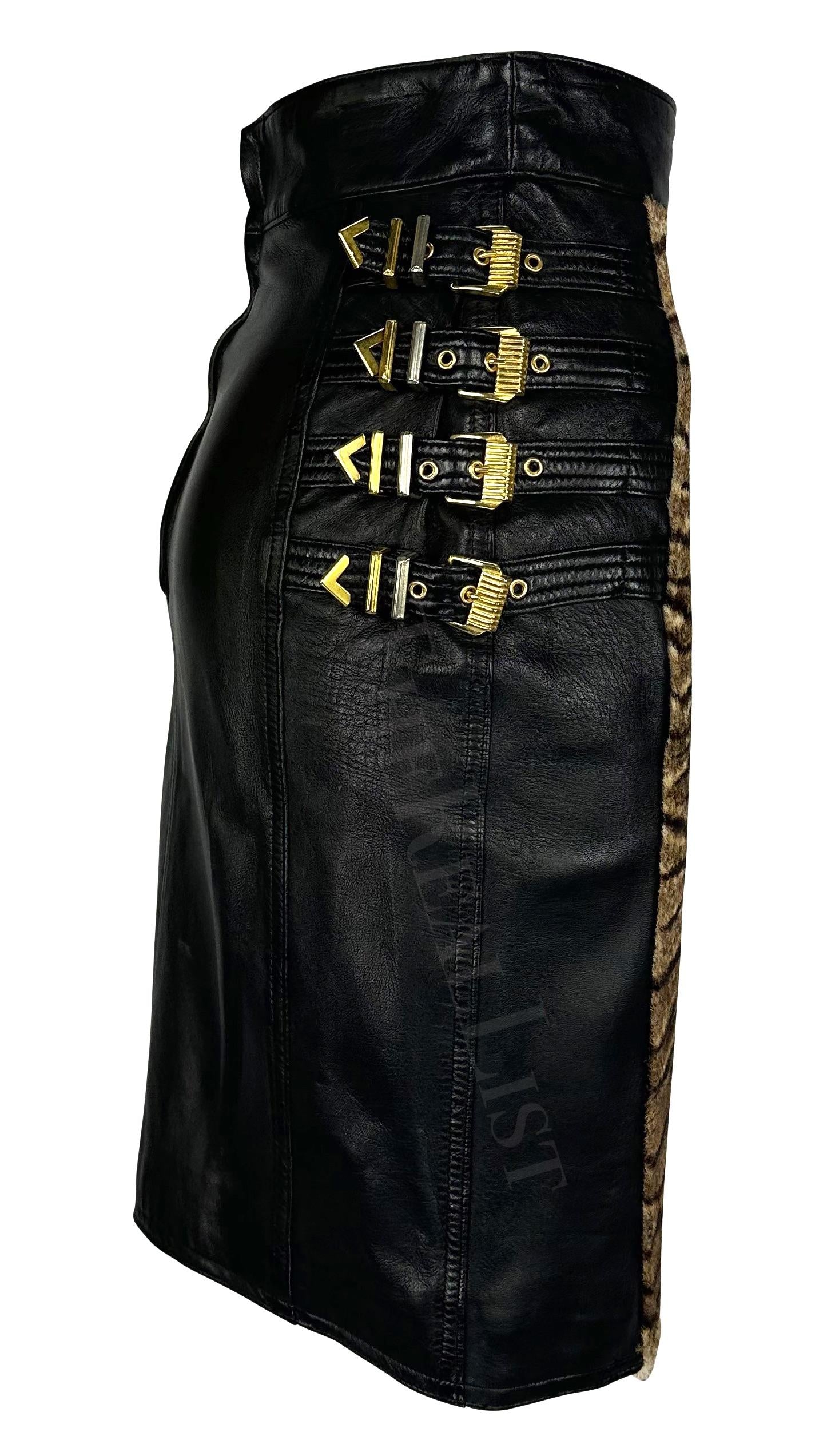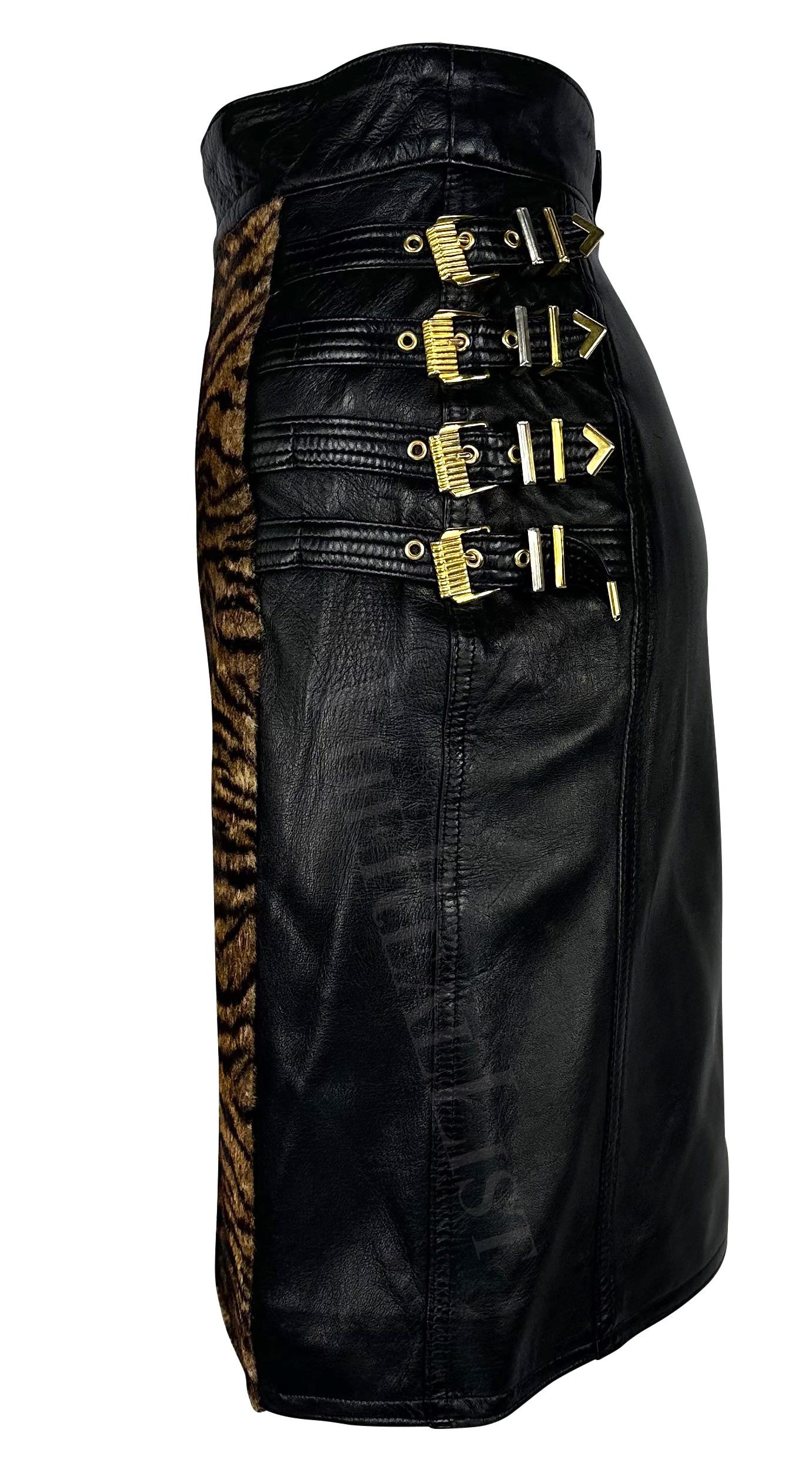 Presenting a fabulous black leather and pony hair Gianni Versace skirt, designed by Gianni Versace. From the Fall/Winter 1992 'Miss S&M' collection, this skirt is constructed of black leather with a tiger-print pony hair panel at the front. This high-waisted skirt is complete with the collection's infamous gold-tone bondage buckles on either side.