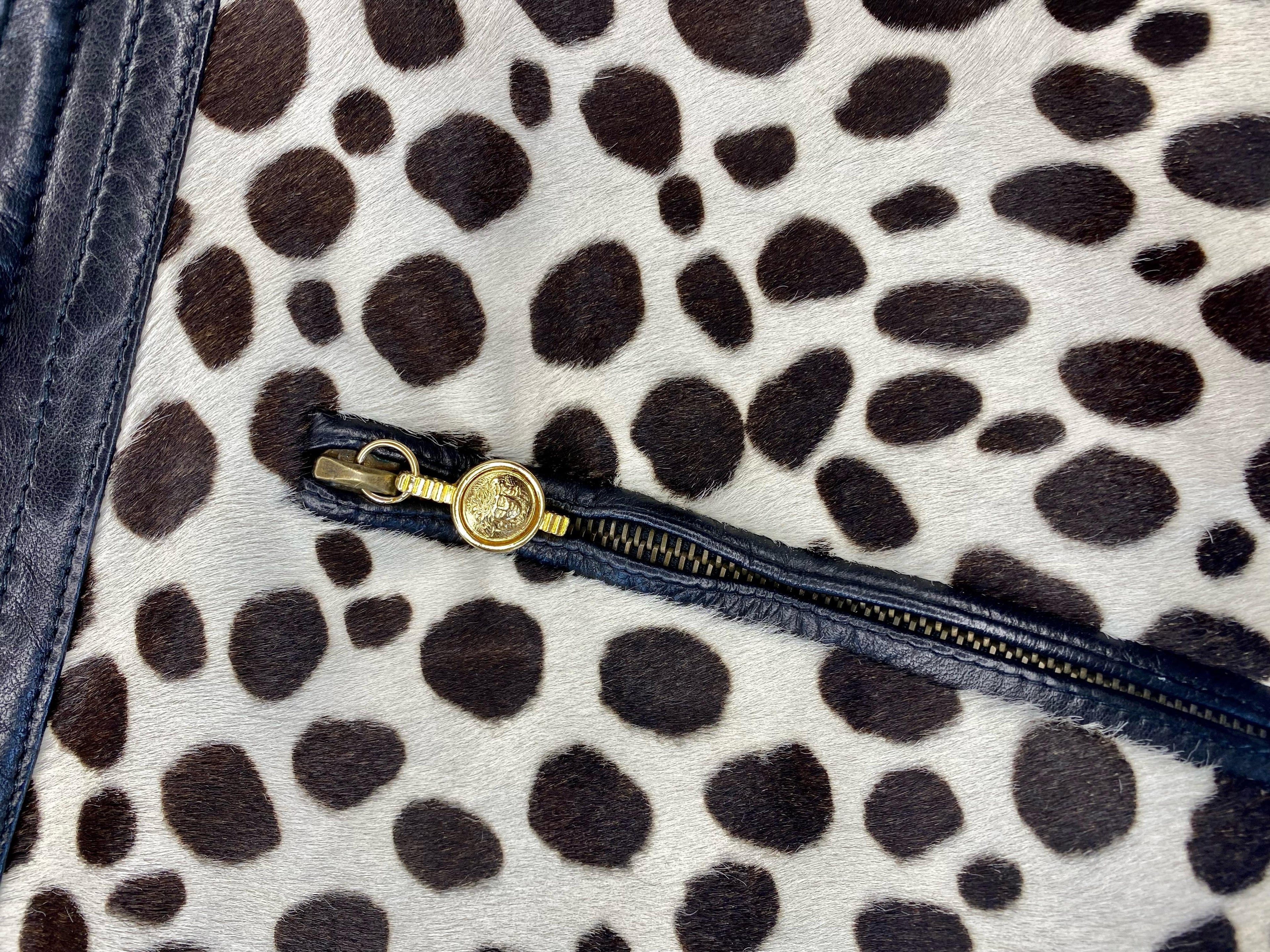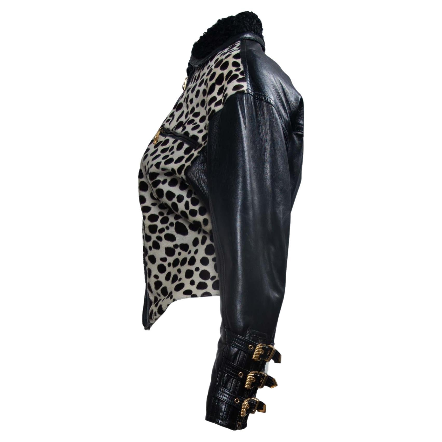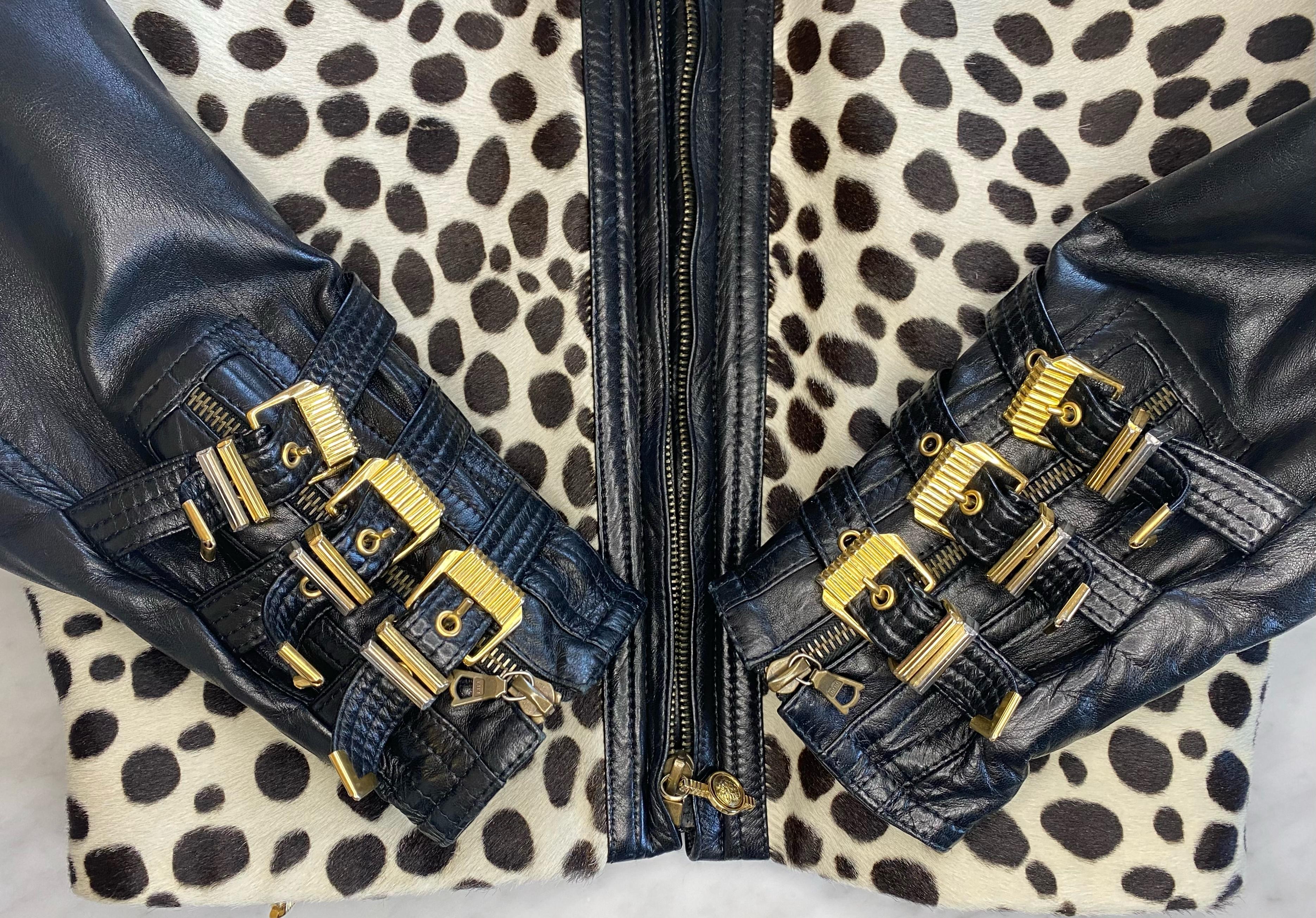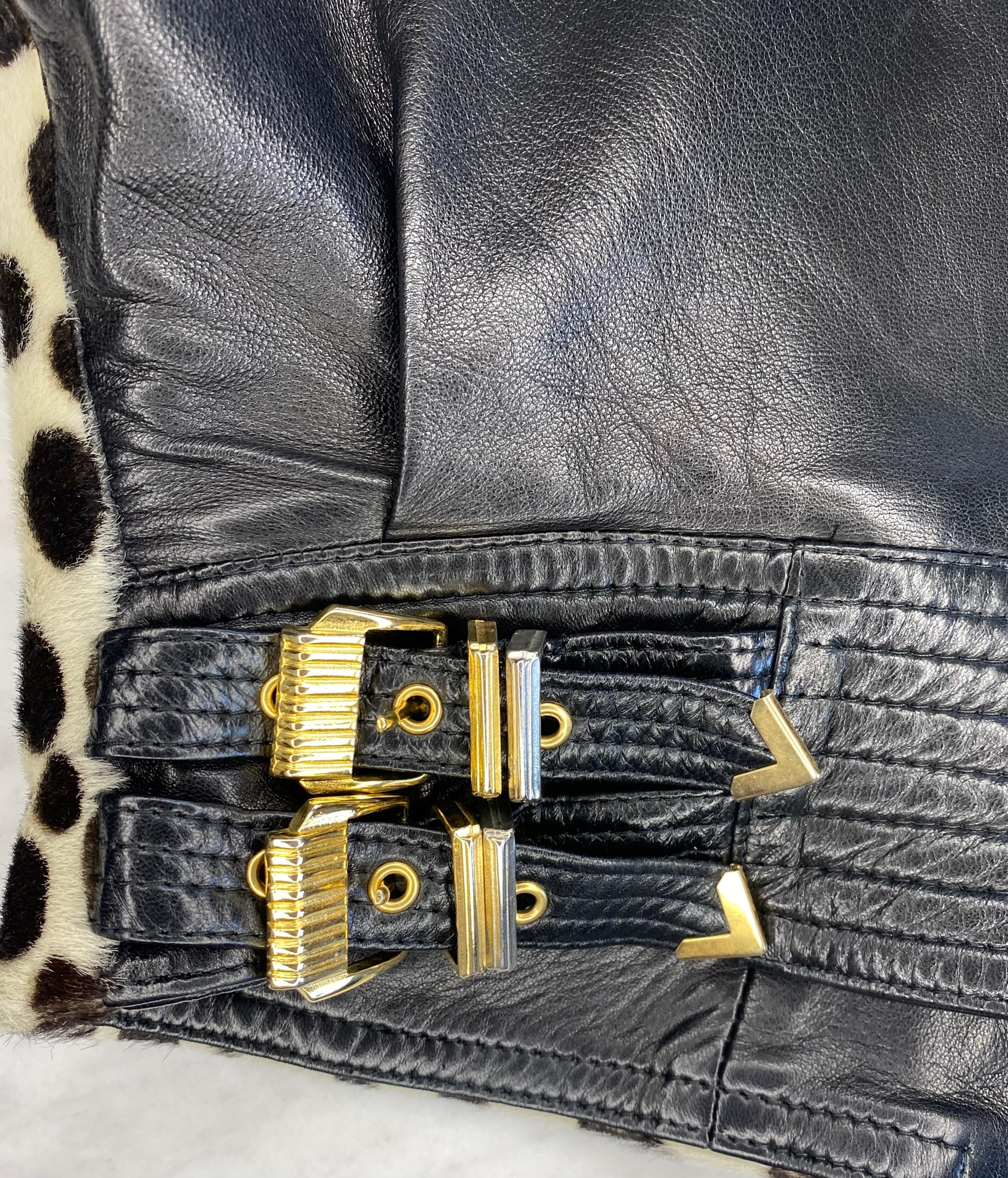 Presenting a Miss S&M (Bondage) spotted calf hair leather buckled jacket designed by Gianni Versace. This piece was created for the F/W 1992 collection and features the collection's iconic bondage-inspired buckles throughout. The jacket is primarily constructed of black leather, as seen on the sleeves and back of the piece. The front features black and white spot-printed pony hair with two gold Medusa zippers at the breast pockets. The collar is made of curly black Persian lamb fur. The infamous buckles are at the back of the jacket near the hips and cuffs. Be sure to check out our other pieces from this collection!