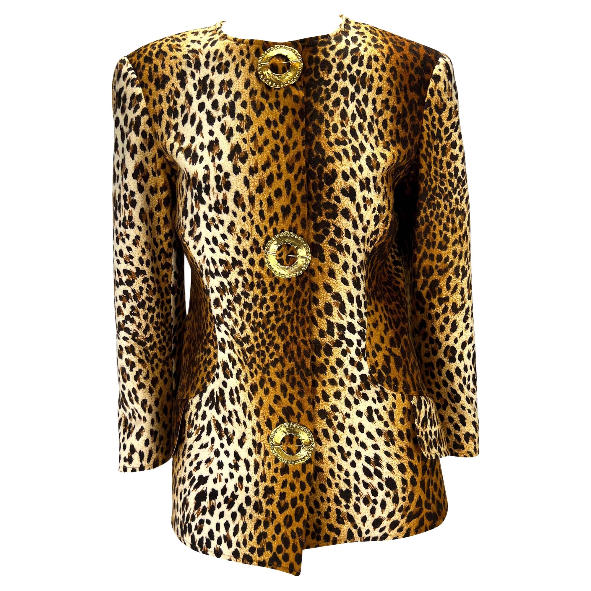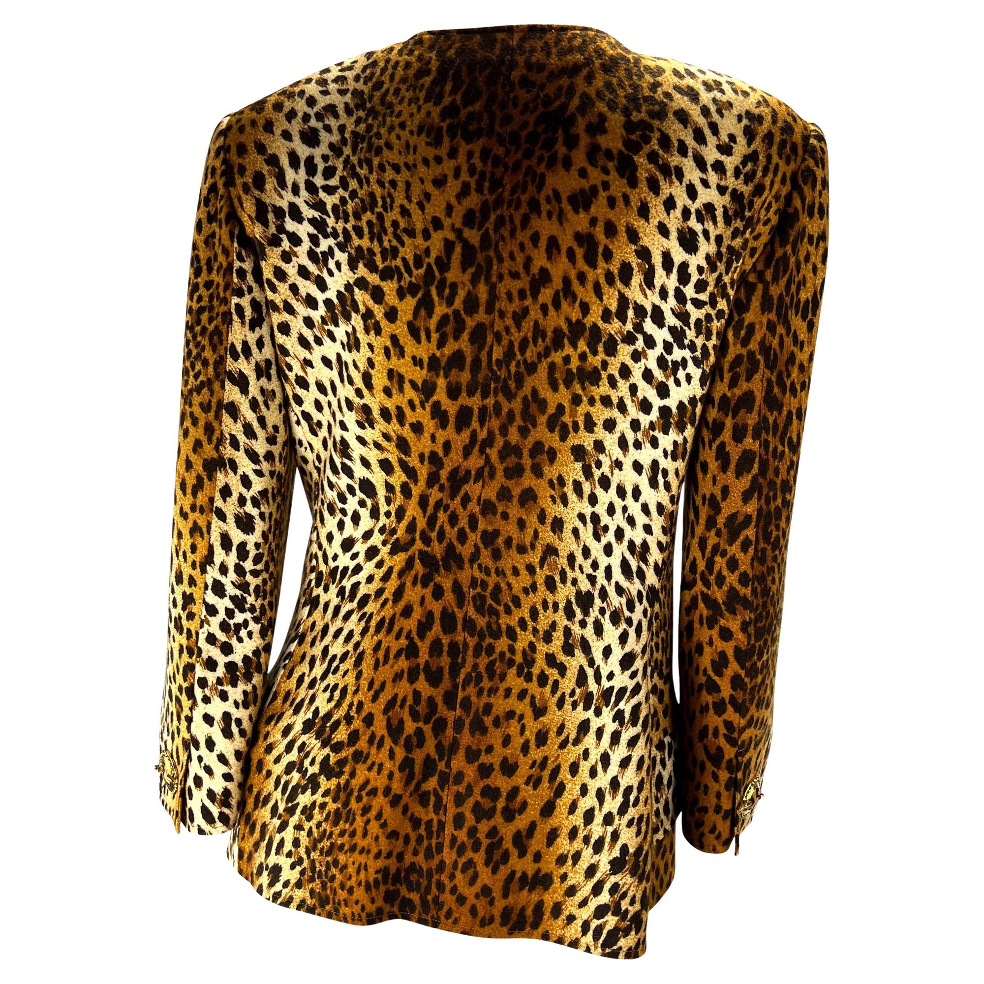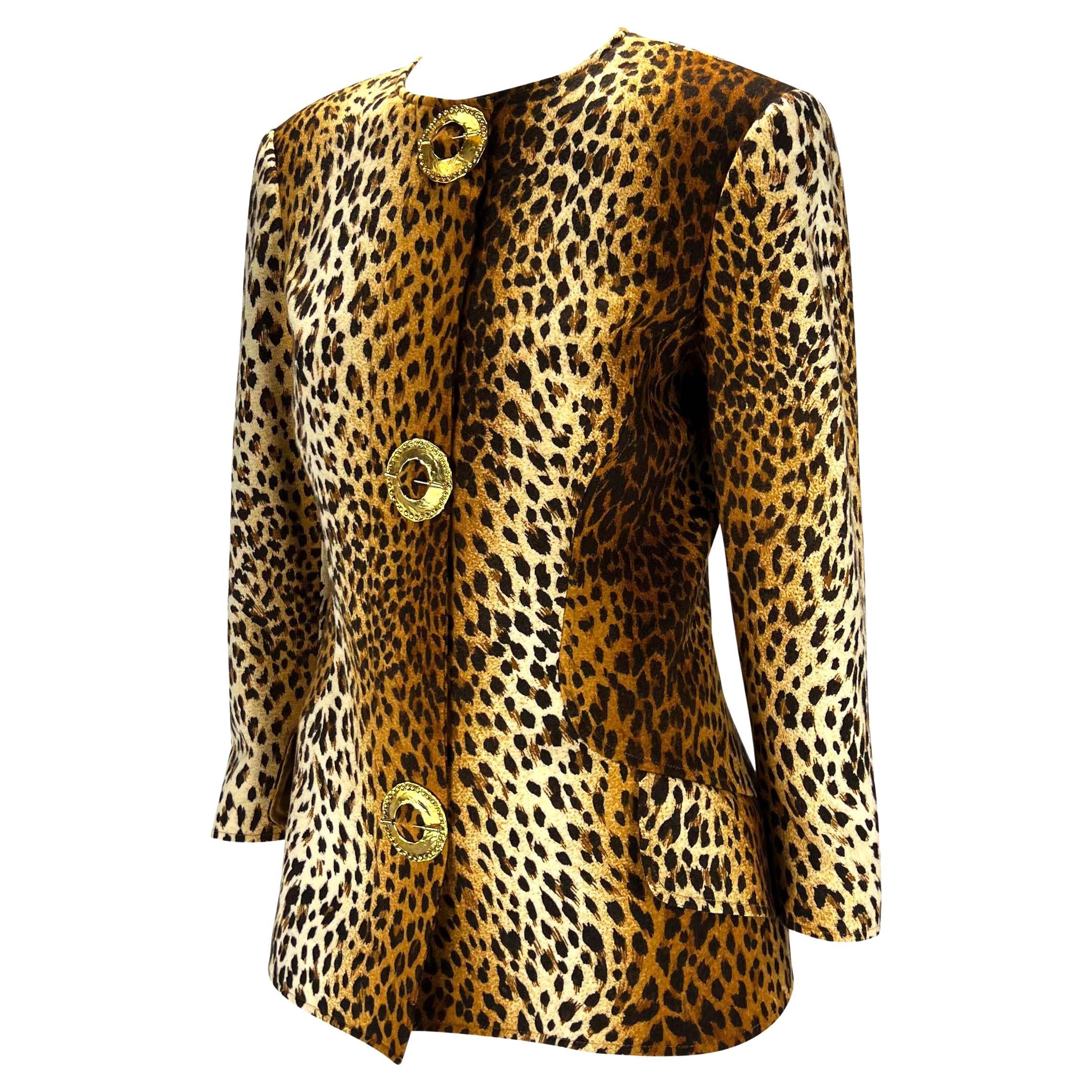 This Valentino blazer from the Fall/Winter 1992 collection debuted on the season’s runway. Tailored in leopard-print felt, the design features a zip closure concealed by gold-tone brooches placed along the front and at the cuffs. A striking example of early 1990s Valentino, the piece embodies the era’s bold glamour.