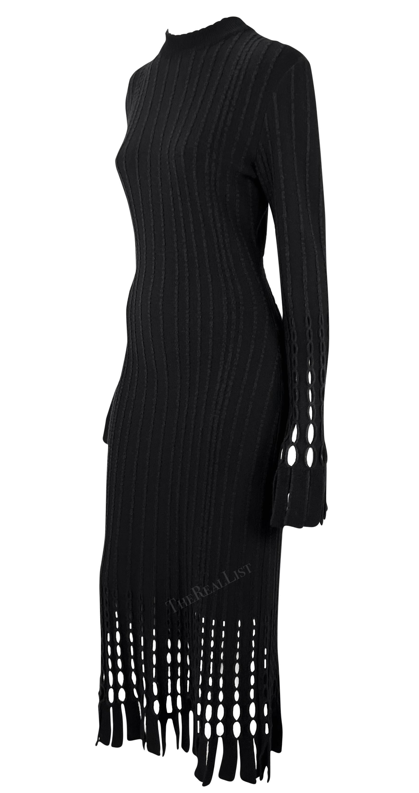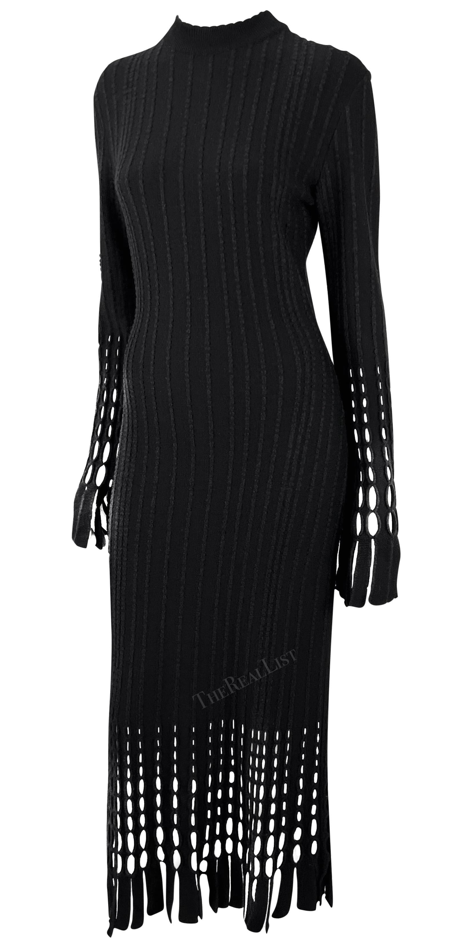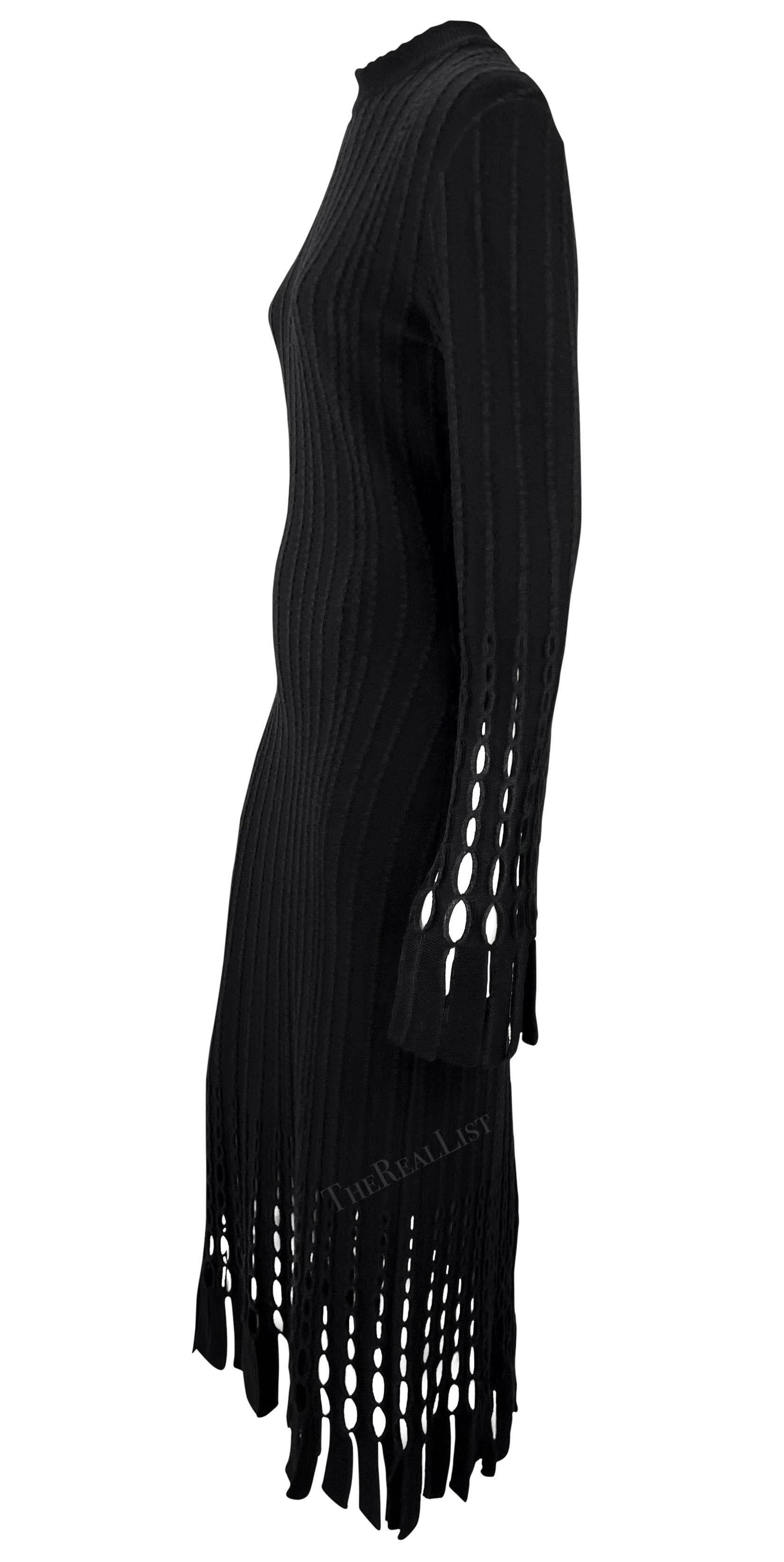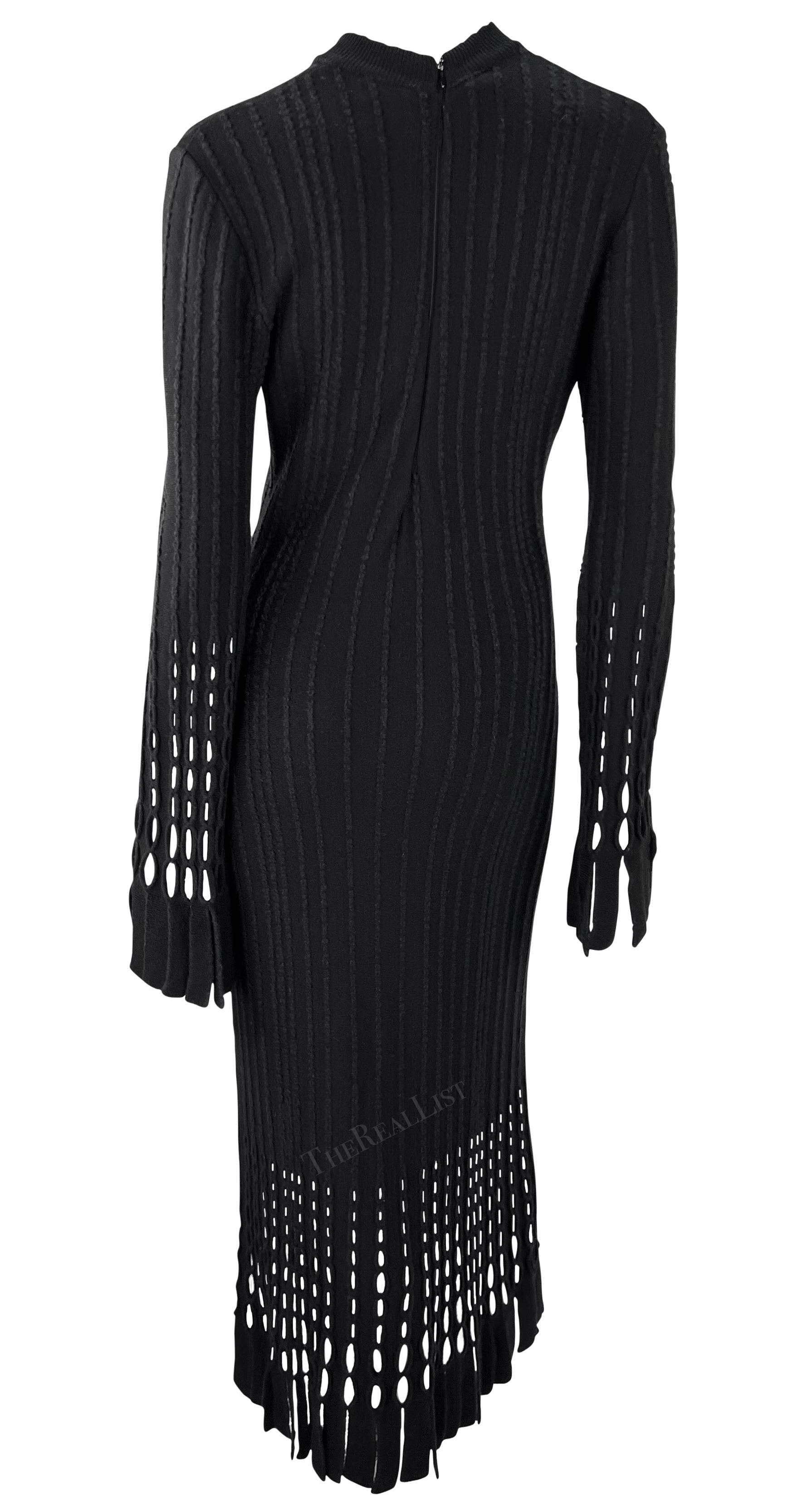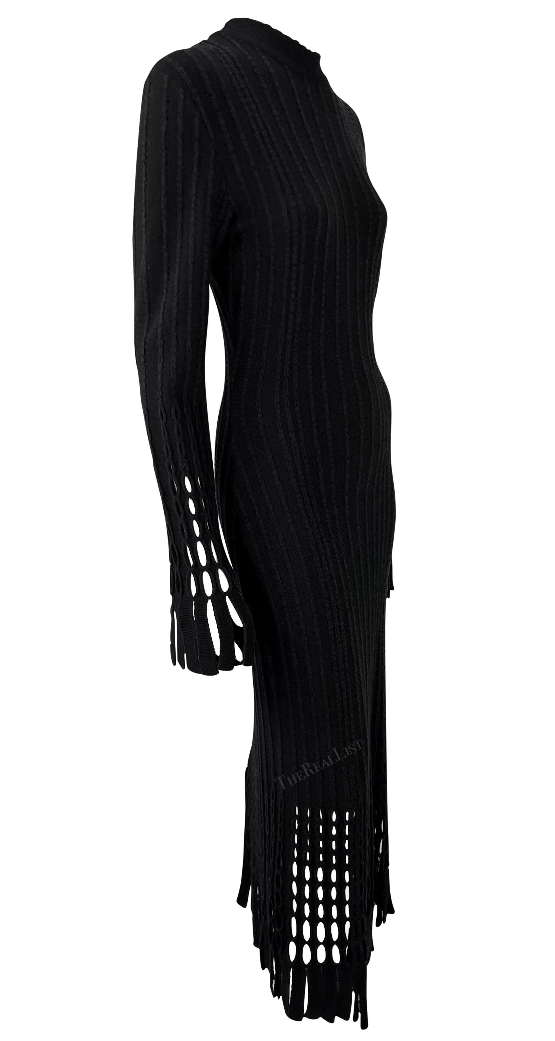 Presenting a stunning black knit maxi dress designed by Azzedine Alaia from the Fall/Winter 1993 collection. This exquisite dress showcases a unique laser-cut technique, with intricate details seen in advertisements from that year. The entire dress is knit with vertical stripes, complemented by a scalloped mock neck. What makes this dress particularly striking are the laser-cut elements that form delicate cutouts and end in fringe at the hem and cuffs. This vintage Alaia dress, with its form-fitting silhouette, is designed to impress.