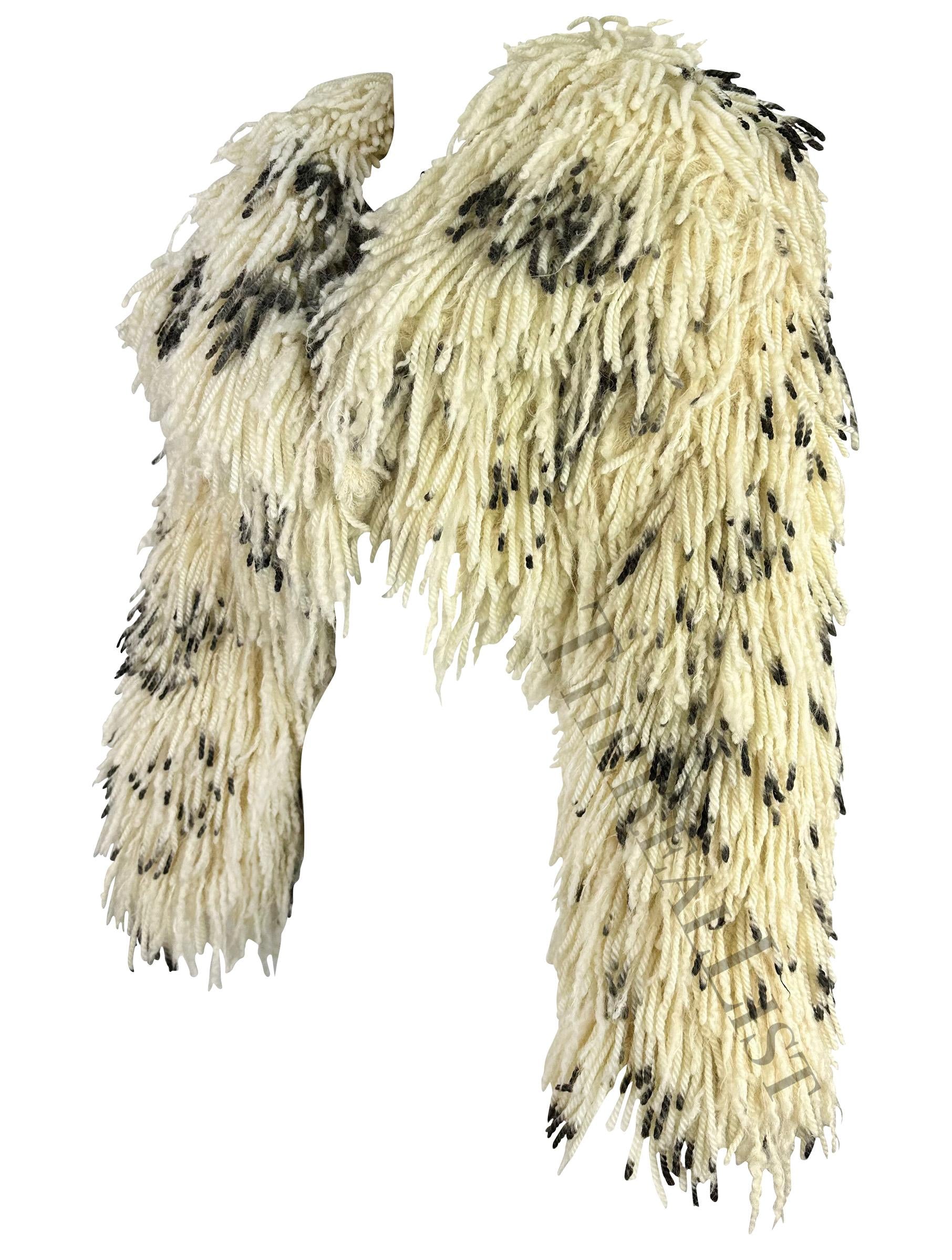 Presenting an incredible creme fringe Atelier Versace cropped coat. From the Fall/Winter 1994 collection, this voluminous coat is constructed of creme wool fringe with black spots scattered throughout. Similar shag fringe coats debuted on the season's runway. This custom piece was created by hand and is the perfect unique addition to any modern wardrobe!