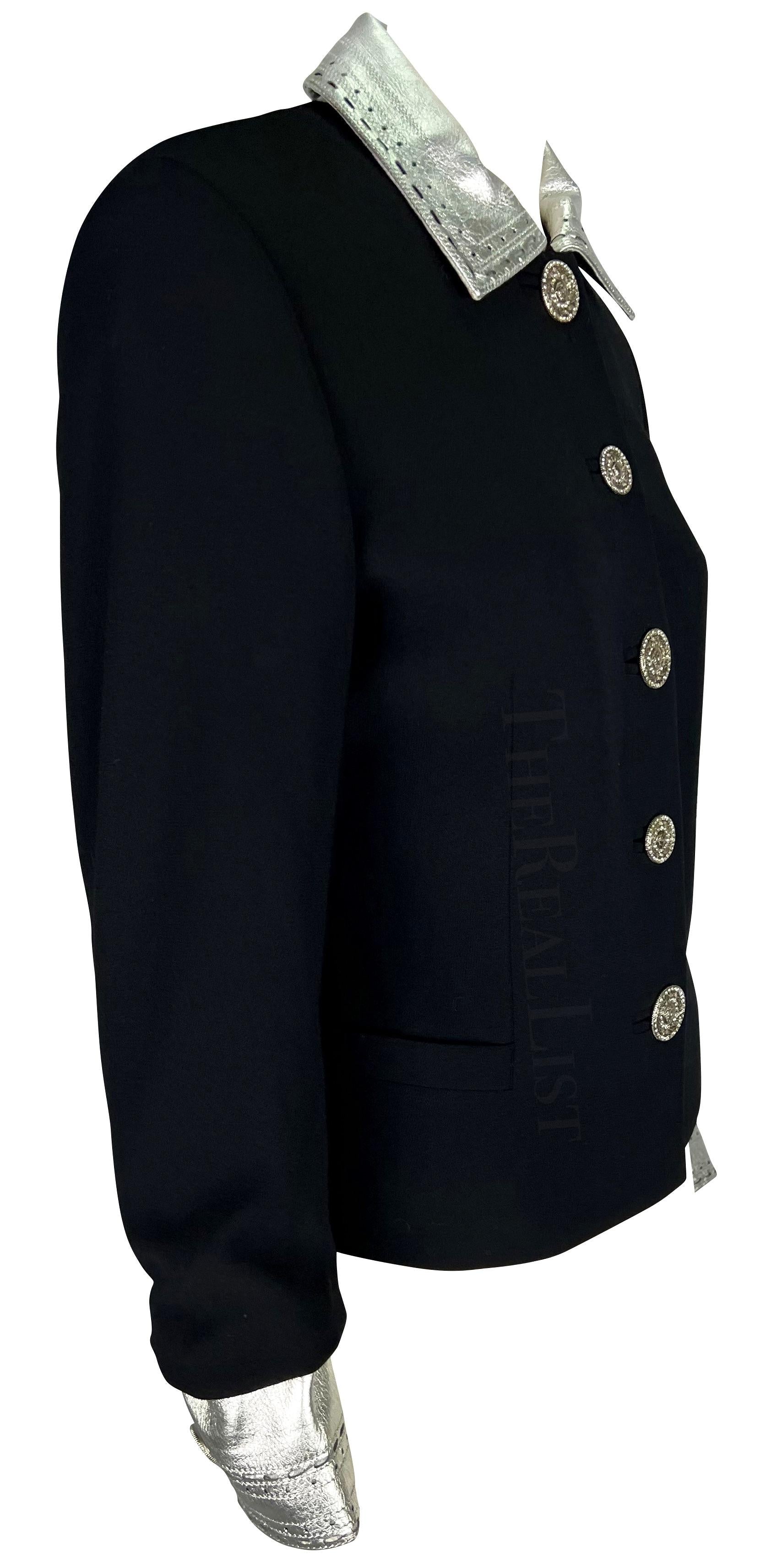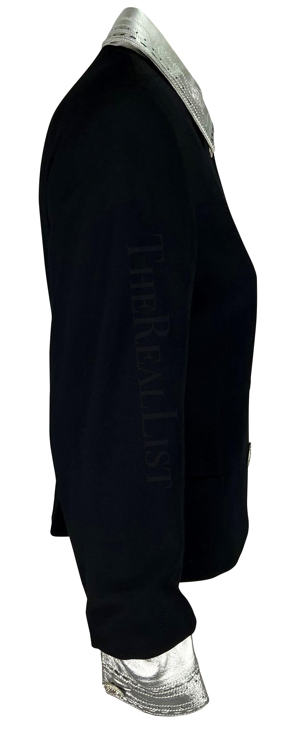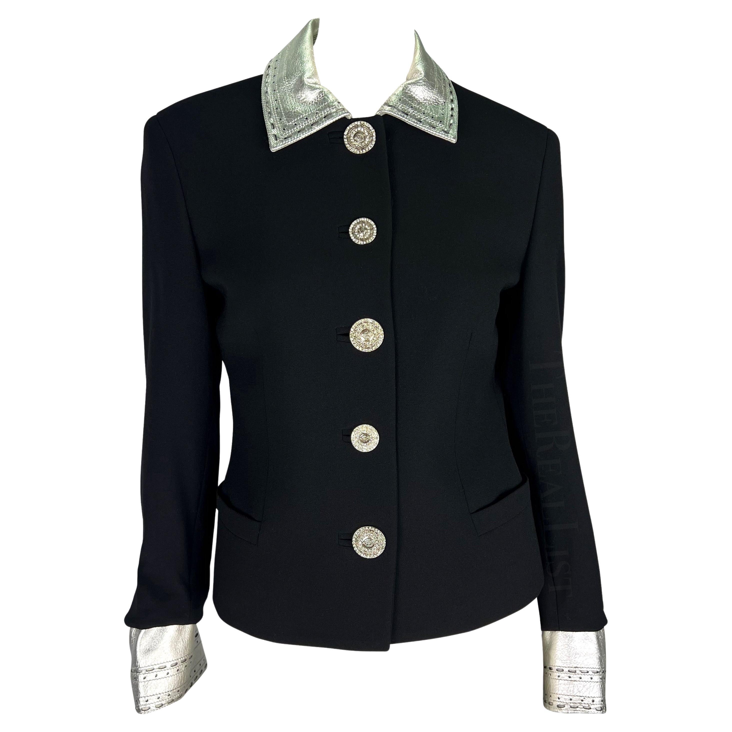 Presenting a black Gianni Versace leather accented jacket, designed by Gianni Versace. From the Fall/Winter 1994 collection, this jacket showcases a perfect fusion of sophistication and edge. The silver-tone rhinestone accented Versace Medusa relief button closure adds a touch of glamour, while the folded collar and cuffs, meticulously crafted using silver-tone metallic leather, lend a modern twist. A statement piece that effortlessly embodies elegance and innovation, this jacket is a true fashion statement for the style-savvy.