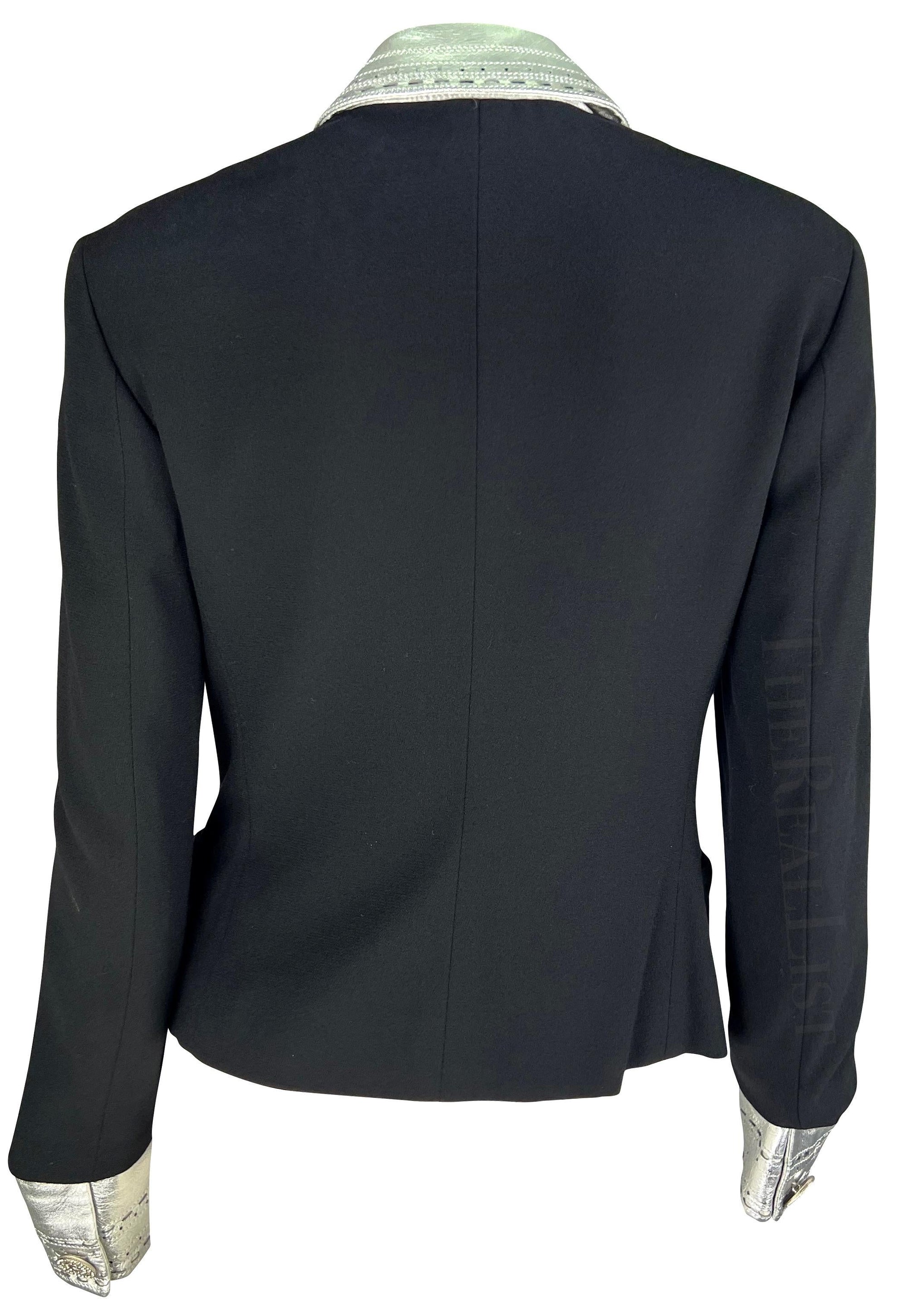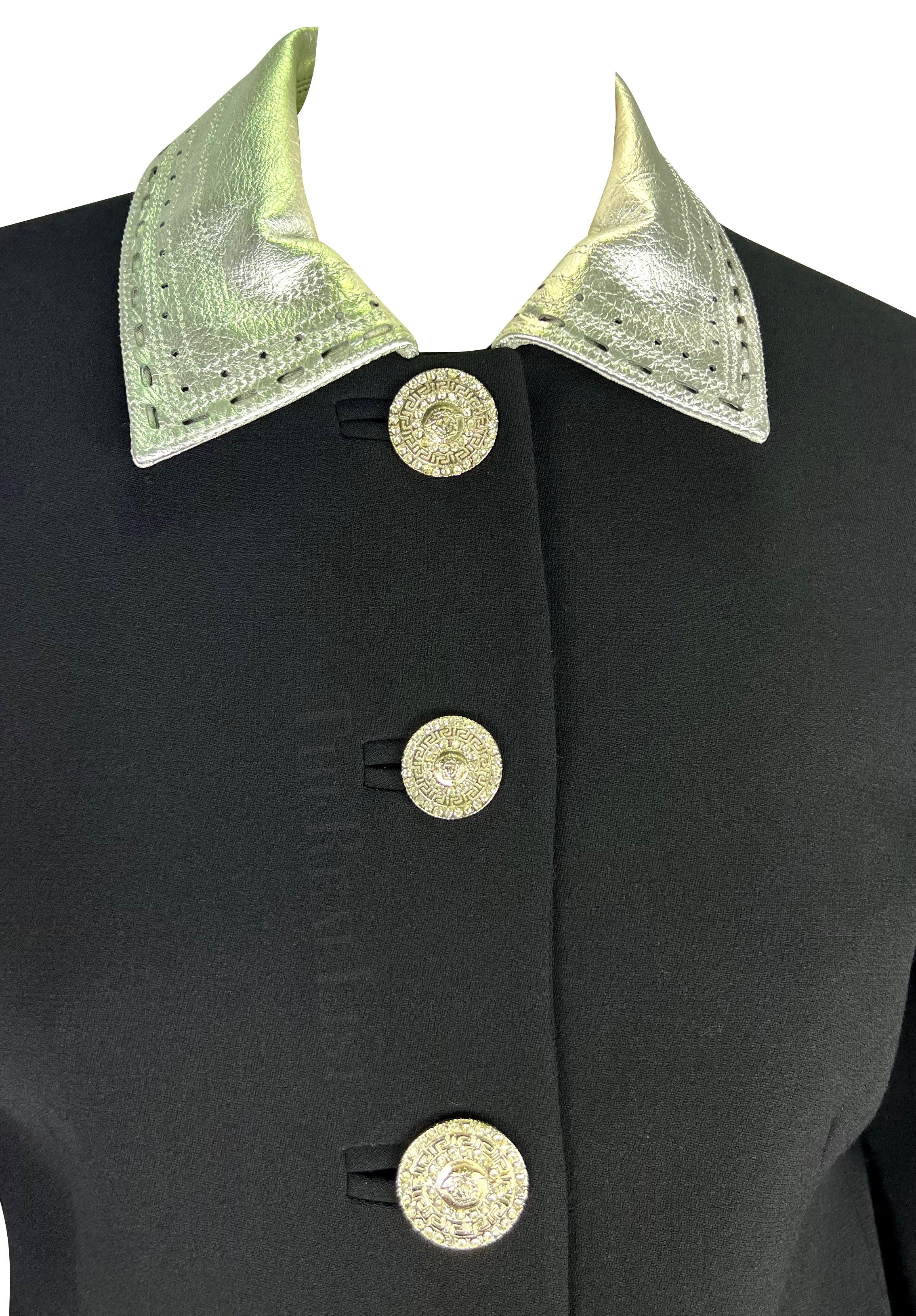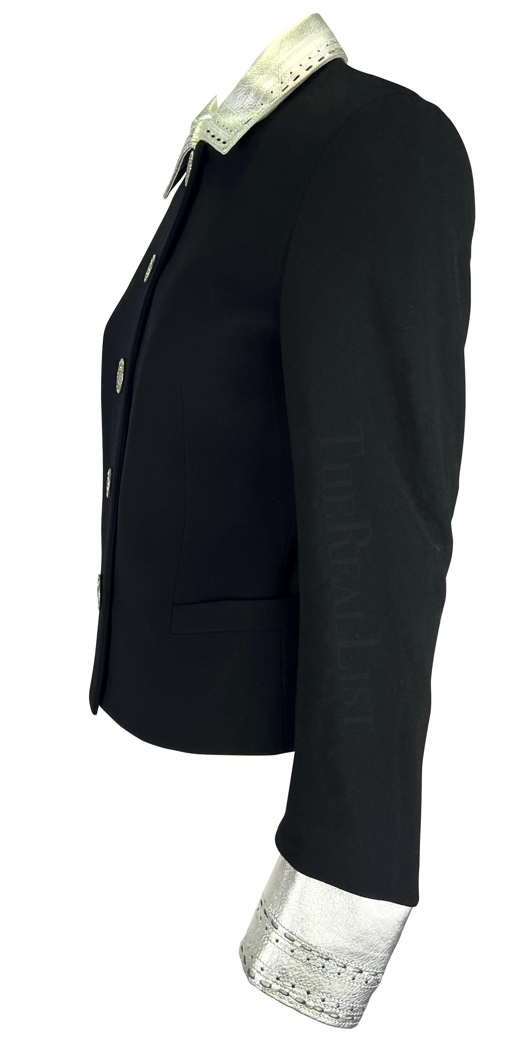 Presenting a black Gianni Versace leather accented jacket, designed by Gianni Versace. From the Fall/Winter 1994 collection, this jacket showcases a perfect fusion of sophistication and edge. The silver-tone rhinestone accented Versace Medusa relief button closure adds a touch of glamour, while the folded collar and cuffs, meticulously crafted using silver-tone metallic leather, lend a modern twist. A statement piece that effortlessly embodies elegance and innovation, this jacket is a true fashion statement for the style-savvy.