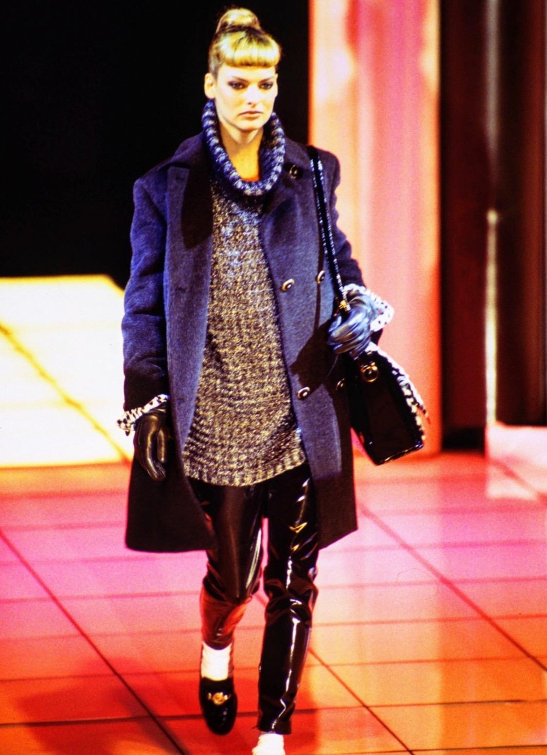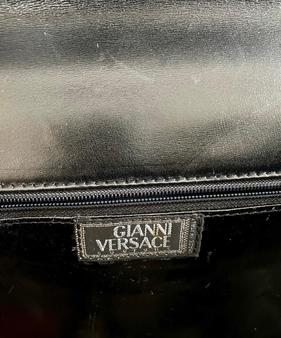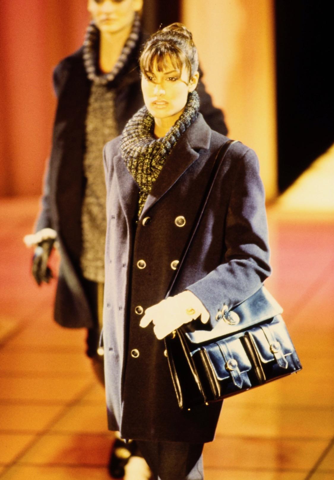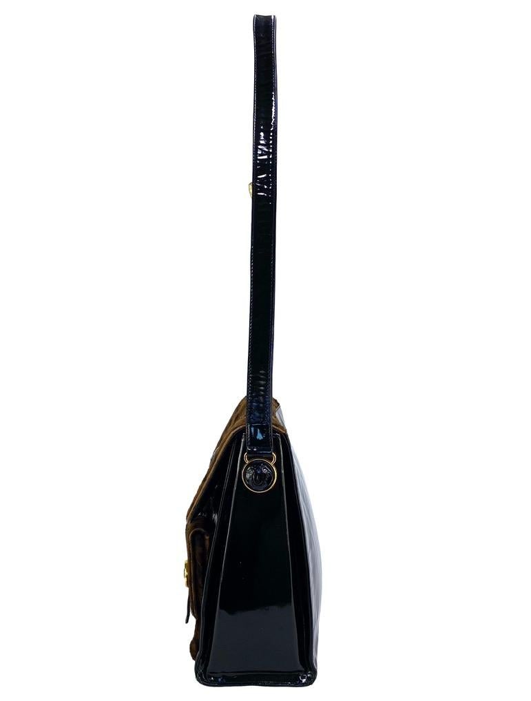Presenting a fantastic Gianni Versace Couture runway bag designed by Gianni Versace. From the Fall/Winter 1994 collection, this bag's black and white version debuted on Look number 25 on Linda Evangelista and the leather version on Look number 24 on Yasmeen Ghuari. This messenger bag is made of patent leather with faux fur leopard pattern flaps and pockets. Perfect as an everyday bag or work messenger, this bag features embossed Medusa leather emblems on the pockets and straps. A fabulous piece of runway history, this messenger is the perfect way to camp up any look.