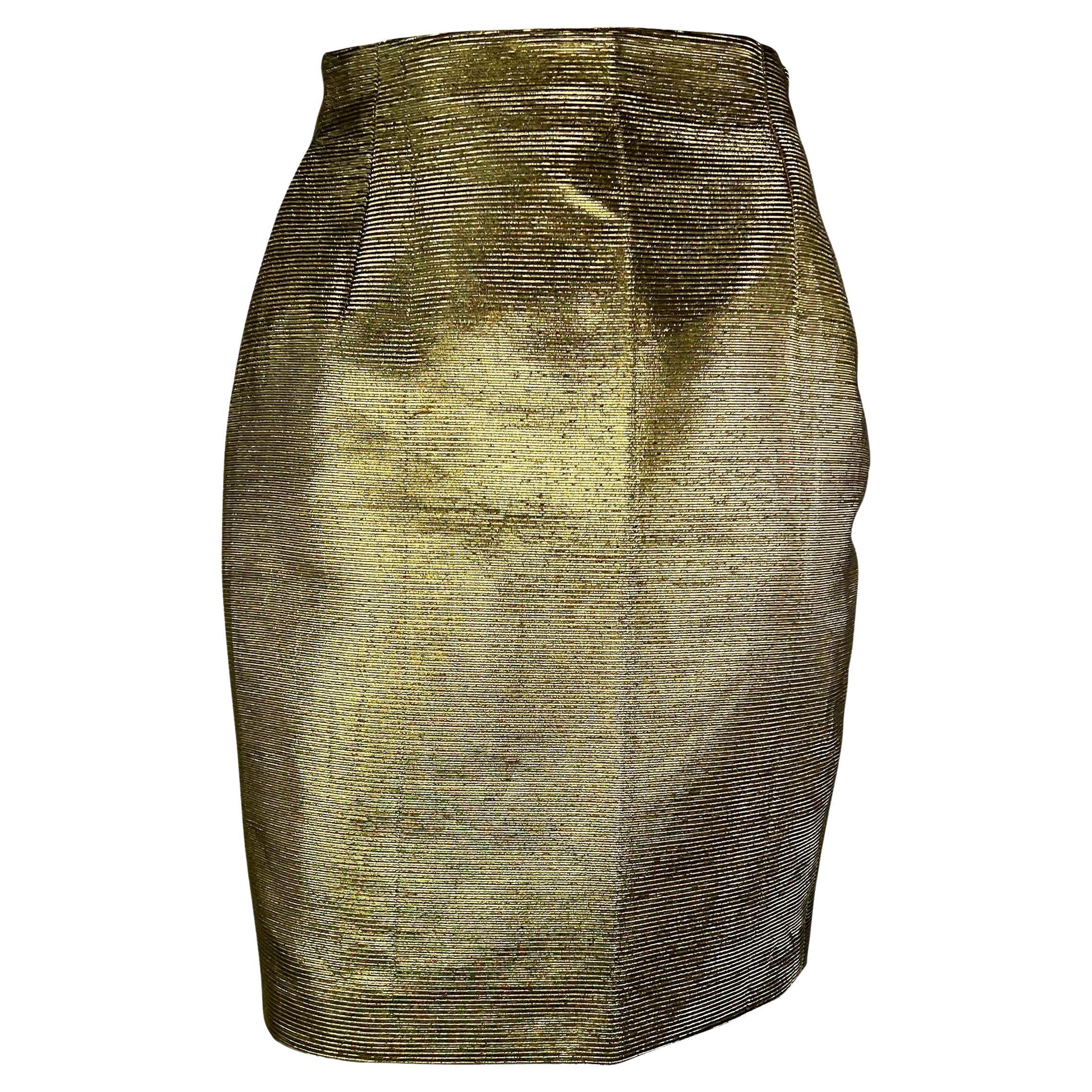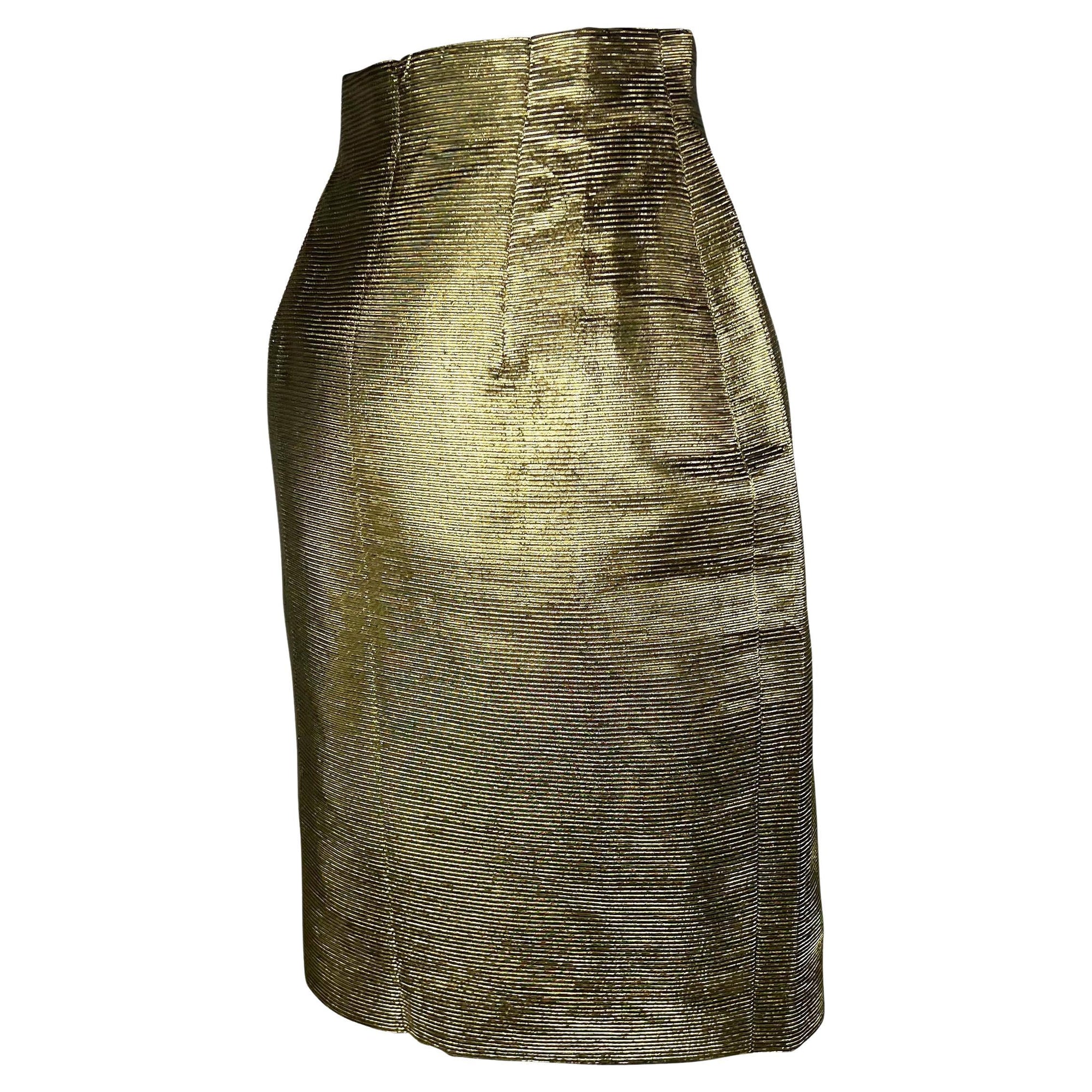Presenting a golden ribbed lurex Gianni Versace Couture skirt set, designed by Gianni Versace. From the Fall/Winter 1994 collection, this two-piece set consists of a high-waisted skirt and matching jacket. The cropped jacket features a collar, two breast pockets, and gold Versace Medusa buttons at the pockets, cuffs, and button-up closure. This stunning set is beautiful when worn together or separate and is the perfect vintage Gianni Versace set to add to any collection or wardrobe!