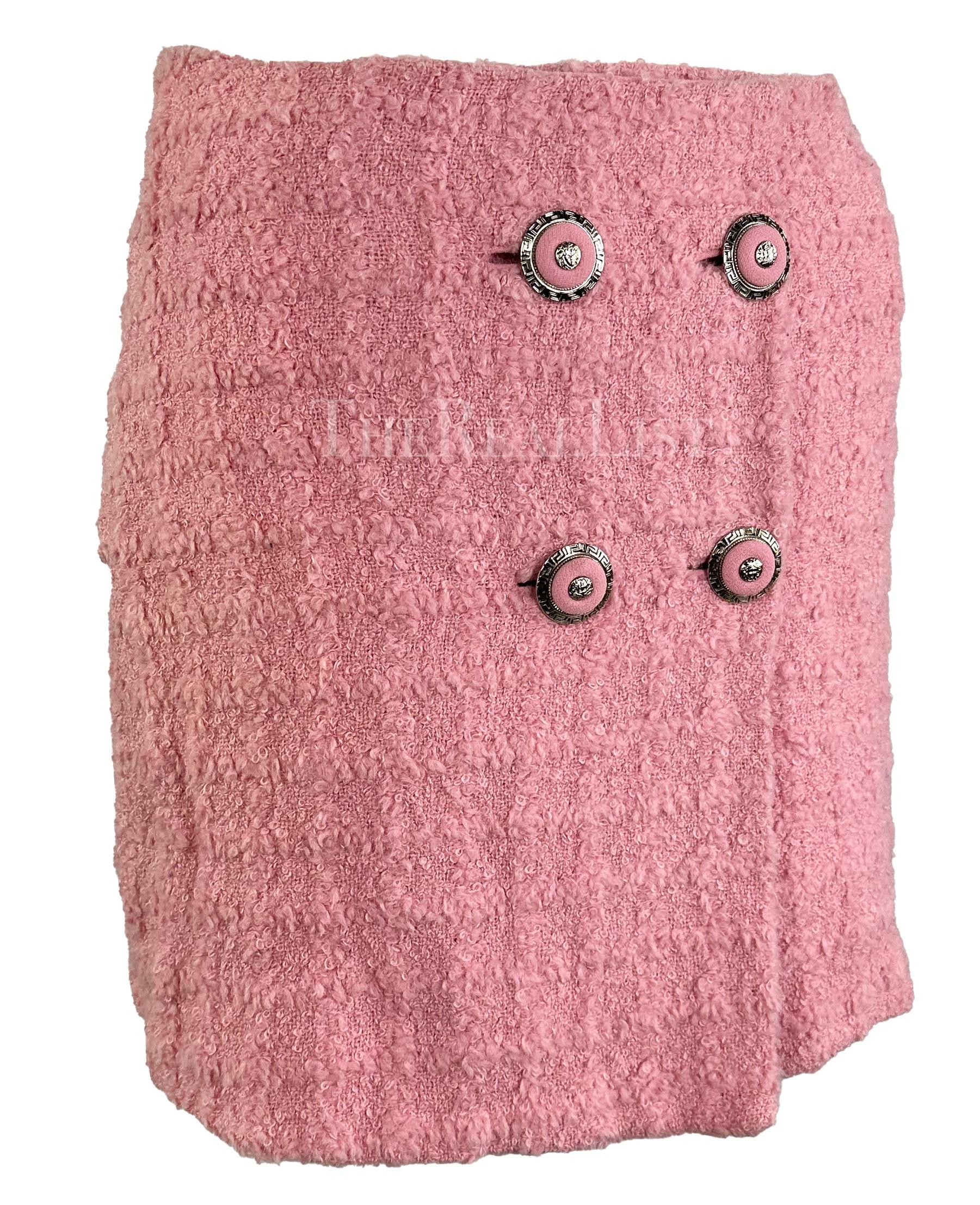 From the Fall/Winter 1994 Gianni Versace collection, this light pink tweed mini skirt debuted on the season's runway as part of look 20, modeled by Linda Evangelista. The skirt was also highlighted in the season's ad campaign, modeled by Claudia Schiffer and captured by Richard Avedon. Constructed entirely of a low pill light pink tweed, this wrap skirt features a double-breasted style closure and is a classic Versace addition to any wardrobe.