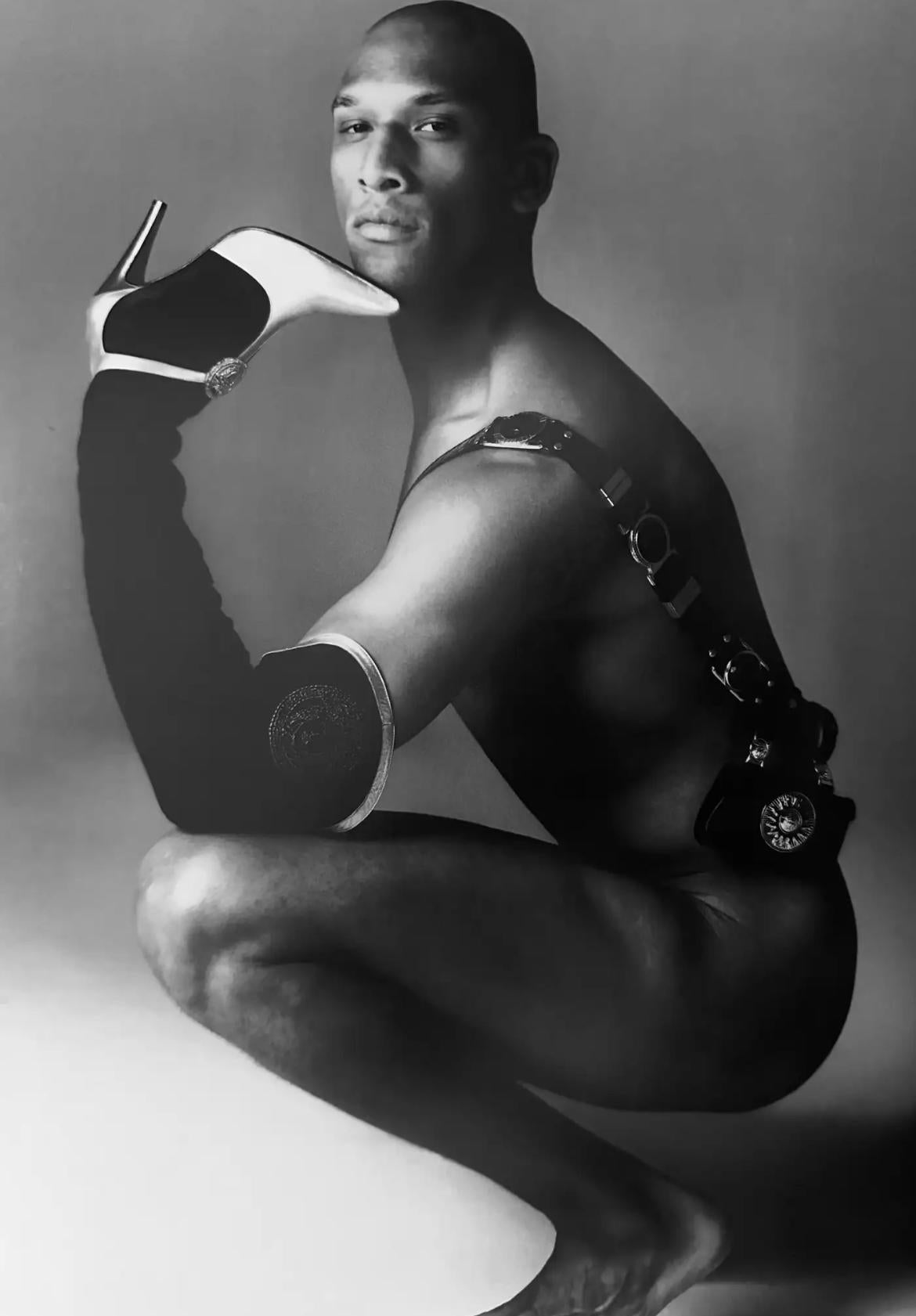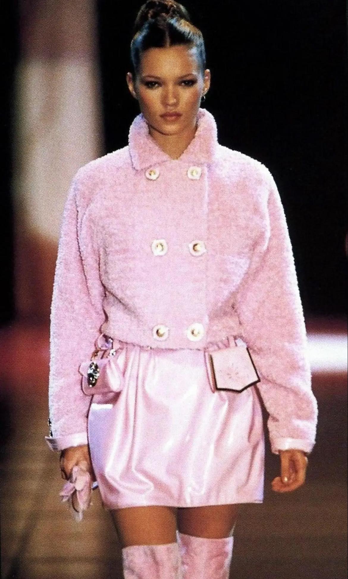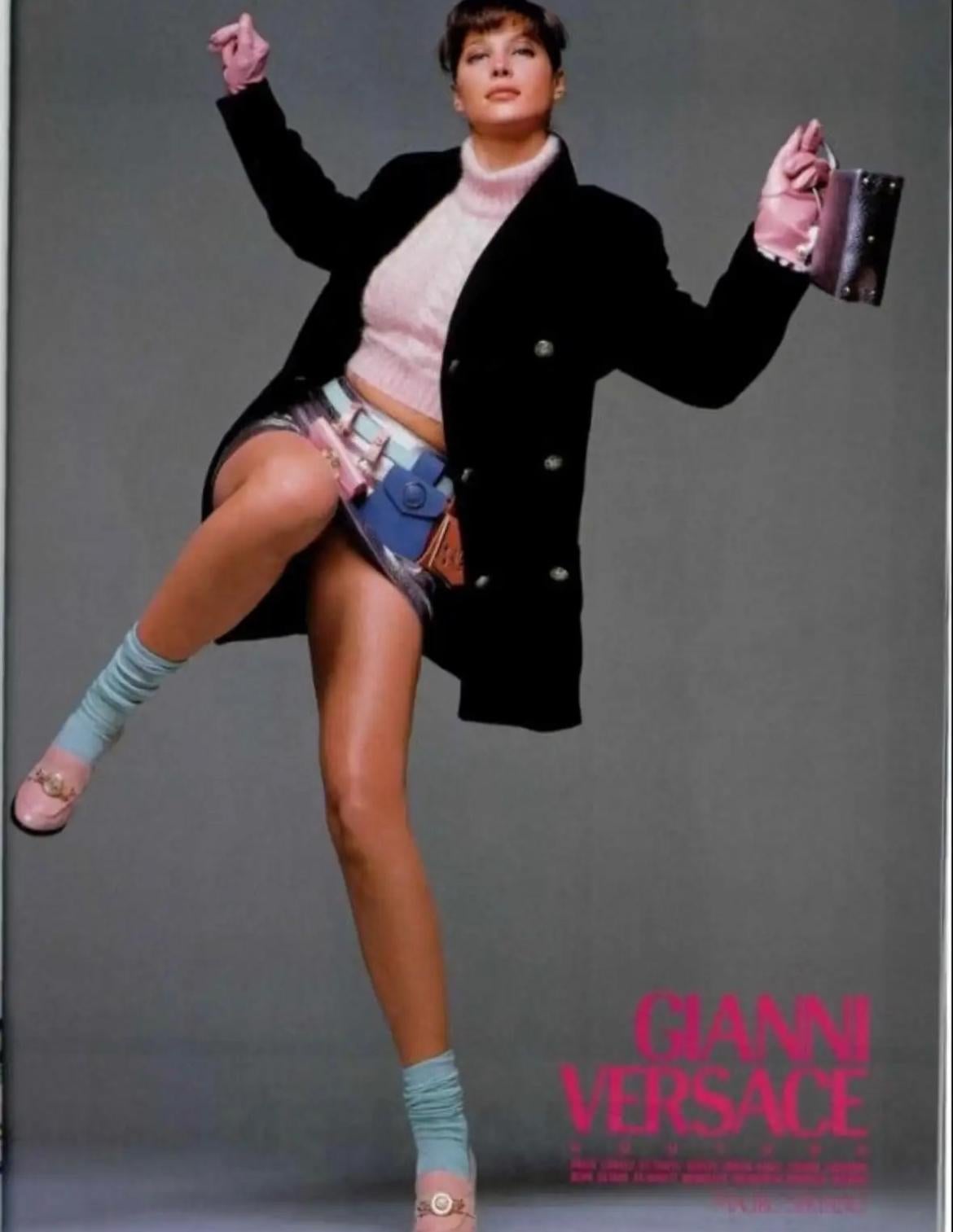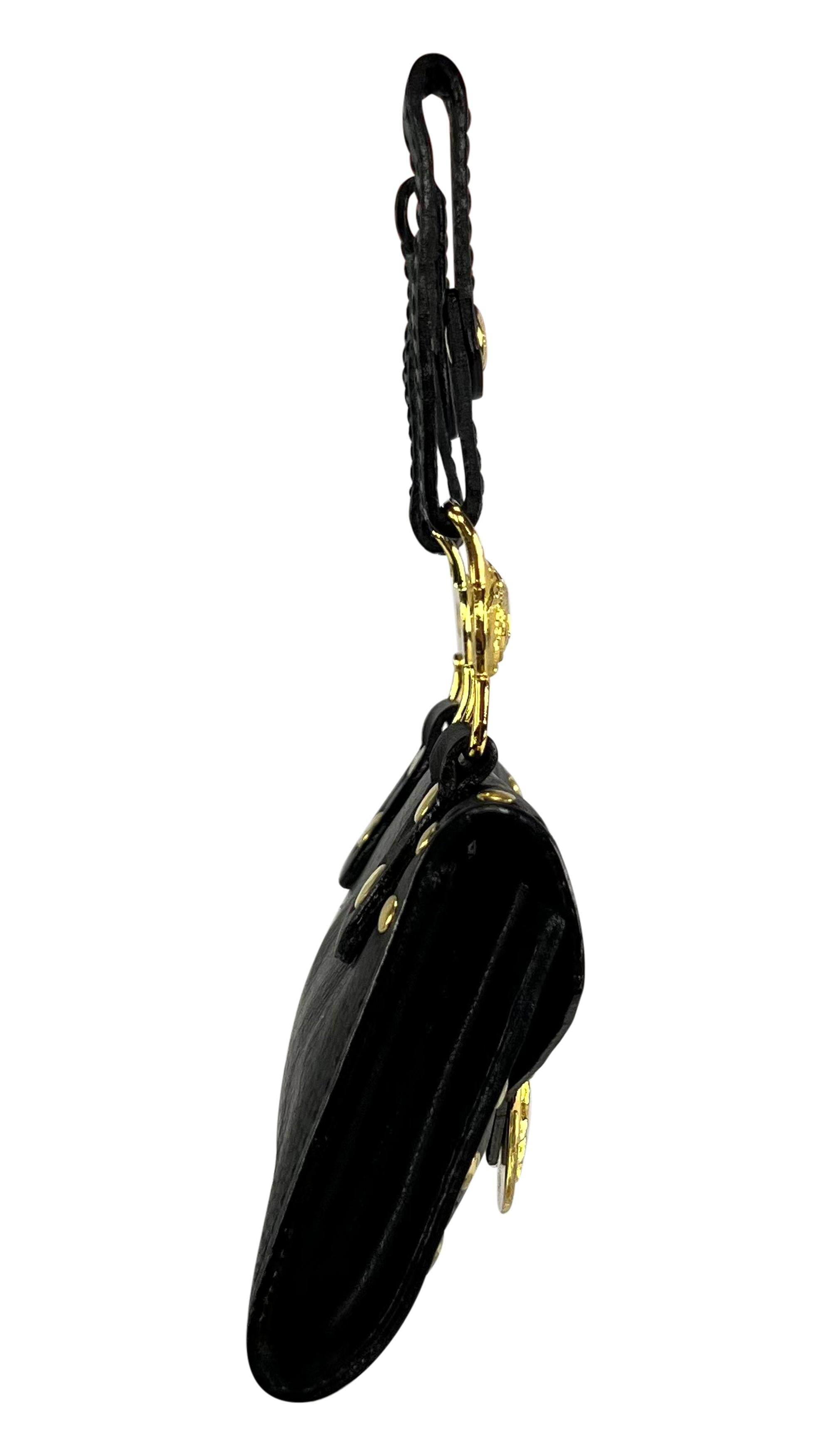 Presenting a fabulous black leather belt bag, designed by Gianni Versace for the Fall/Winter 1994 collection. This stylish mini bag features two belt loops, allowing it to be easily attached to any belt. A variation of this mini bag was showcased on Vladimir McCrary in the season's ad campaign, photographed by Richard Avedon. A pink patent leather version was also featured on the runway, worn by Kate Moss, and appeared in the ad campaign with Stephanie Seymour. The bag is adorned with gold-tone Versace Medusa reliefs, making it a must-have vintage Versace piece!