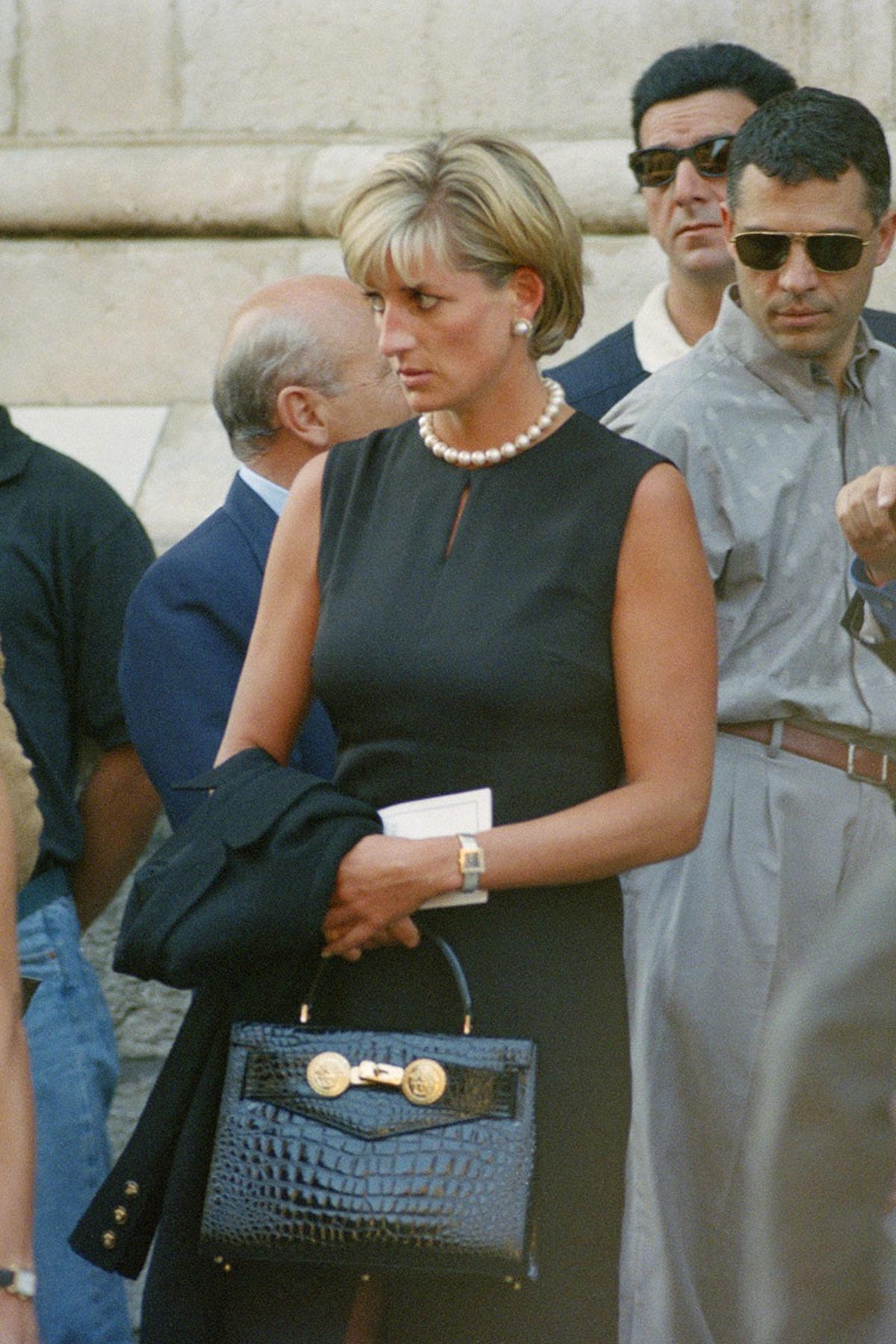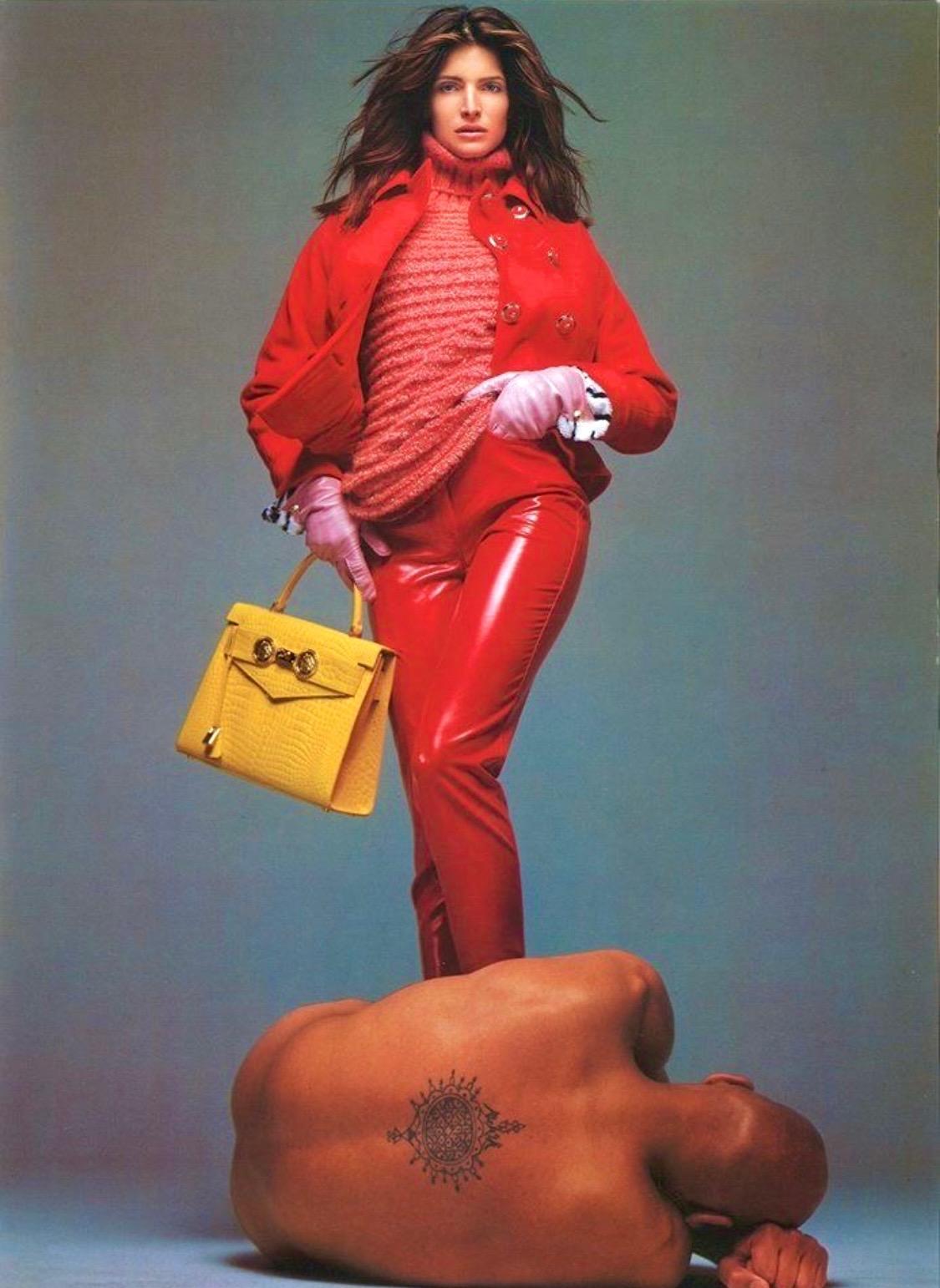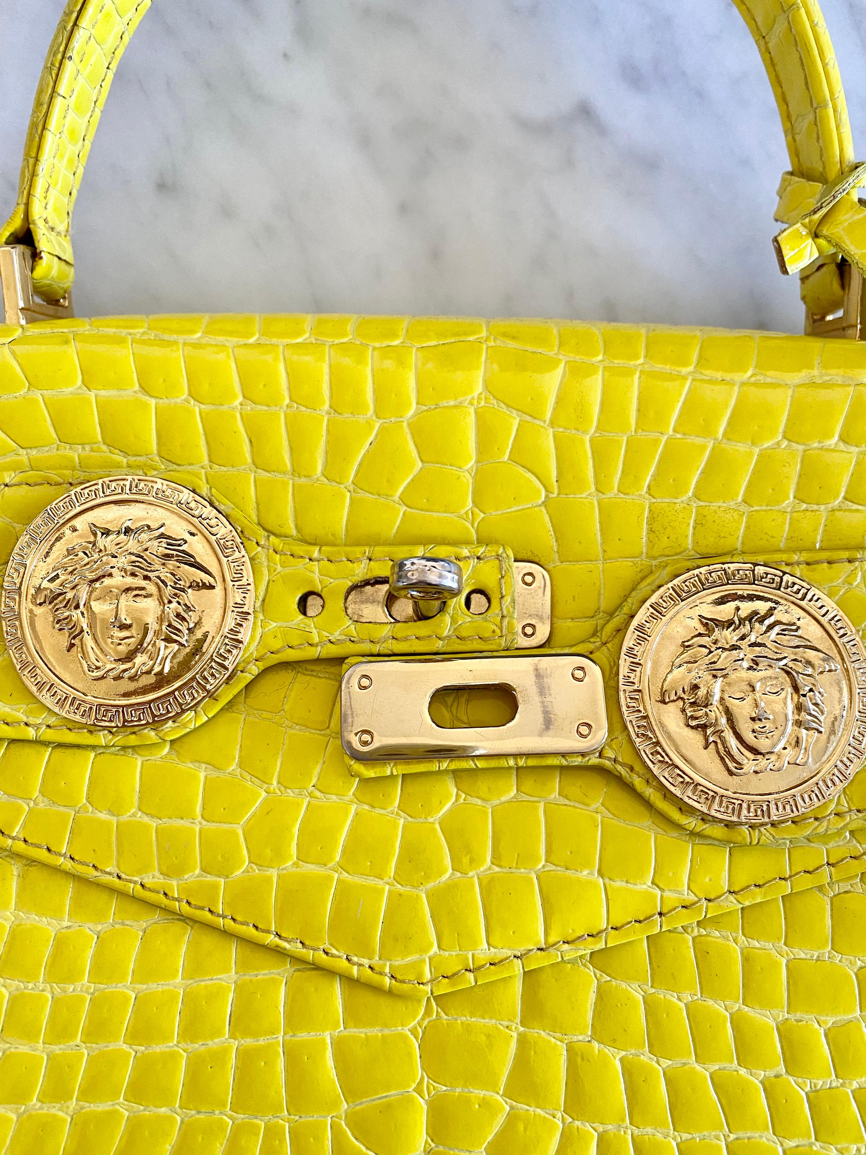 This vintage Gianni Versace Couture bag is designed in the Hermès 'Kelly' style and comprises bright yellow crocodile pattern embossed leather. Designed by Gianni Versace, this bag debuted on look number 38 on Linda Evangelista in the Fall/Winter 1994 runway presentation. Richard Avedon photographed it on Stephanie Seymour for the season's ad campaign. The gold clasps at the front are adorned with Versace Medusa emblems, and these clasps can be shut with a turning mechanism and functioning lock (keys are included with the bag in the pictured keychain). The bag features a single flat top handle; the interior is lined with yellow leather and has one larger pocket. An iteration of this bag was made famous when pictured on Princess Diana. Designed by Gianni Versace and made in Italy.