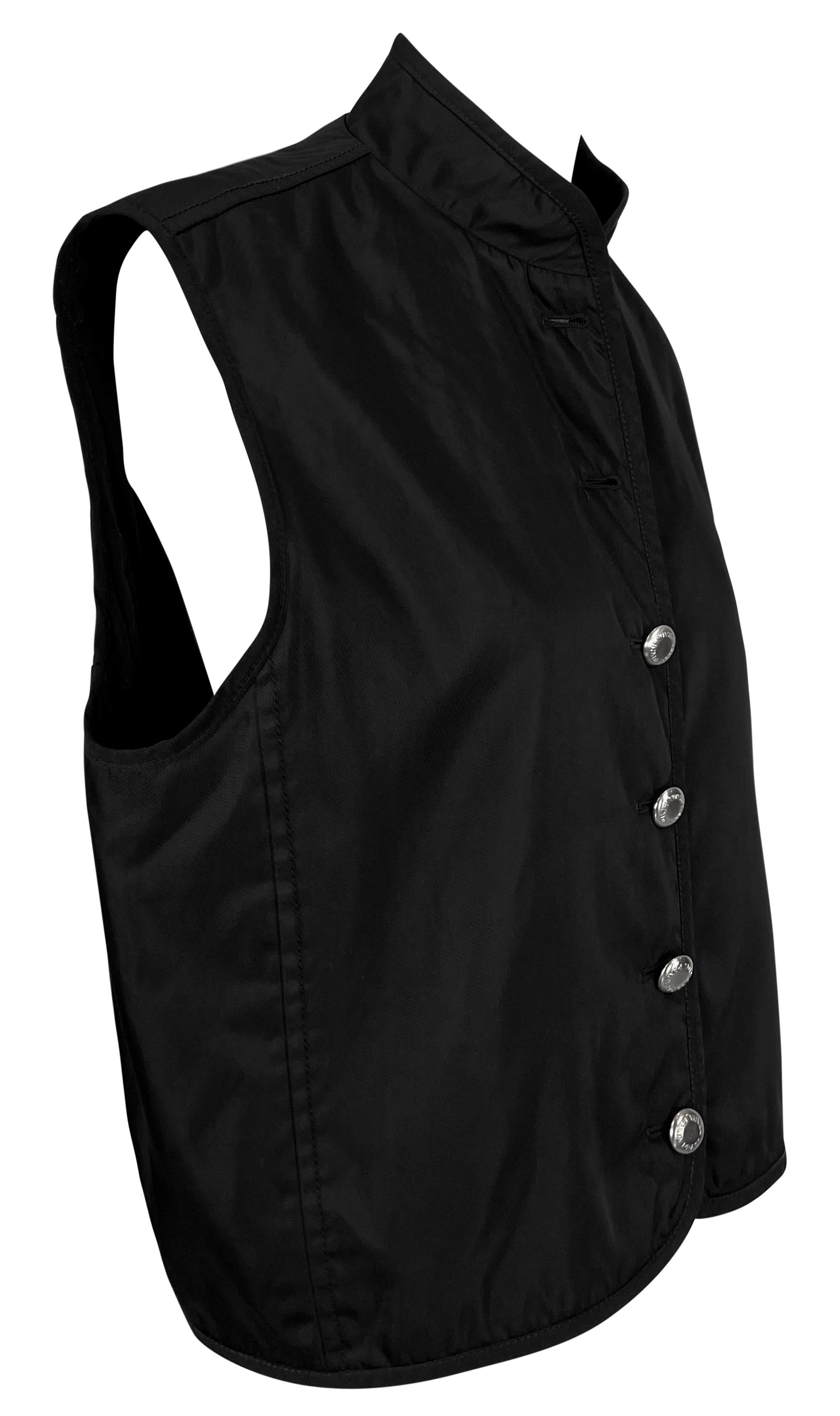 This oversized black nylon Prada vest from the Fall/Winter 1994 collection features a high Nehru-style collar and round, silver-tone button closures. Its minimalist design is enhanced by a boxy, slightly cropped silhouette, giving it a modern, structured appearance.