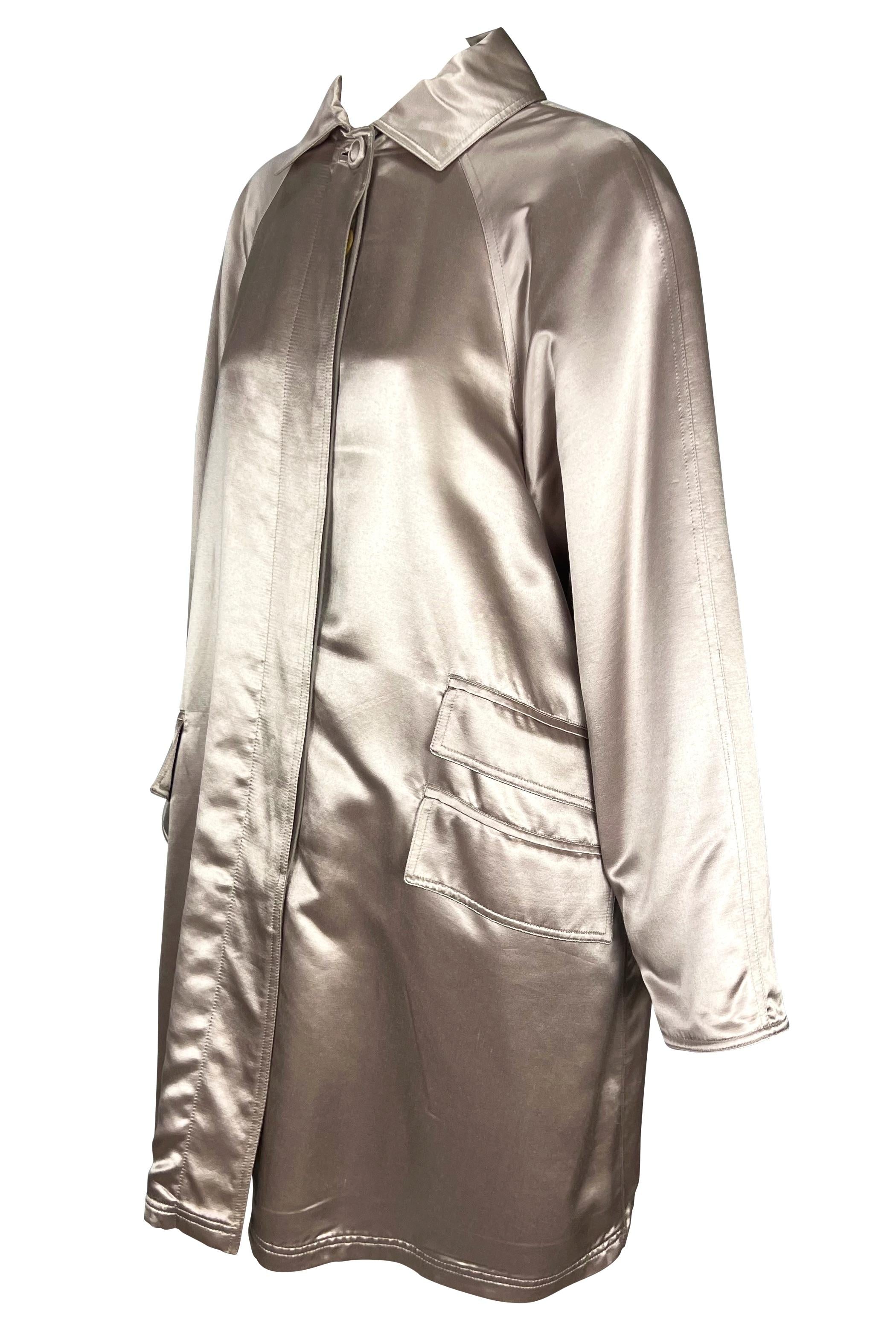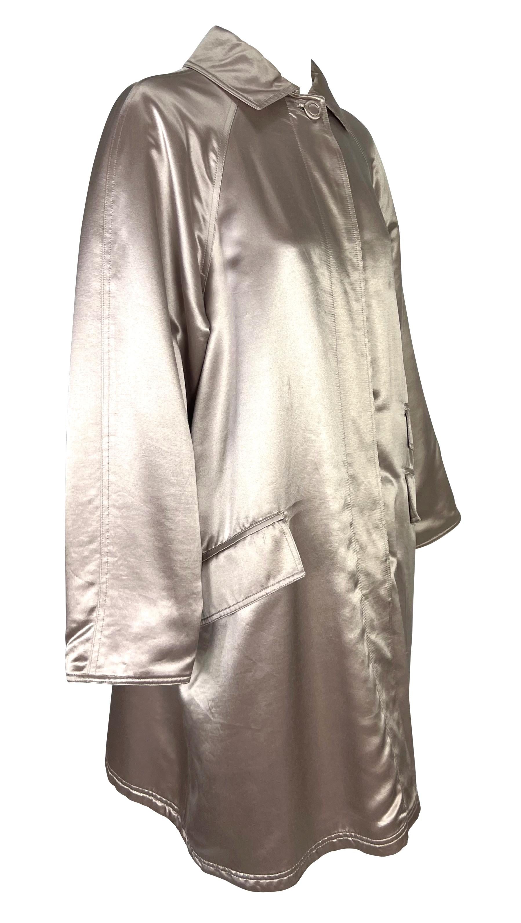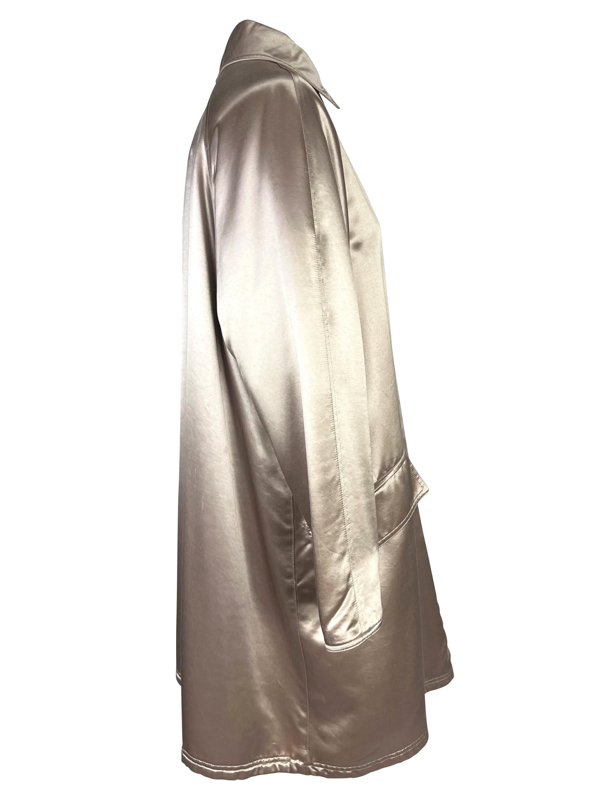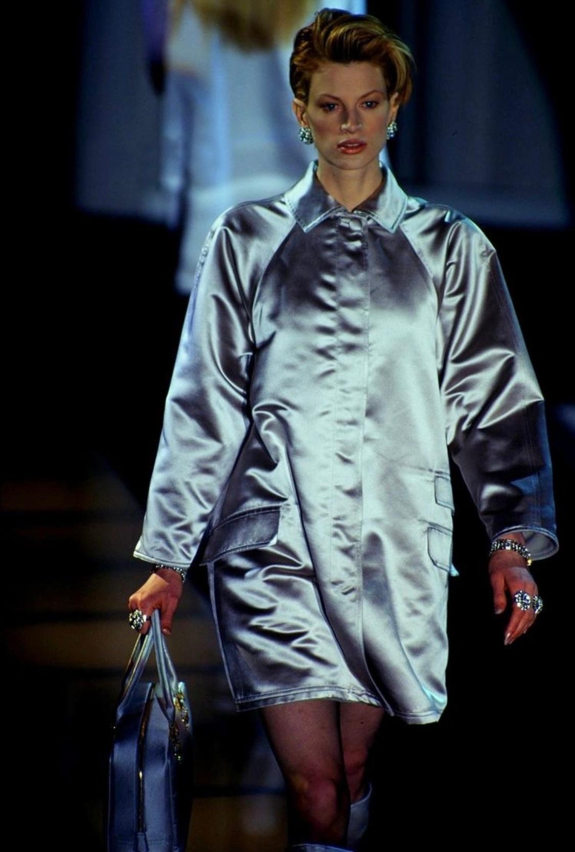 Presenting a stunning silver silk satin Gianni Versace oversized coat designed by Gianni Versace. From the Fall/Winter 1995 collection, this coat debuted as part of Look 44, modeled by Kristen McMenamy. This coat is constructed entirely of shiny satin and is made complete with a collar, hidden button closure, and pockets at the hips. Add this Versace runway gem to your closet!